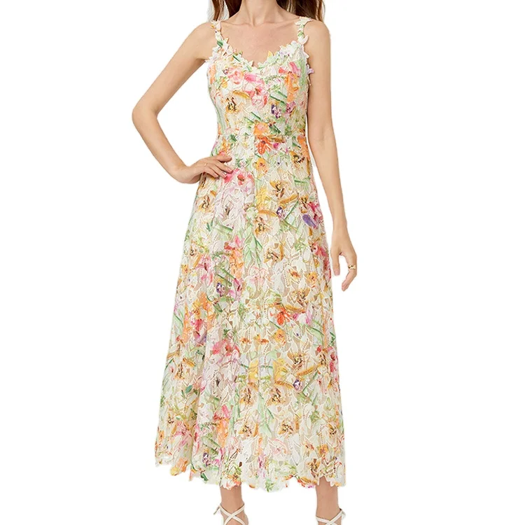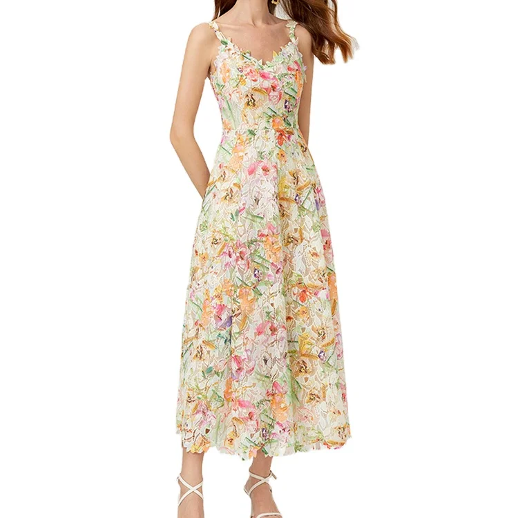 Custom High Quality Summer Causal Colorful Floral Printed Lace A-Line Midi Dress Embroidered Slimming Sweet Casual Party Dress