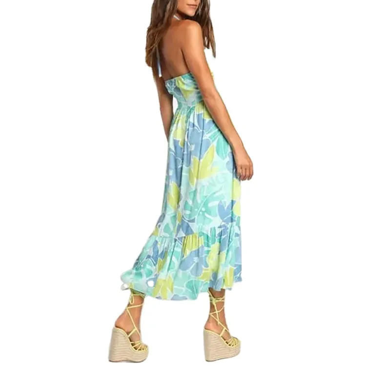 Custom High Quality Summer Causal Dress Sleeveless Polyester Hollow Open Back Floral Skirt Side Split Sling Sexy Midi Dress