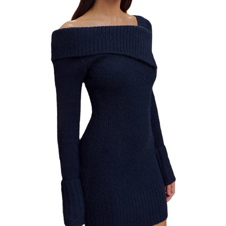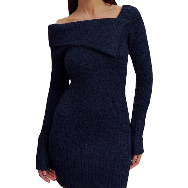 Custom High Quality Elegant Women's One Shoulder Long Sleeve Slim Fit Knitted Bodycon Mini Sweater Dress