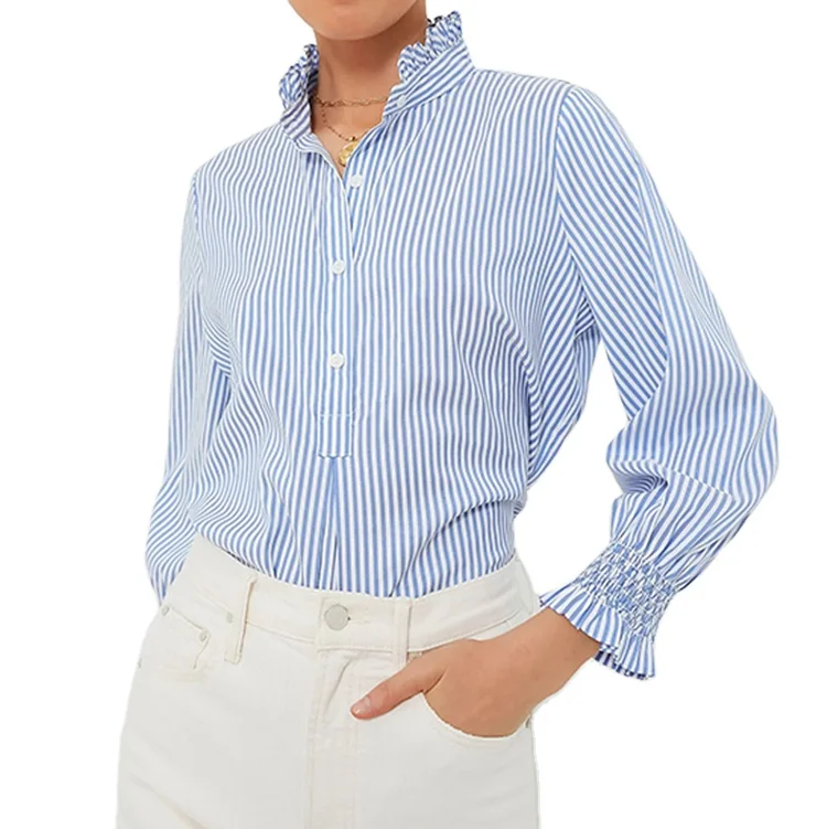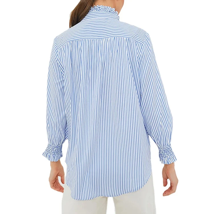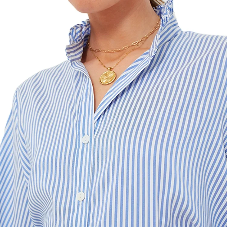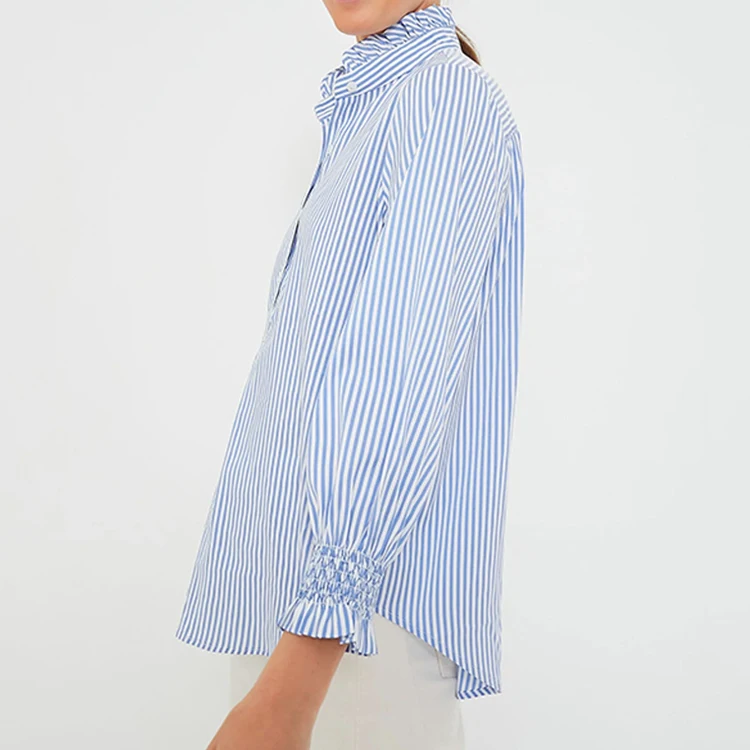 Custom High Quality Blue and White Striped Popover Top Ruffle Collar Three-Quarter Length Sleeves Women's Blouses Shirts
