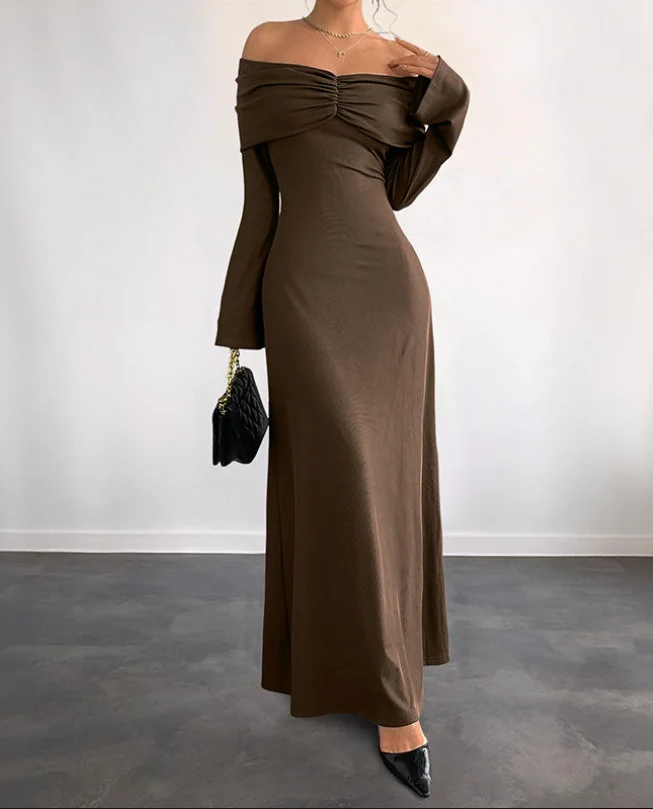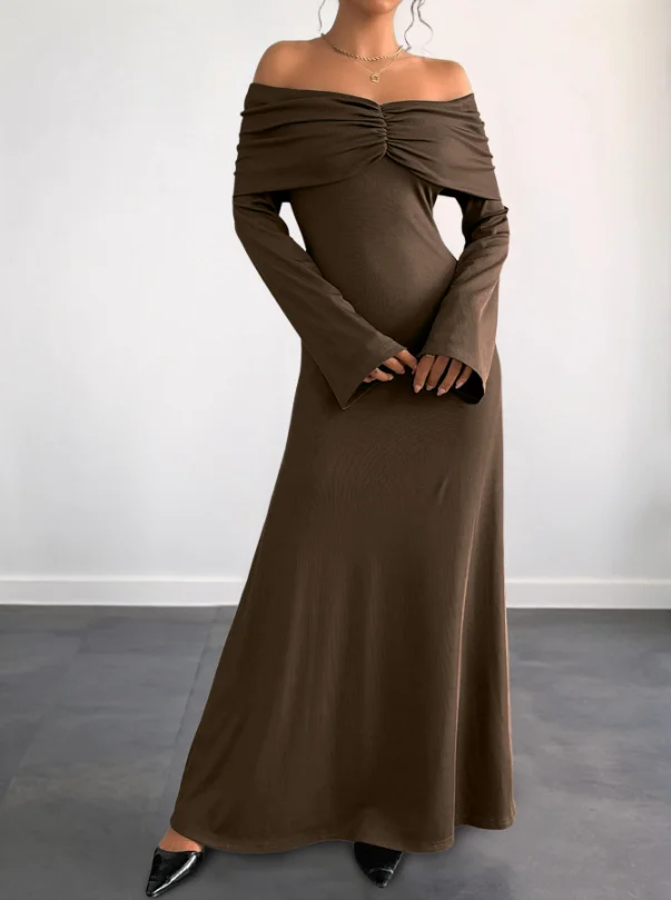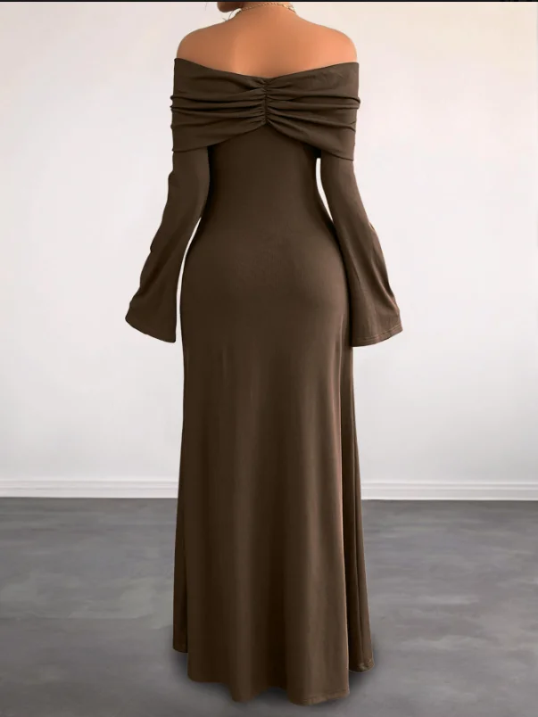 ZYHT 73905 Dusty Rose Off-The-Shoulder Long Sleeve Stretch Jersey Dress Ruched Bodice Floor Length Fish Tail Maxi Dress