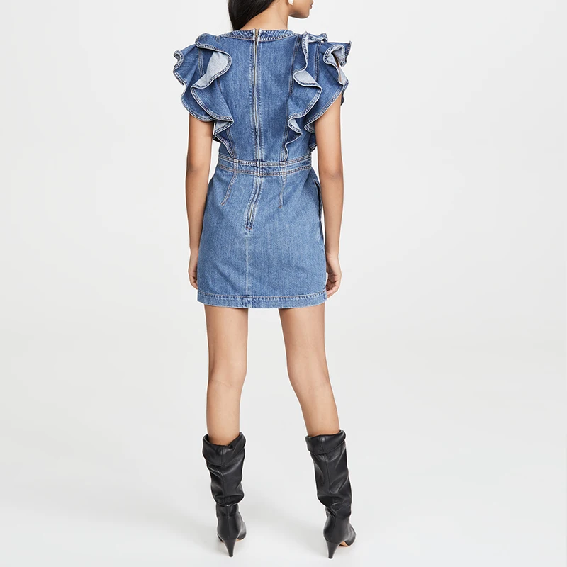 Deep V Neck Denim Wrap Sexy Ruffle Dress Women Summer Casual Dresses