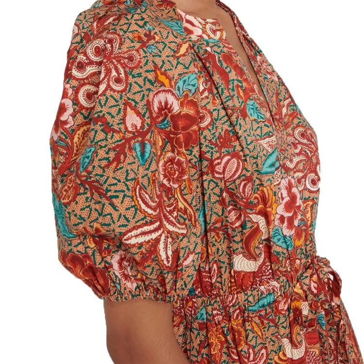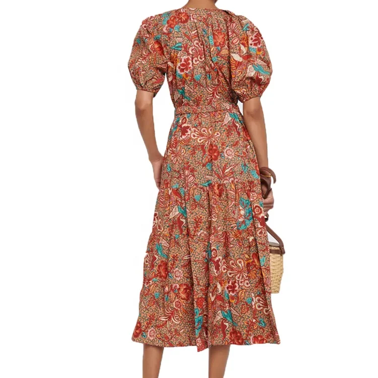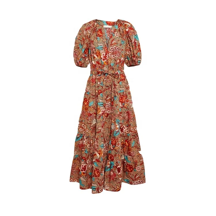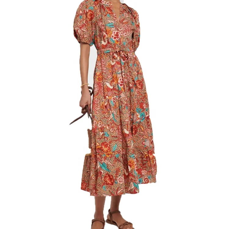 Factory Customized Wholesale Summer Customized New V-neck Printed Cotton Mid Length Dress Paired with Large Swing Dress