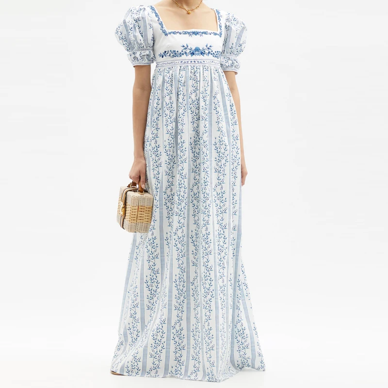 Embroidered floor mopping with square collar and bubble sleeves plus-size autumn and summer evening dress woman