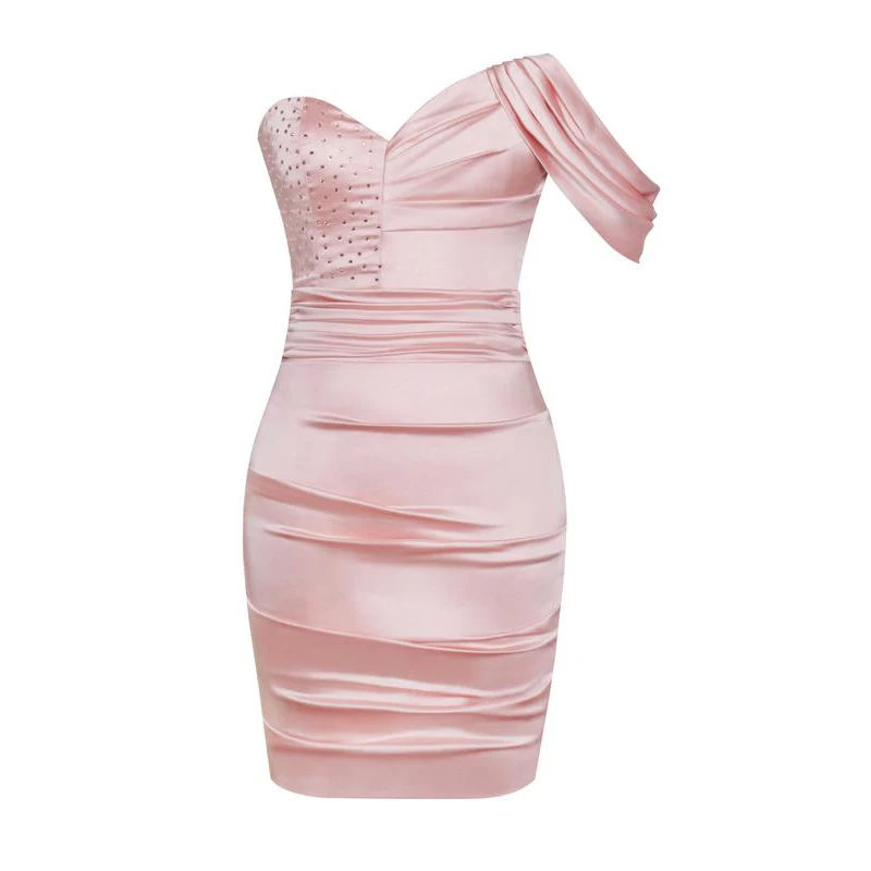 ZYHT 73903 Gemstone Crystal 3D Flower Decoration Ruched One Shoulder High Slit Long Sleeve Maxi Simple Elegant Evening Dress