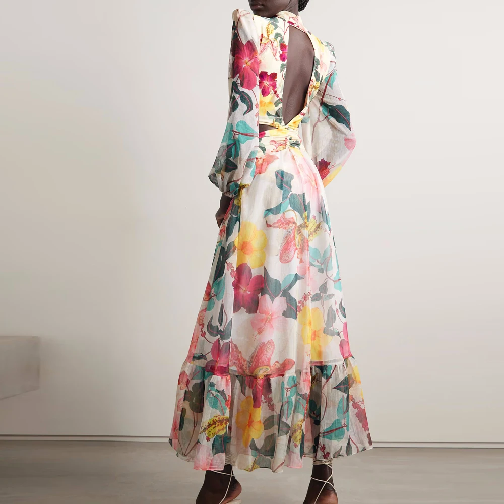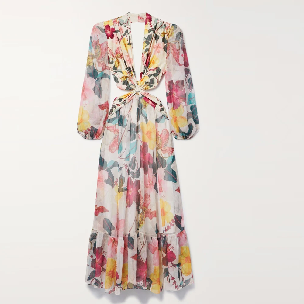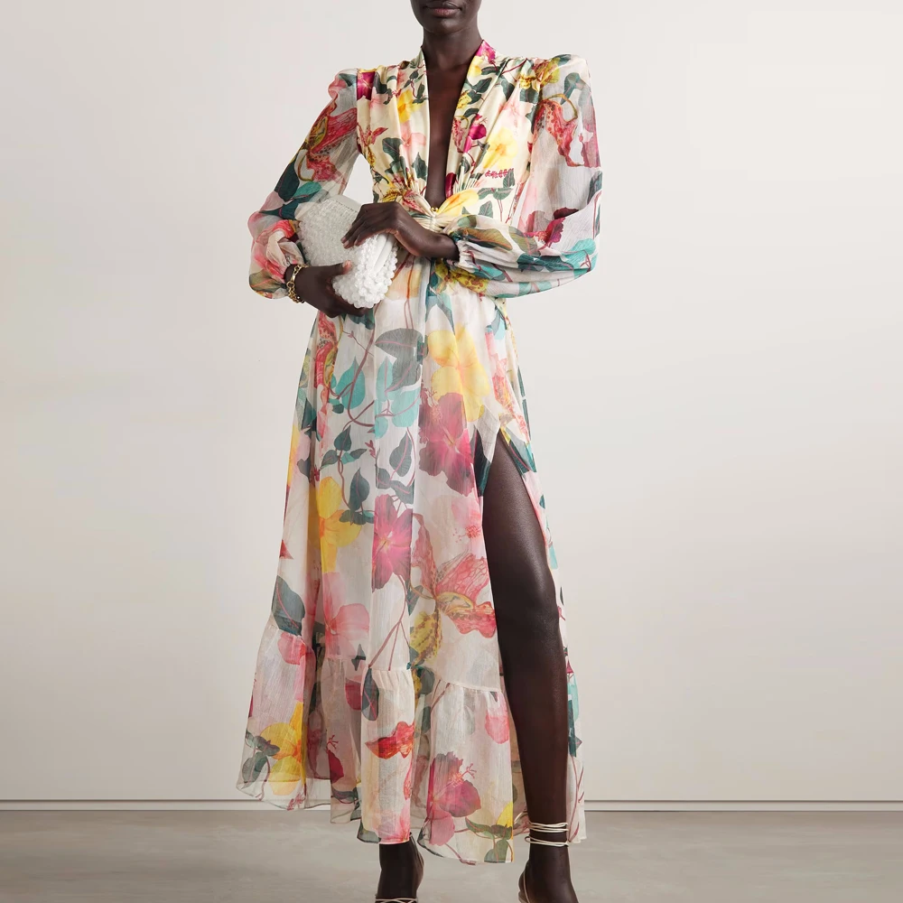 Wholesale Elegant Cutout Floral-print Summer Dresses Women Chiffon Stretch-jersey Maxi Dress Beach Dress