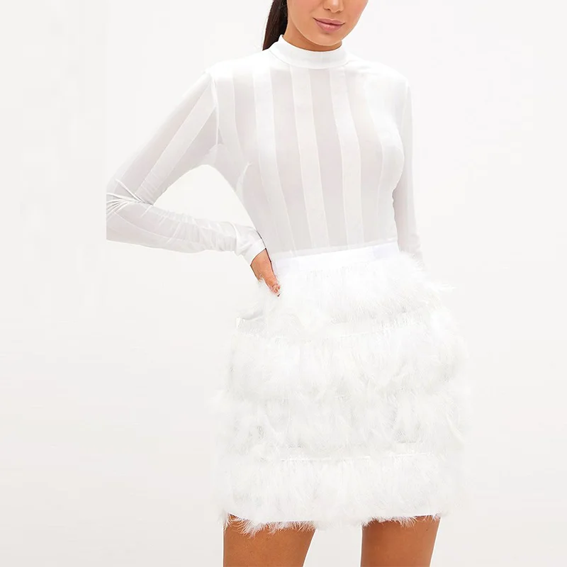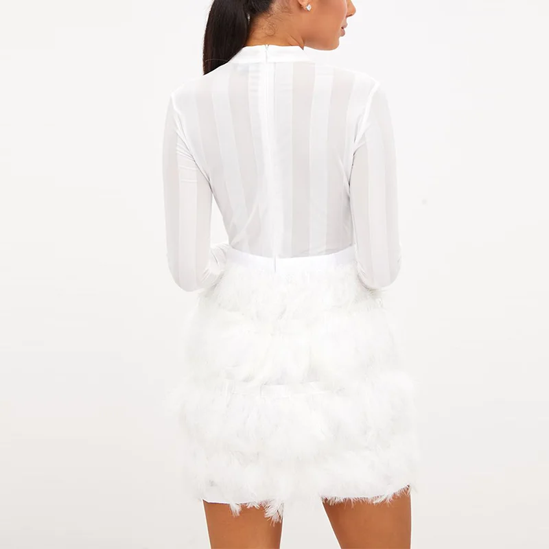 Sexy Sheer Long Sleeve Feather Skirt Mini Bodycon Party Dress Ladies