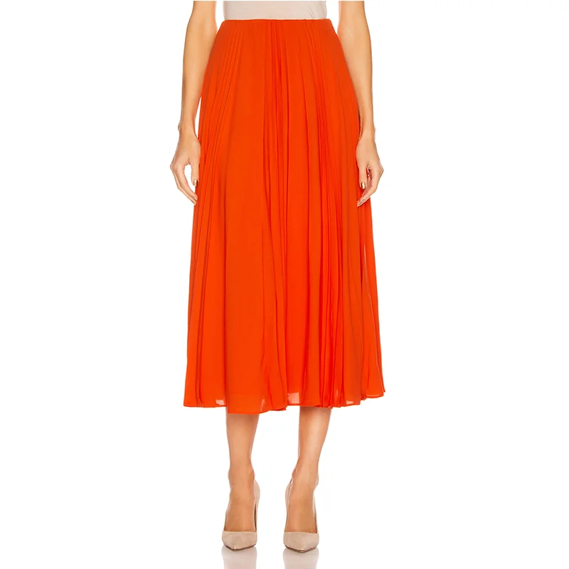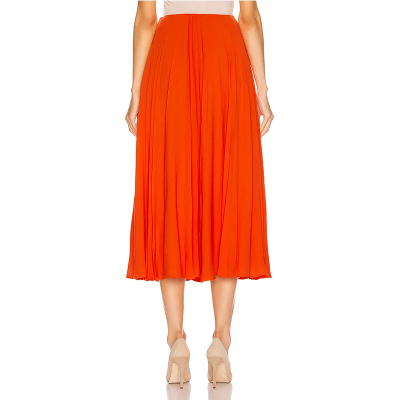 New Fashion Spring Orange Solid Chiffon a Line Pleated Midi Skirt Women