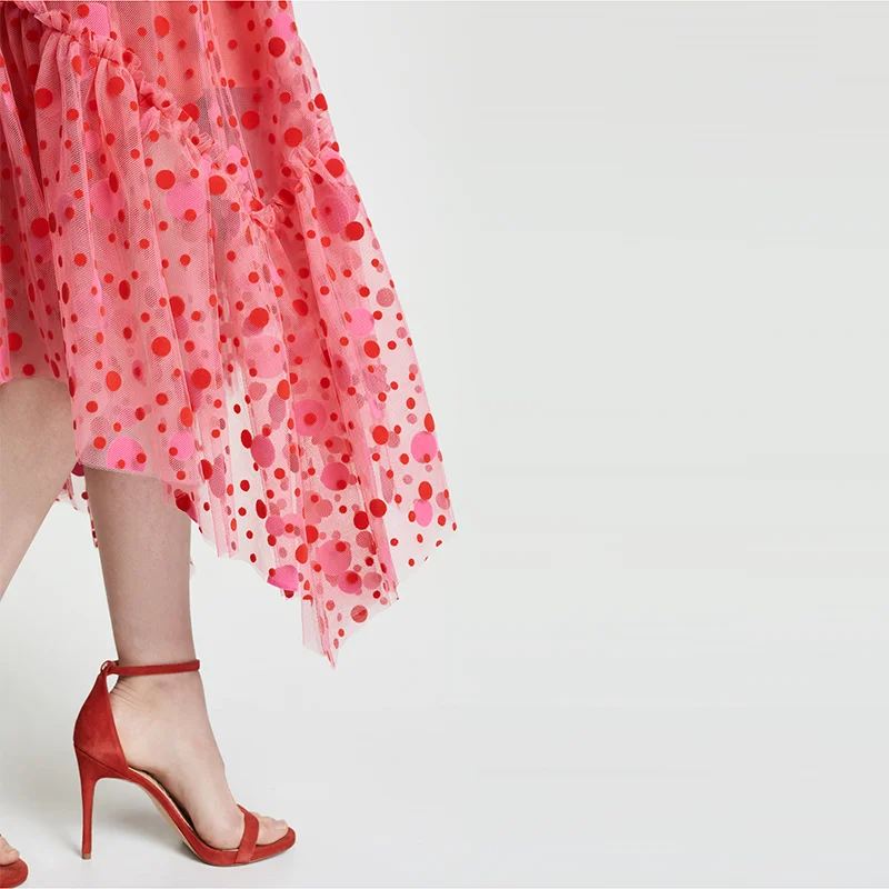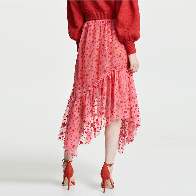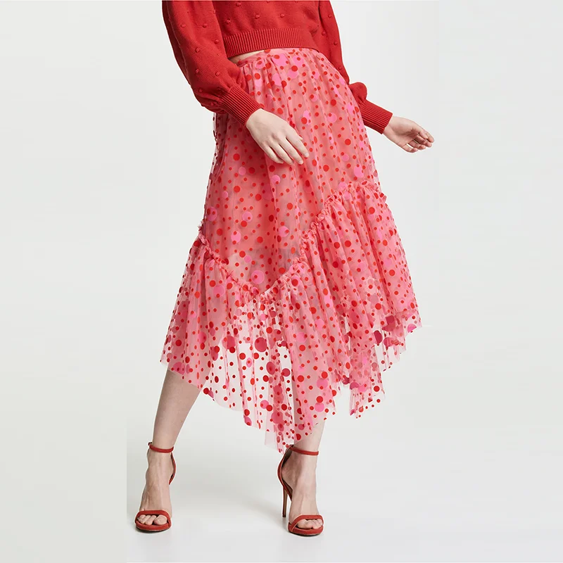Sweet Sheer Velvet Flocking Mesh Tulle Red Dot Asymmetrical Ruffled Skirt Women Daily Wear Girl