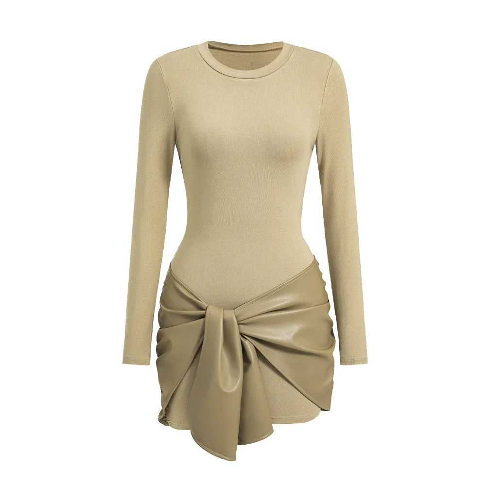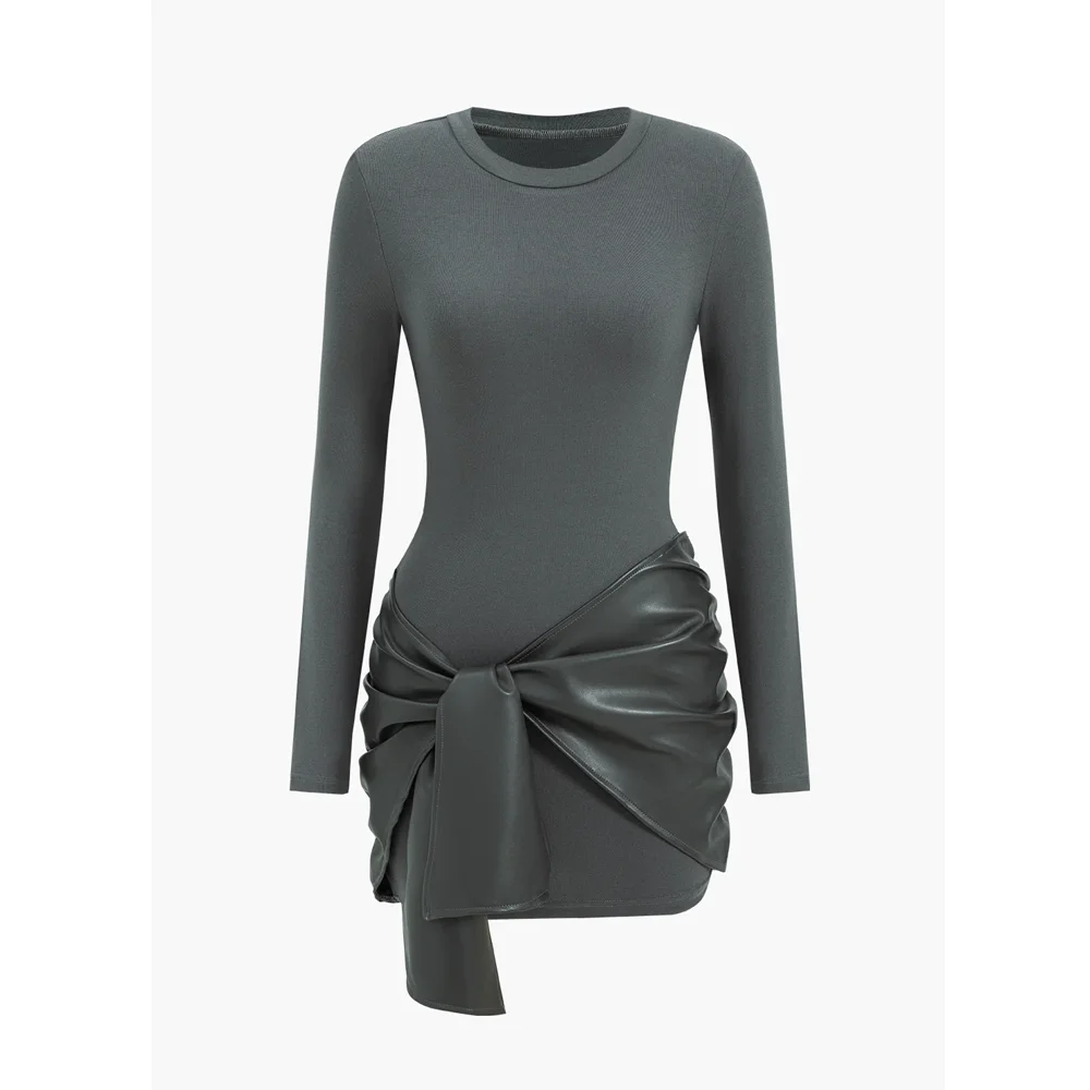 Wholesale High Quality Solid Color Women Casual Elegant Dress Faux Leather Patchwork Tie Front Round Neck Ruched Mini Dress