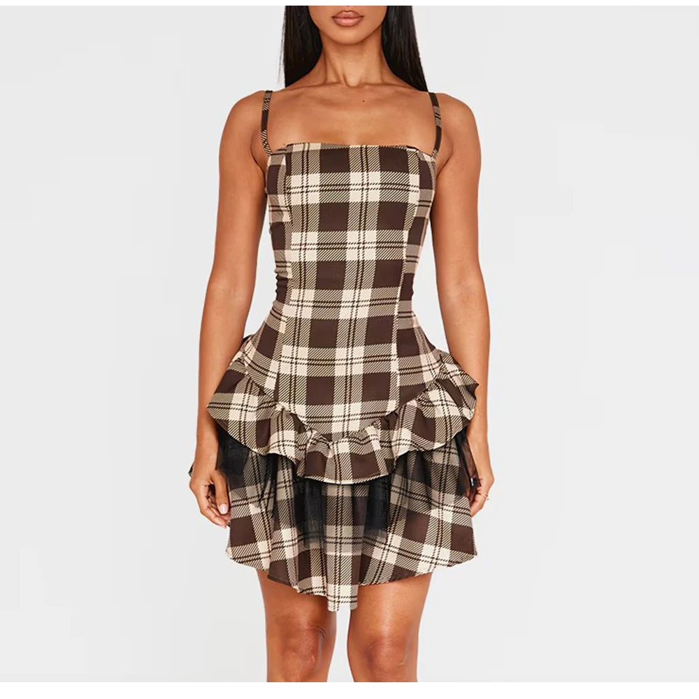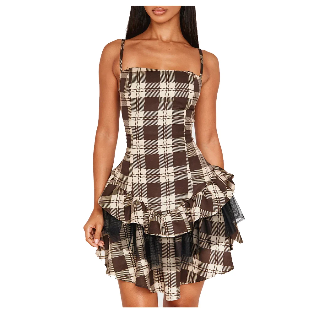 Wholesale Women Petite Brown Check Strappy Mini Dress Backless Spaghetti Shoulder Strap Plaid Party Dress