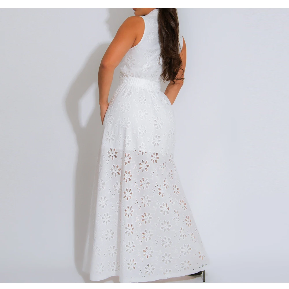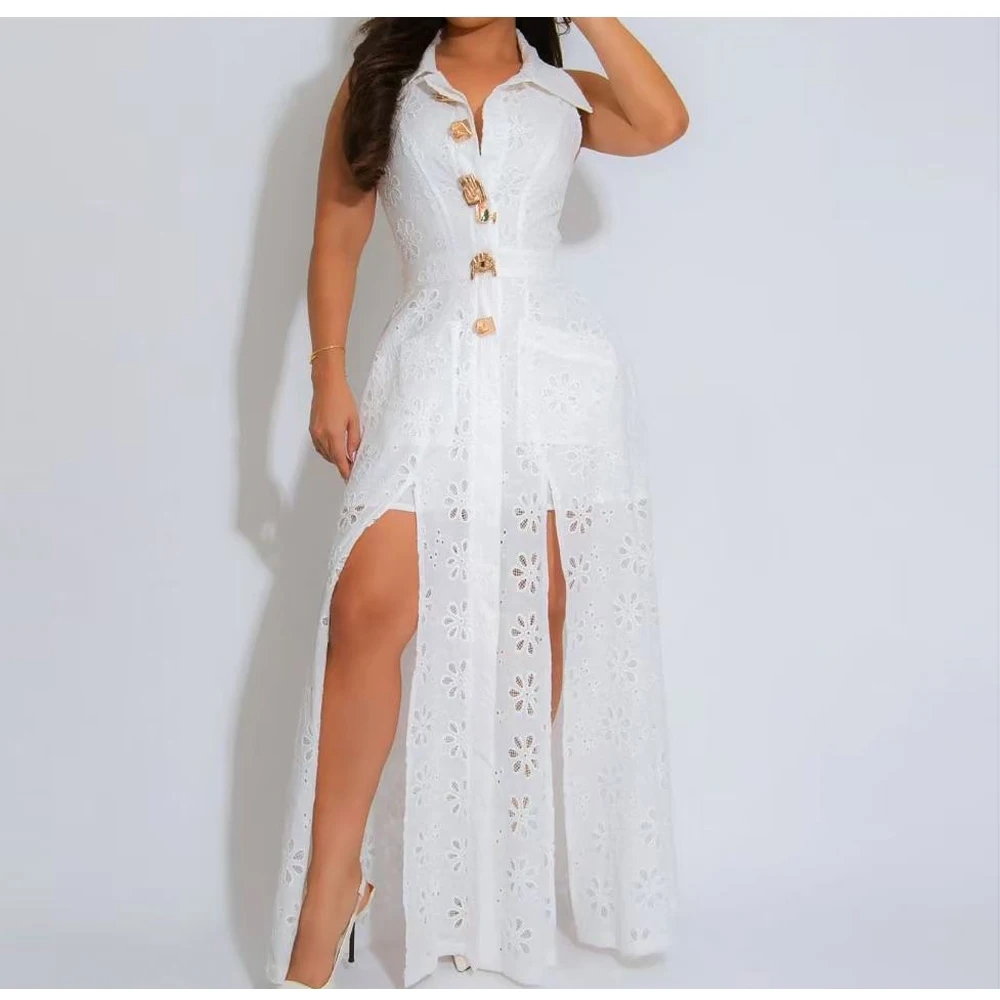 Custom High Quality Sleeveless White Women Dress Button Closure Cotton Embroidery Midi Dress Hot Sale Summer Beach Dress