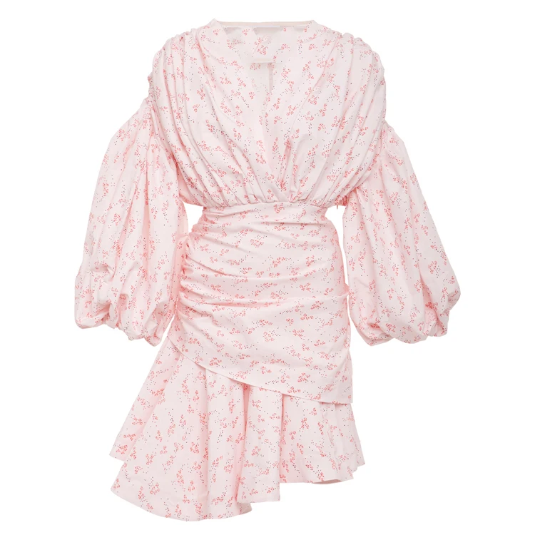 Girl Print Dress Puff Sleeve Asymmetrical Hem Waist Women Wrap Dress