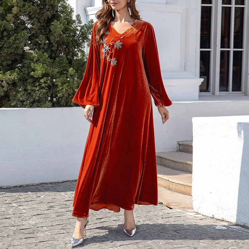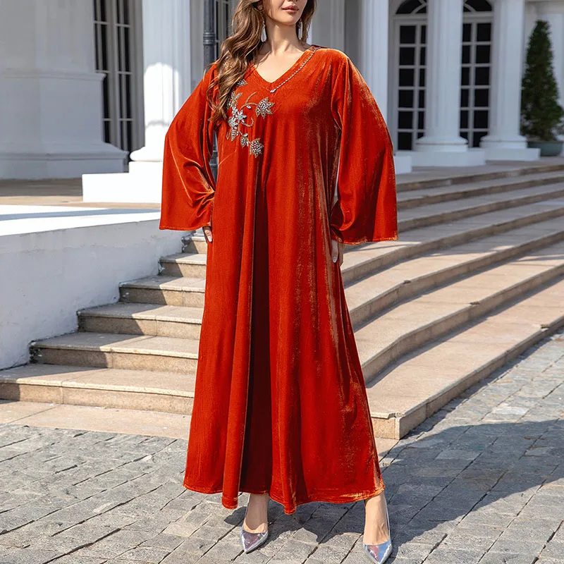 Wholesale New Iraqi Autumn and Winter Muslim Dresses Women's Luxury Diamond Robe Red Long Dress