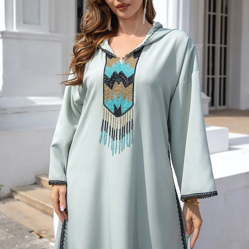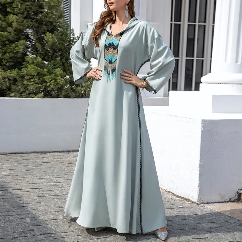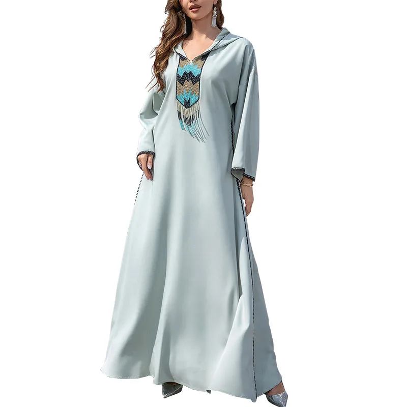Middle Eastern Maxi Dress Round Neck Long Sleeve Prayer Muslim Embroidery Lace-up Hooded Dress