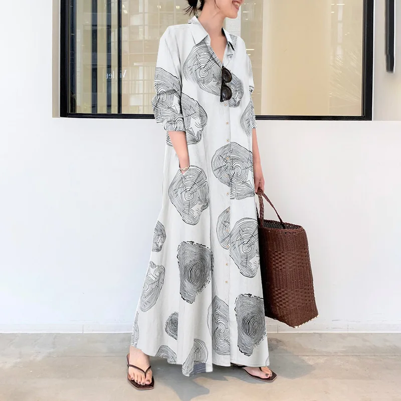 Women's Spring New Cotton and Hemp Print Long Edition Abaya Muslim Plus-size Loose Casual Retro Long Sleeve Dress