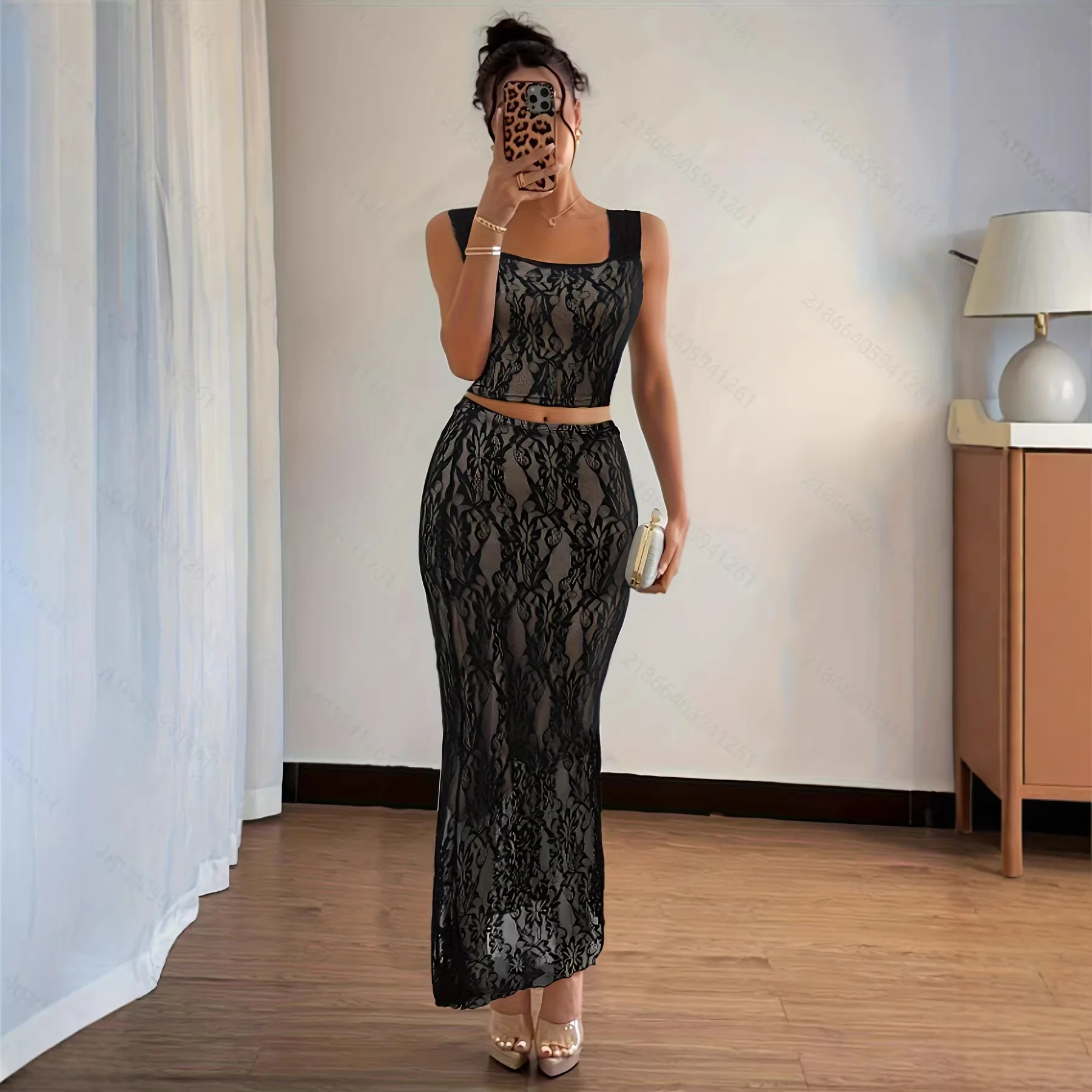 Women's Clothing Supplier Ladies' Summer Clothing Lace square Neckline Strapless Backless Split Long Dress Women's Set