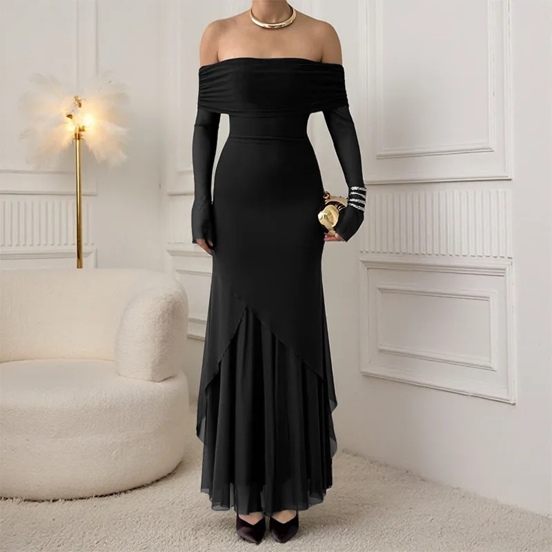 New Women's Formal Evening Gown Lace-up Splicing One-shoulder Long-sleeved Elegant Women's Evening Dress Women's Party Dress