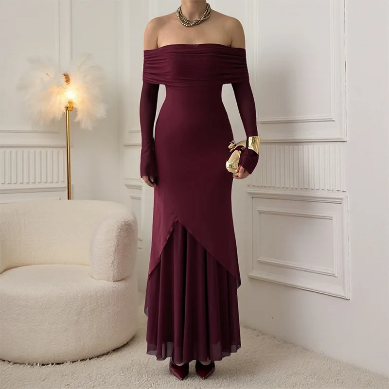 ZYHT 73905 Dusty Rose Off-The-Shoulder Long Sleeve Stretch Jersey Dress Ruched Bodice Floor Length Fish Tail Maxi Dress