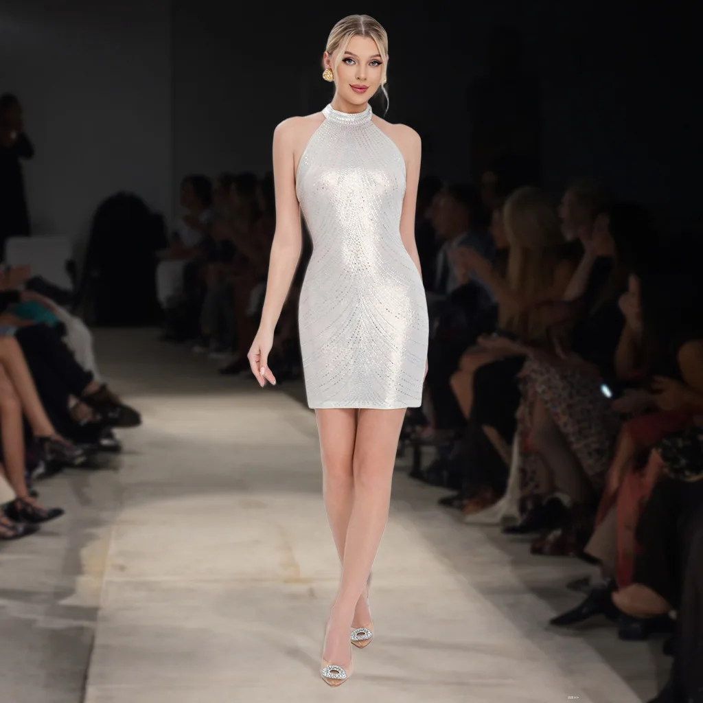 New Women's Clothing Neck-Hanging Back-Exposing Short Skirt with Rhinestones Sexy Evening Gown for Ladies Party Dress for Women