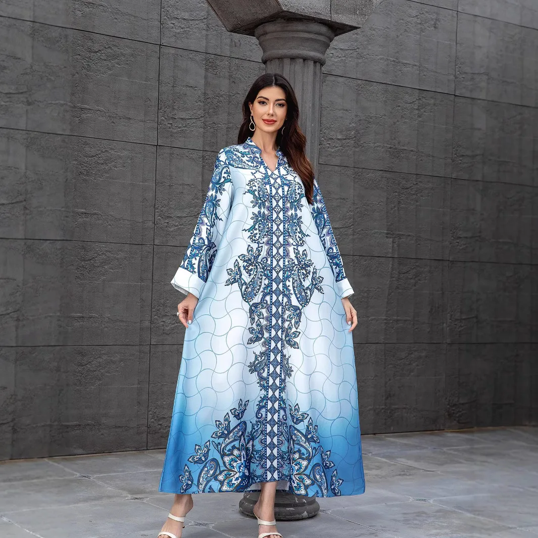Clothing Manufacturer Wholesale Women's Fashion Printed V-neck Loose Ladies Dress Beaded Rhinestone Muslim Long Robe