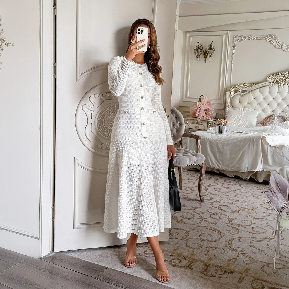Custom Women's Clothing - Autumn Ladies' Dress Fashionable Button Crew-Neck Long-Sleeve Ribbed Knit Casual Dress