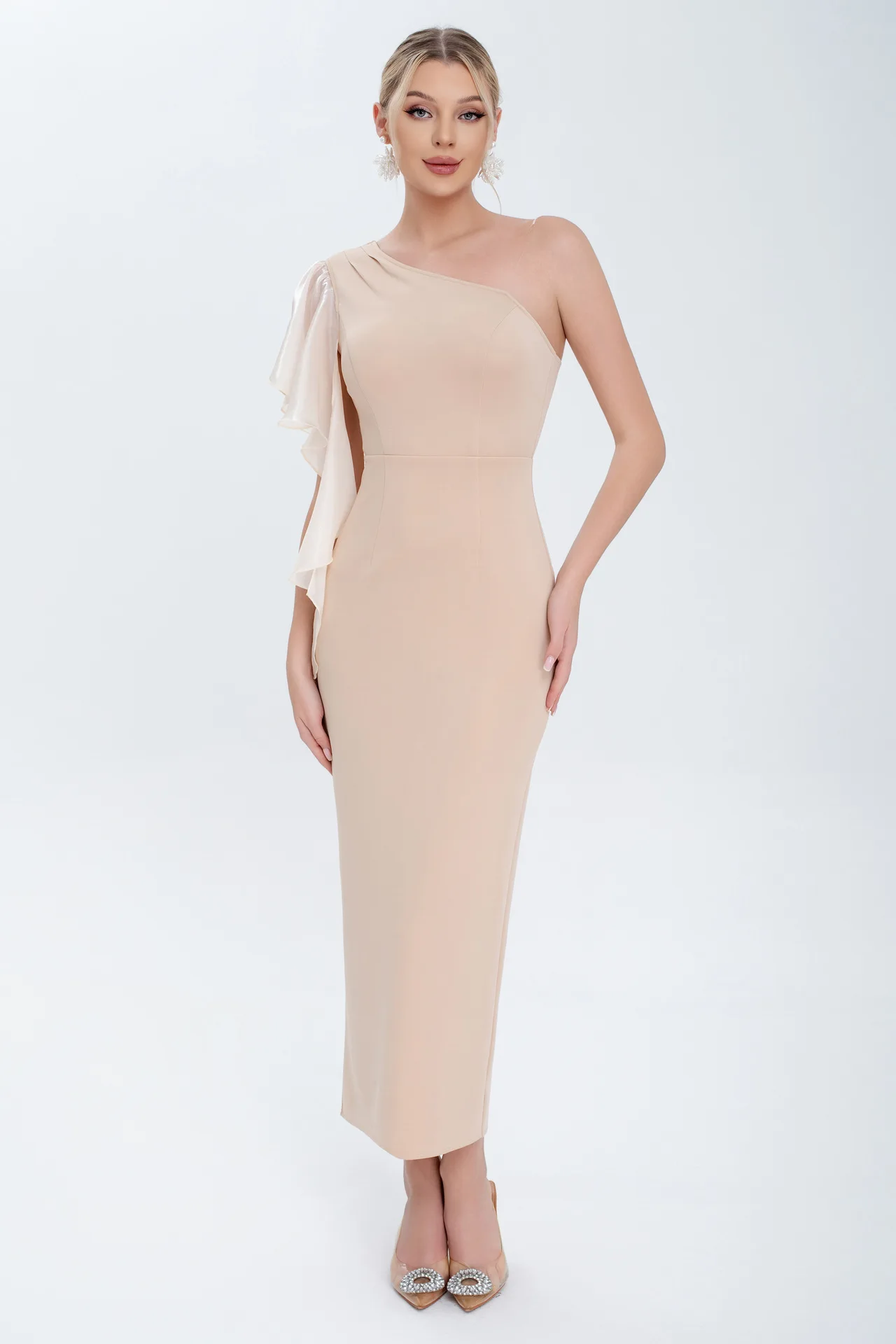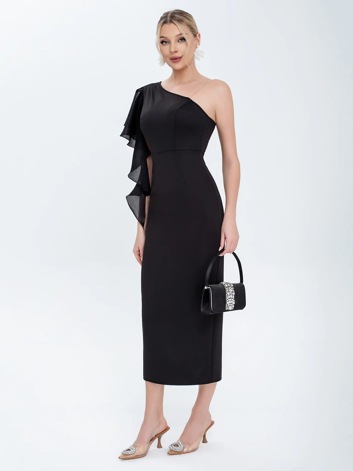 ZYHT 73903 Gemstone Crystal 3D Flower Decoration Ruched One Shoulder High Slit Long Sleeve Maxi Simple Elegant Evening Dress
