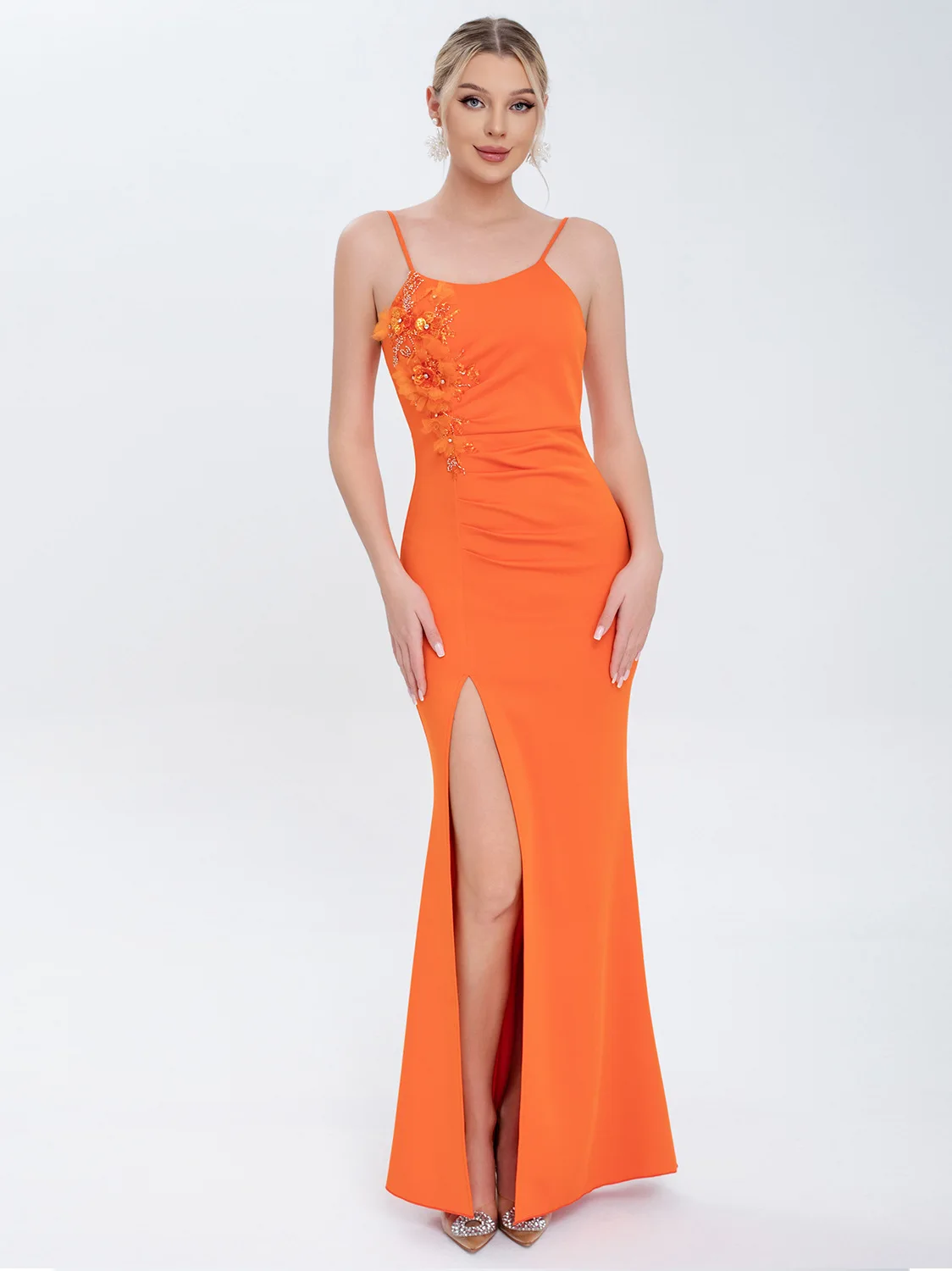 ZYHT 73903 Gemstone Crystal 3D Flower Decoration Ruched One Shoulder High Slit Long Sleeve Maxi Simple Elegant Evening Dress