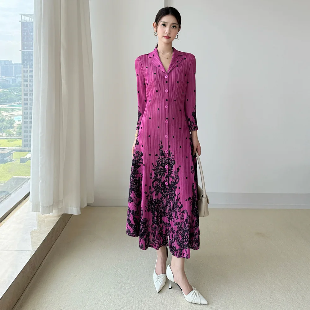 Miyake Pleated Light Luxury Suit Collar Printed Dress 2025 New Autumn Single Button French-Style Casual Women's Dress