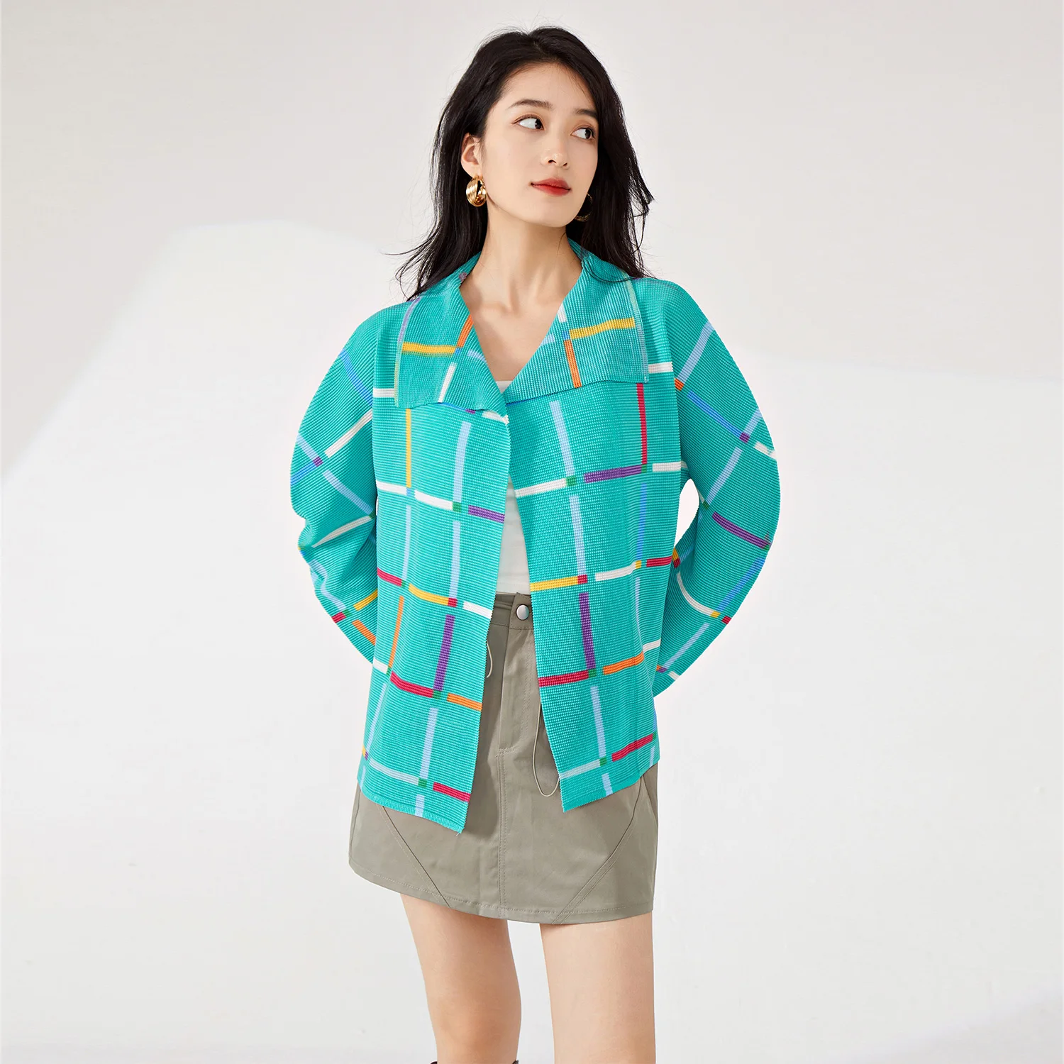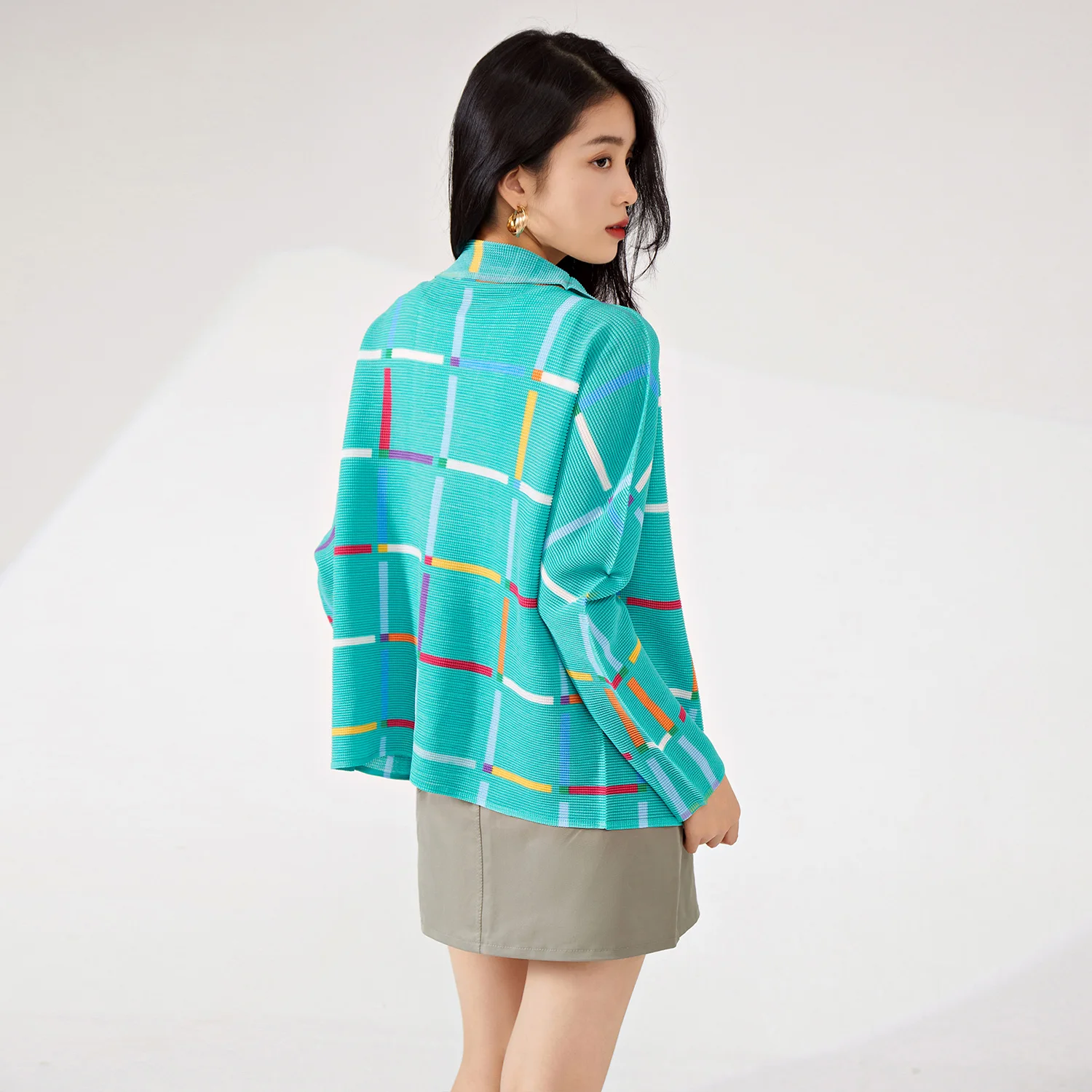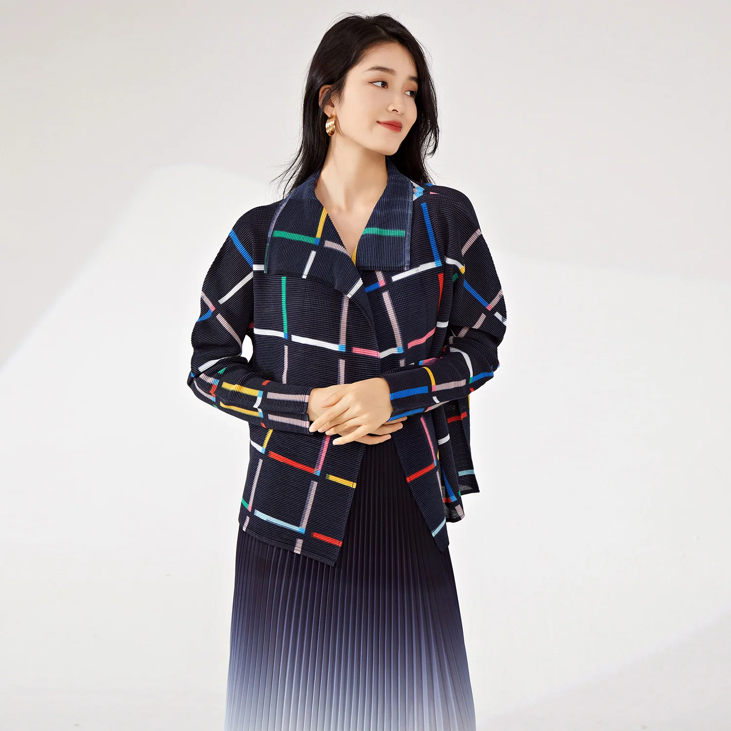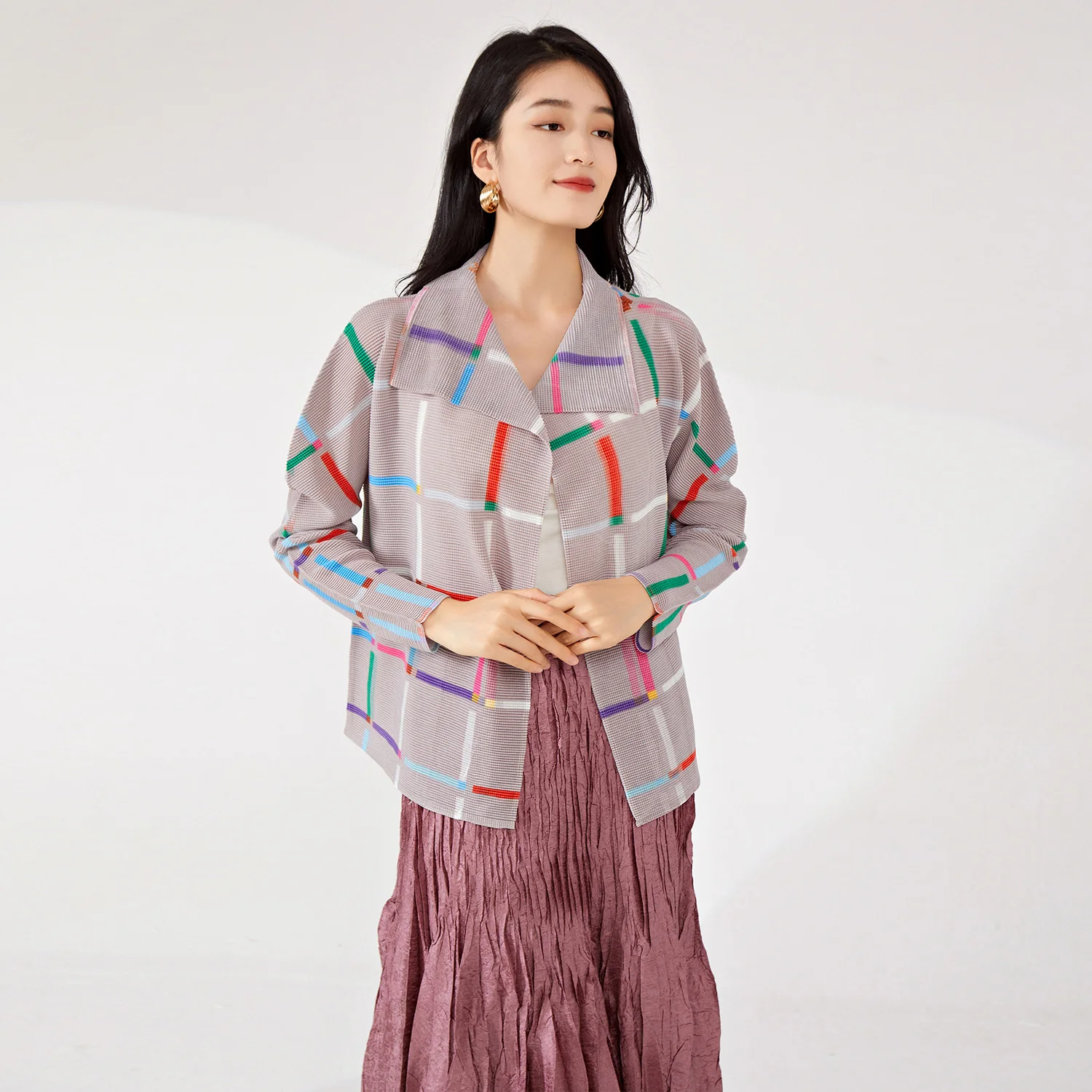 Women's Vintage Pleated Cardigan Top Woven Plaid Design Jacket With Stretch Lapel Loose Temperament for Spring Summer Autumn