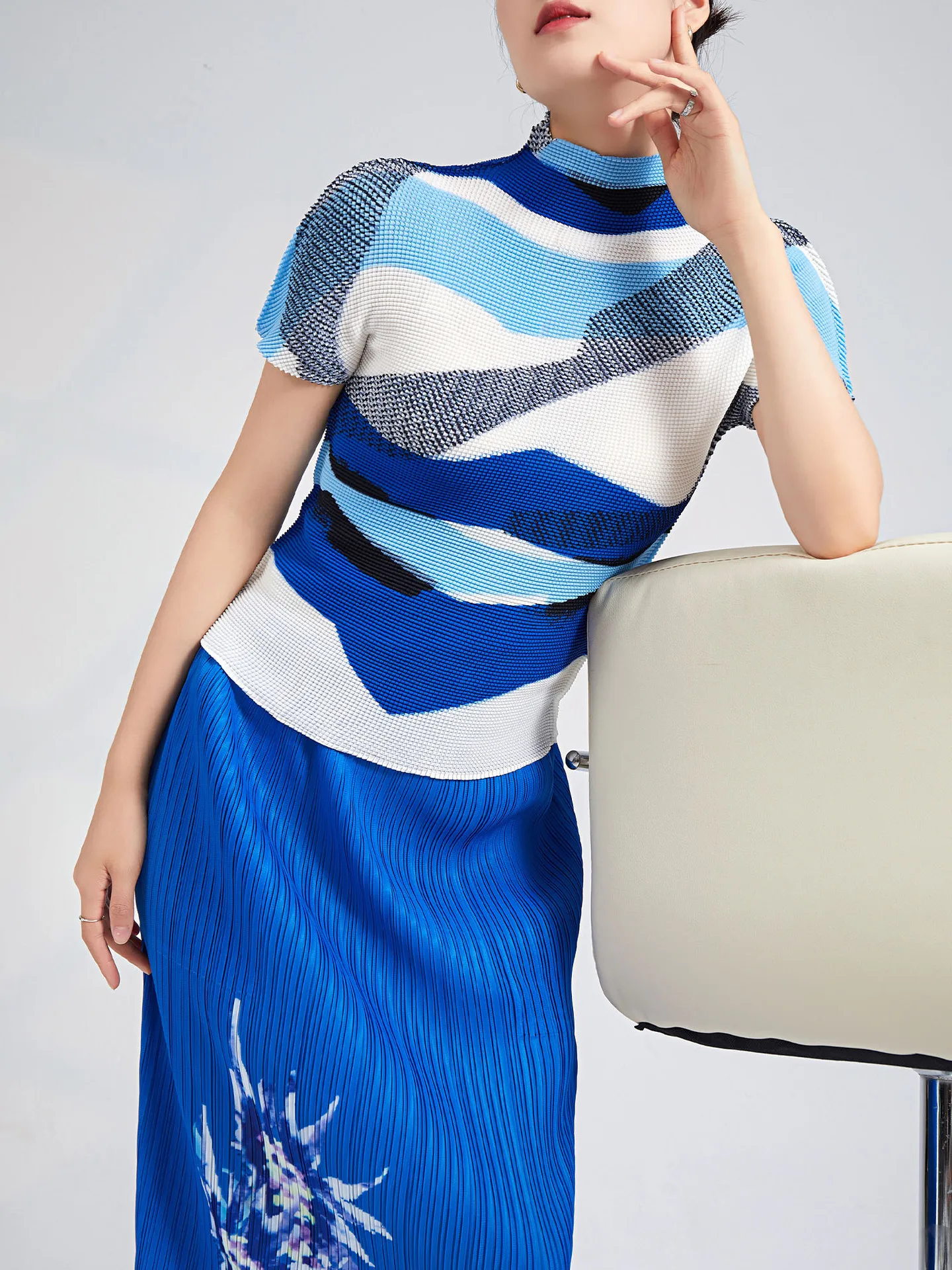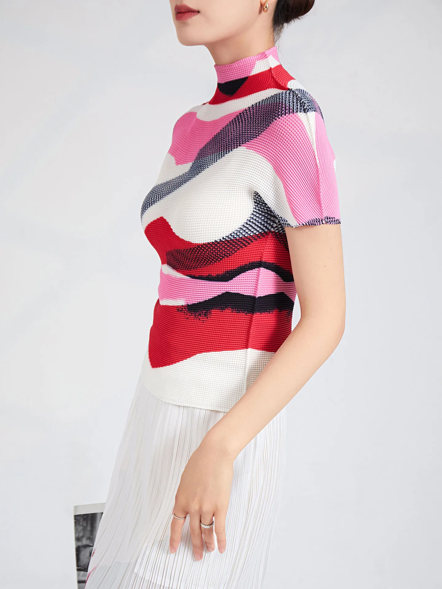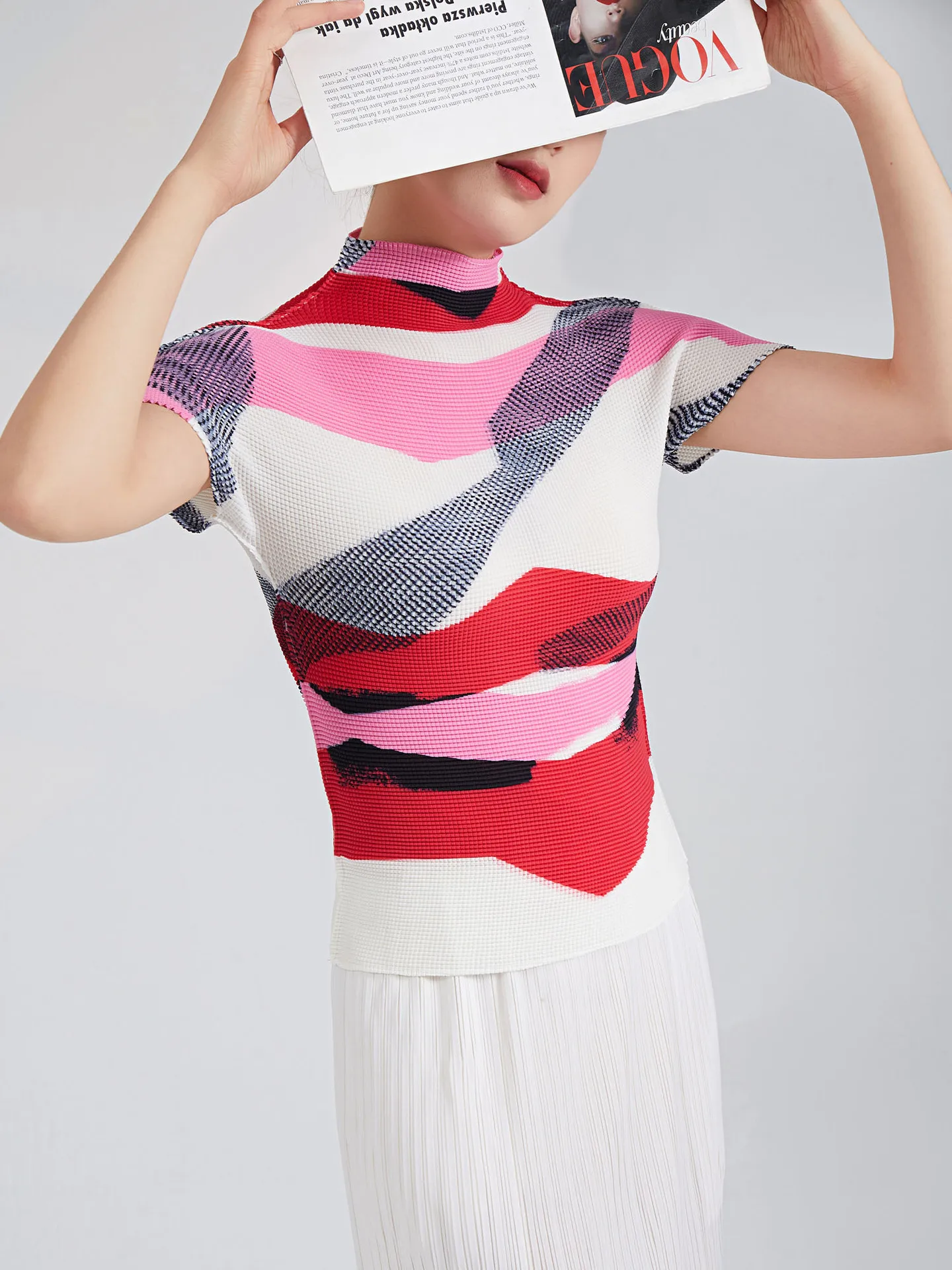 2025 Summer Miyake Latest Fashion Design Printed Shirt Short-sleeved Top Women's Casual Pleated Elastic T-shirt