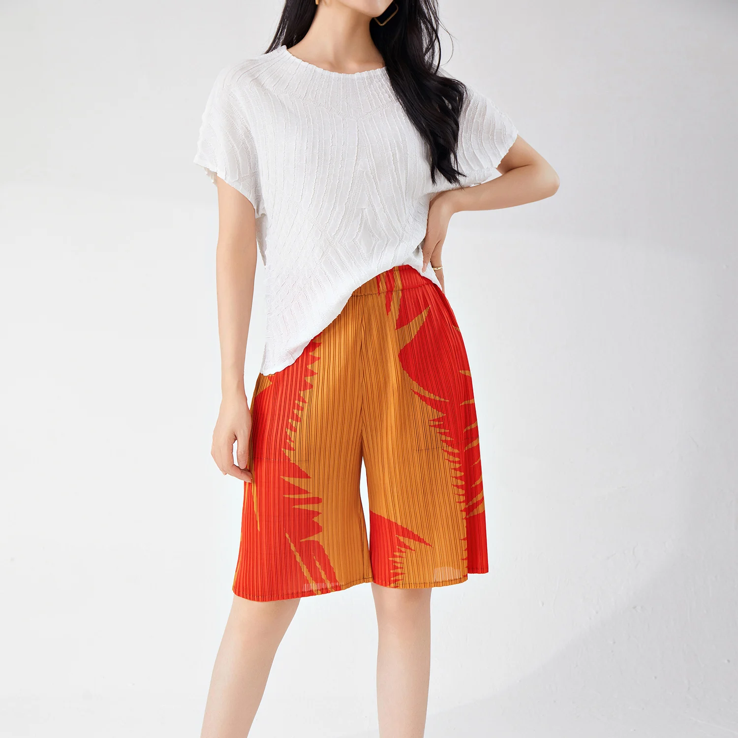 Summer Fashion Women Stretch Print Casual Pants Pleated Loose Straight Design With Knee Length Sustainable One Size for Ladies