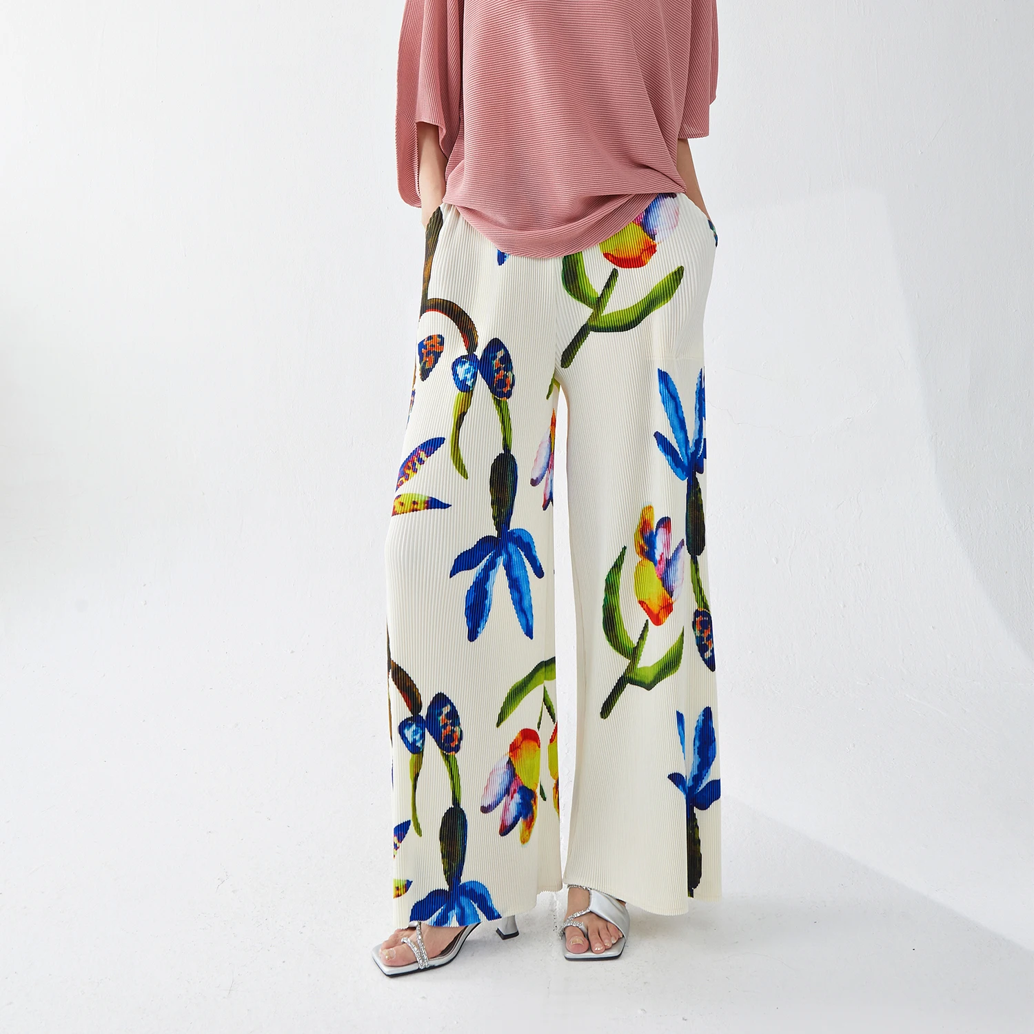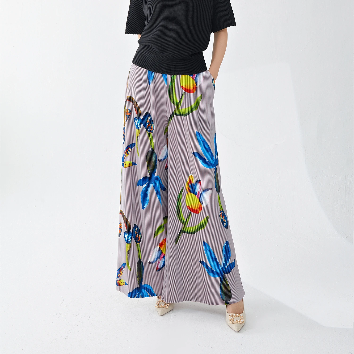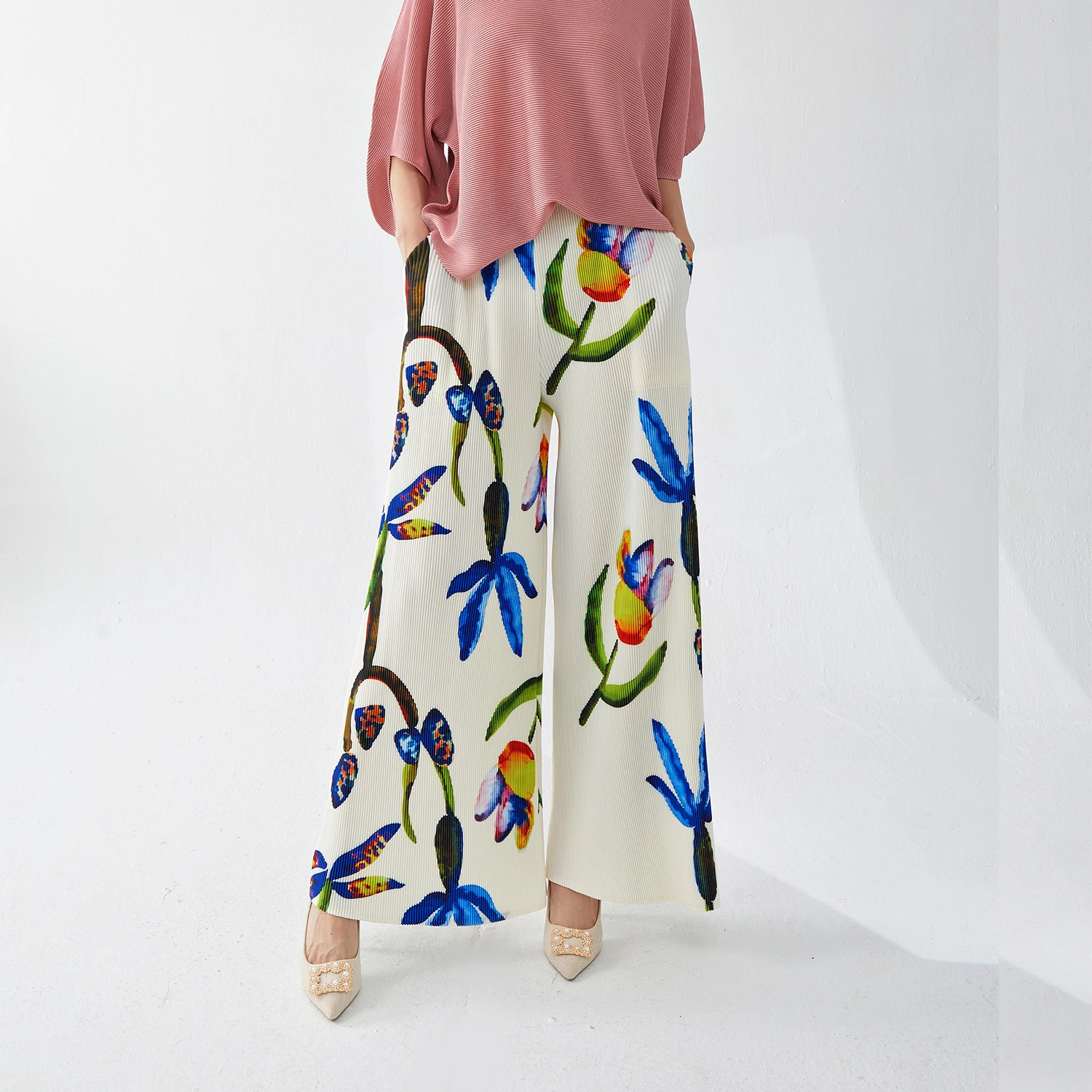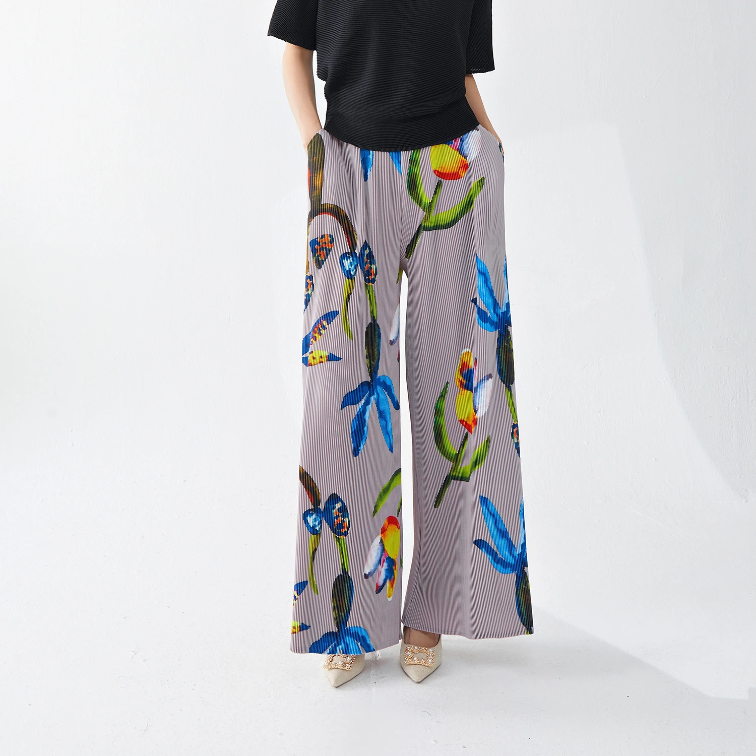 Miyake Ladies High Quality New Summer Style Printed Straight Legs Loose Fit High-Waist Pleated Wide Leg Casual Pants