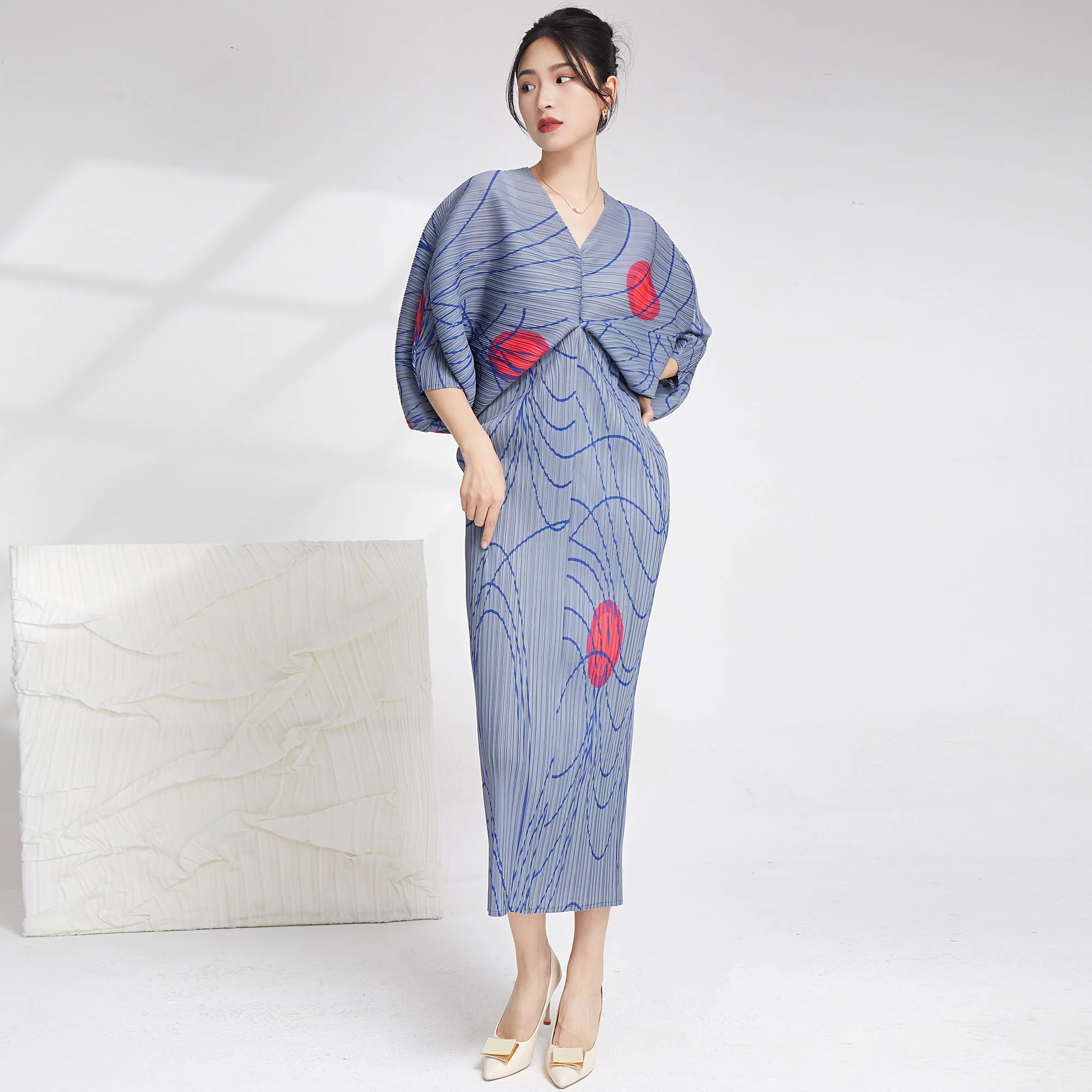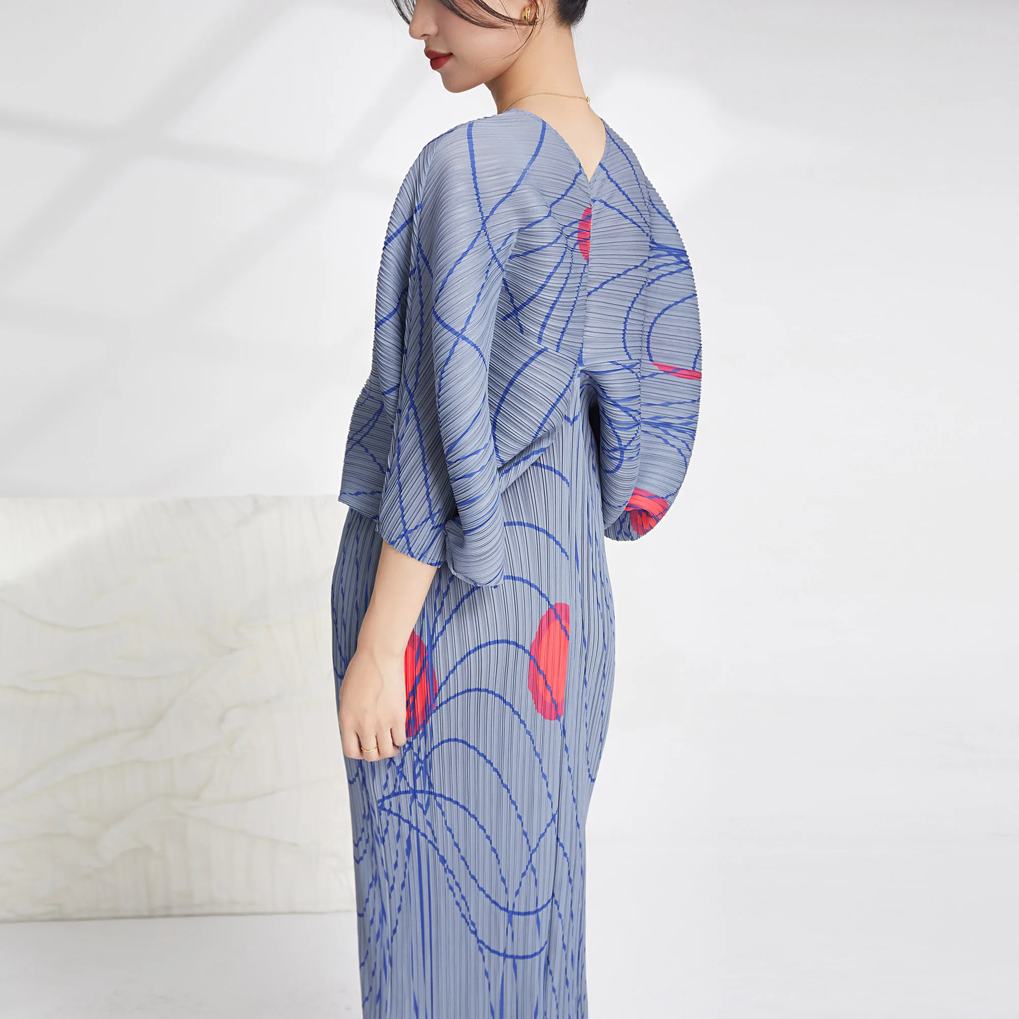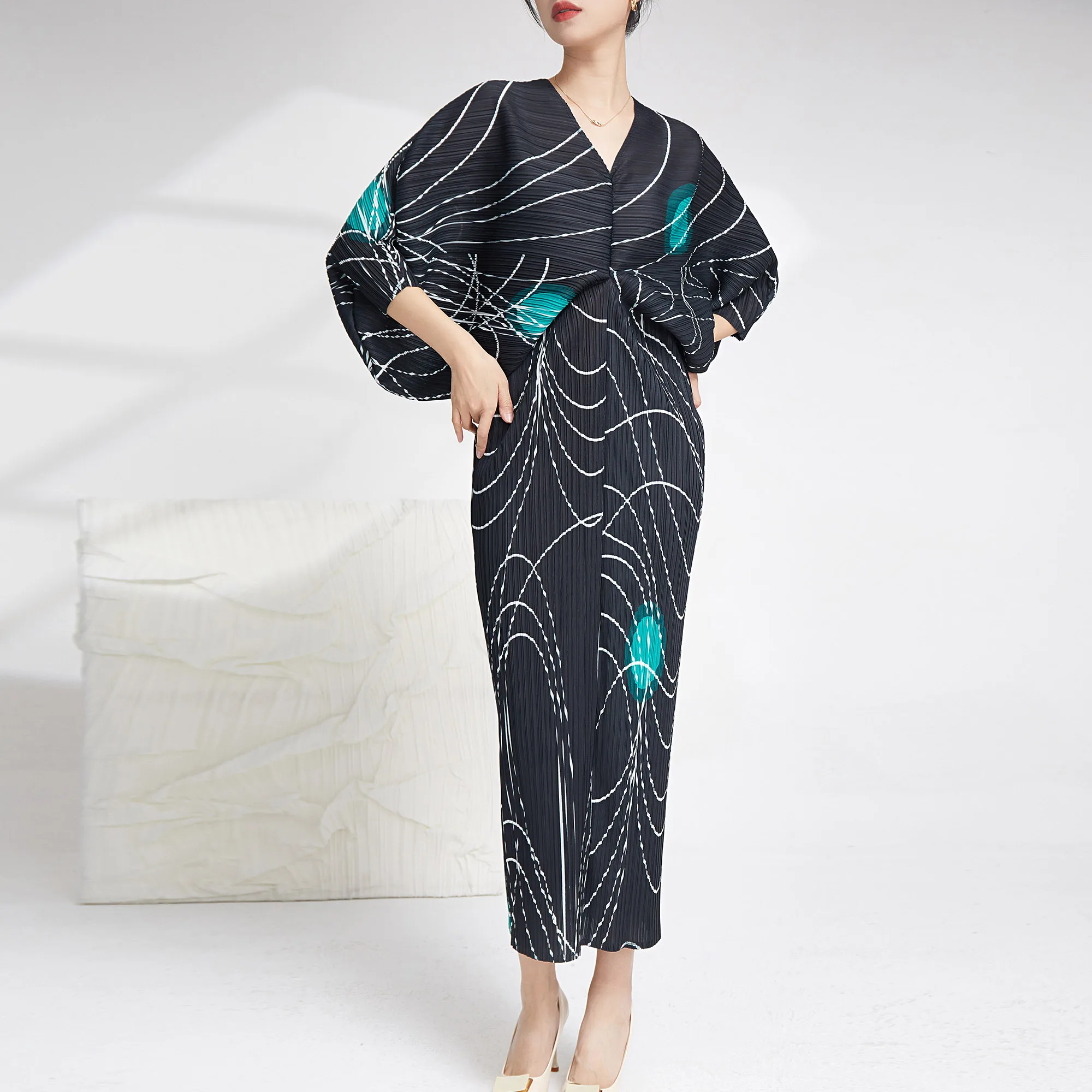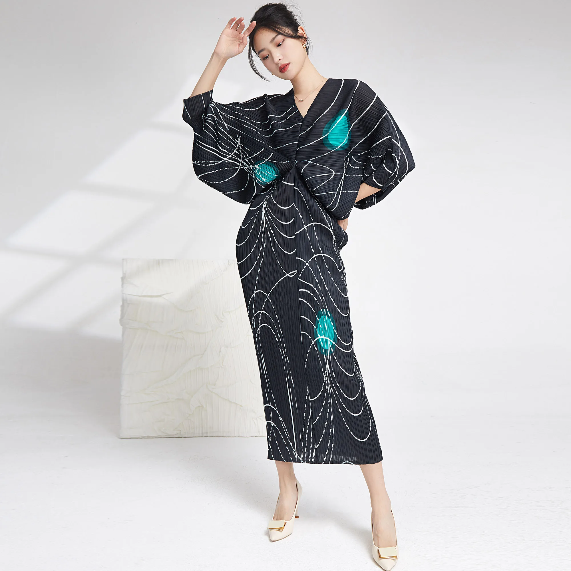 2025 Summer Women's Casual Style Dolman Sleeve Dress Striped Printed Miyake Pleated Elastic Long Sleeve V-Neck Woven Fabric