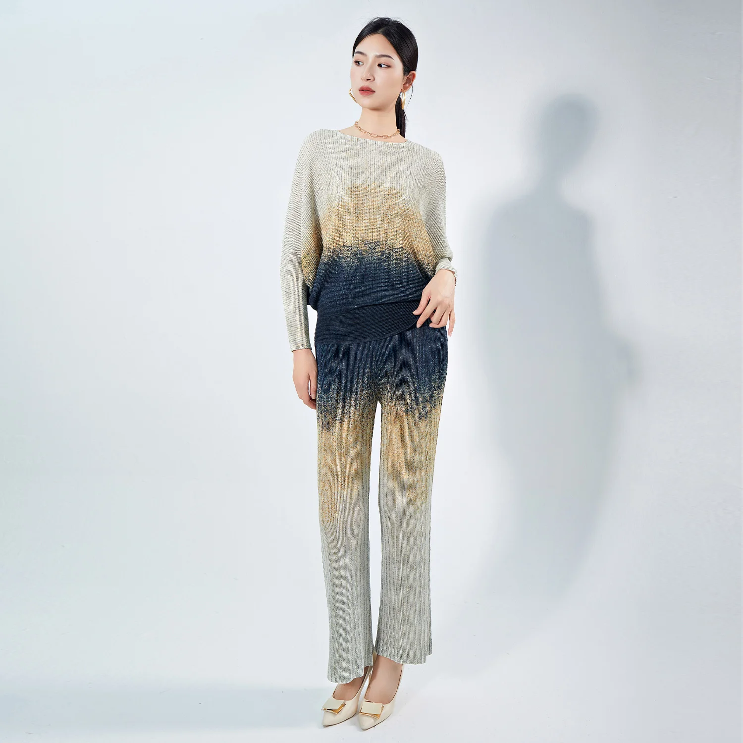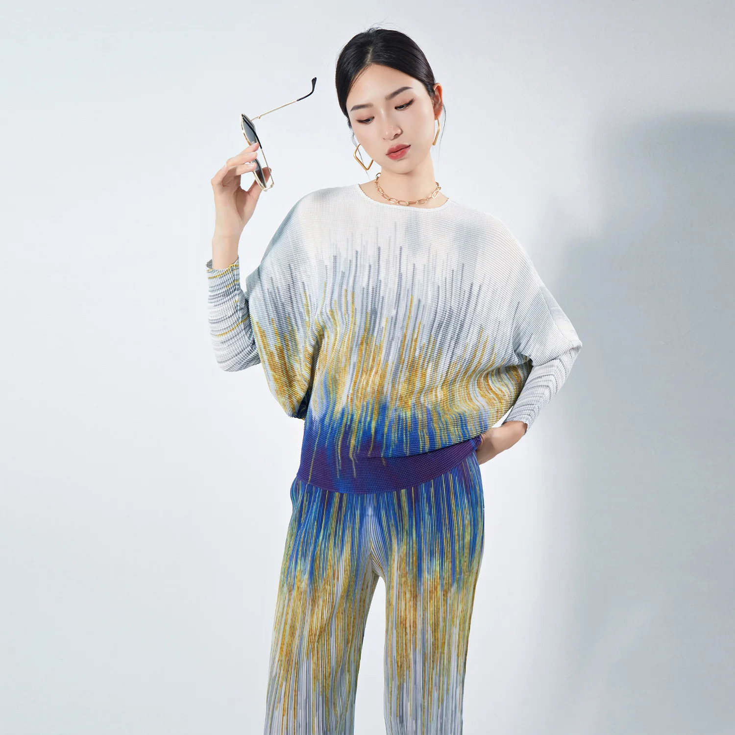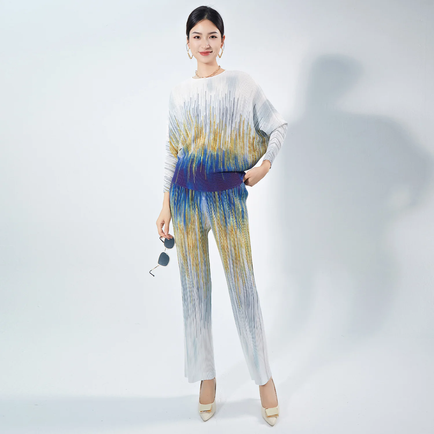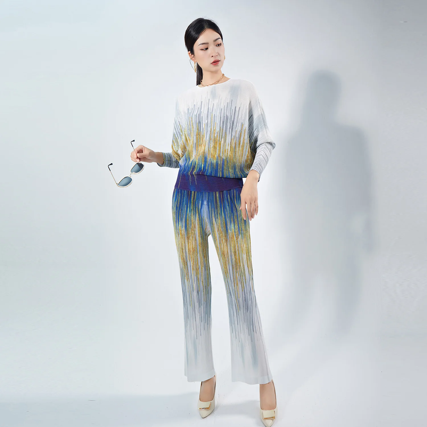 2025 Long Sleeve Top 2 Piece Set Pleated Loose Wide Leg Pants Suit Casual Women Two Piece Set Hot Sell Pleated Suit