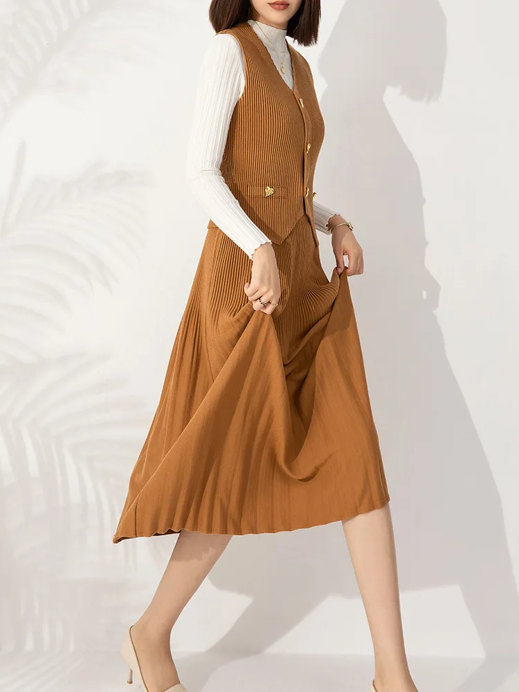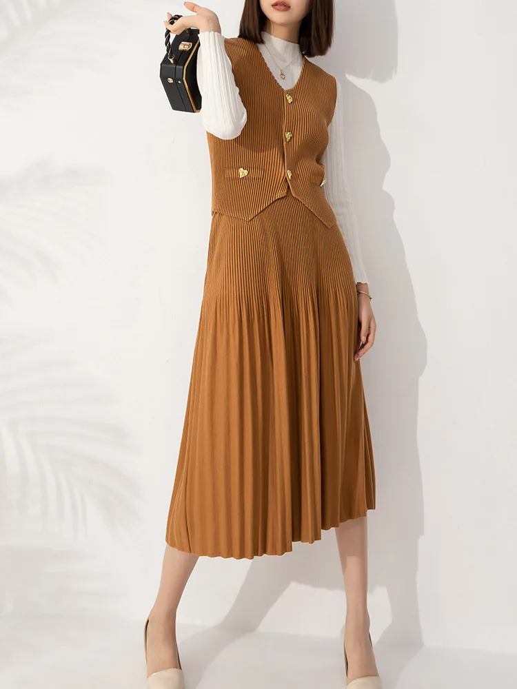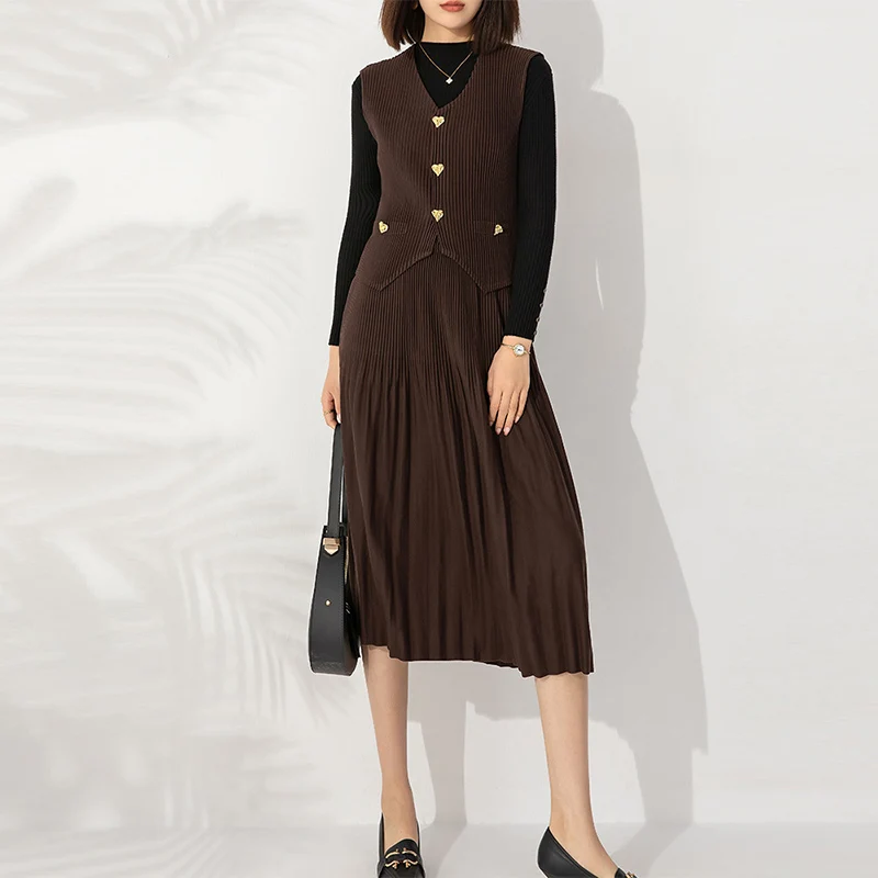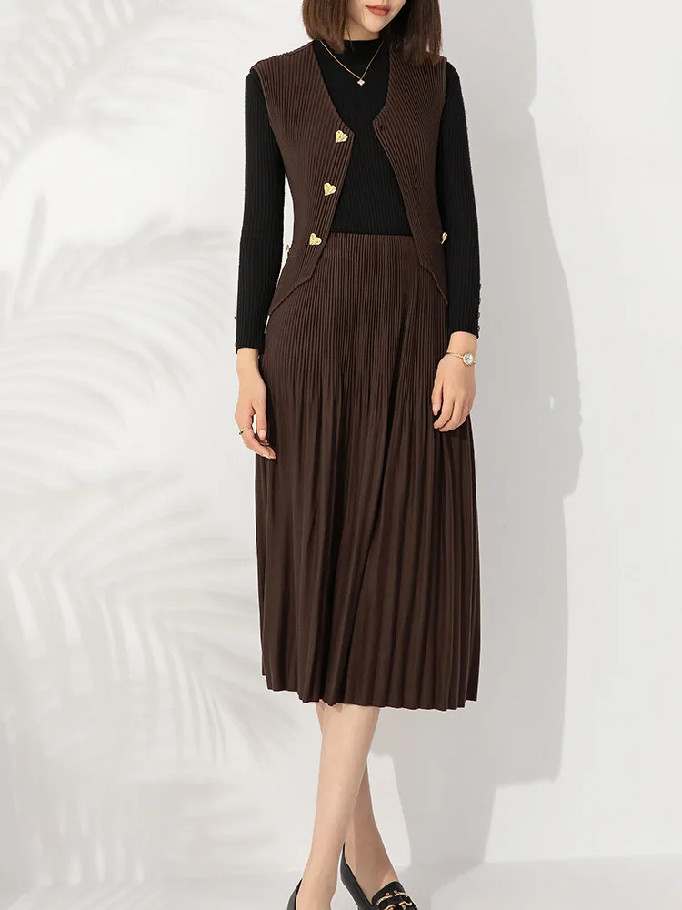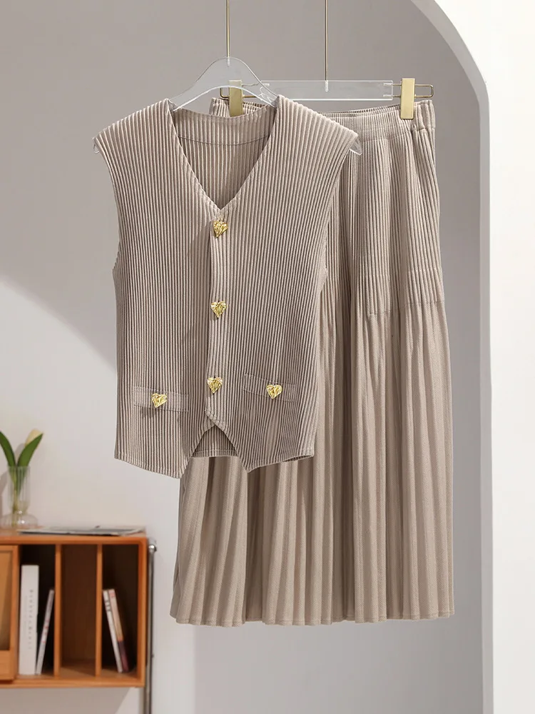 Miyake Pleated 2 Piece Set Graceful Design Casual Wear Buttoned Women Fashion Short Sleeve Top and Skirt Set