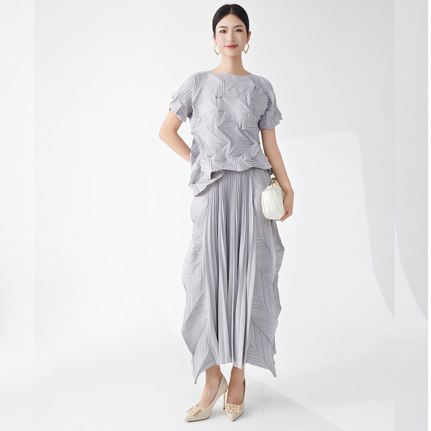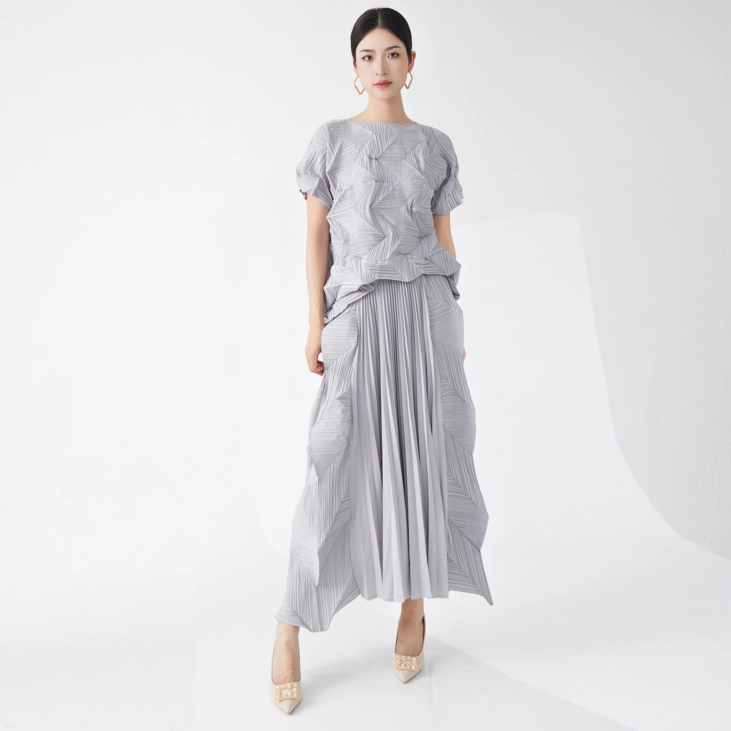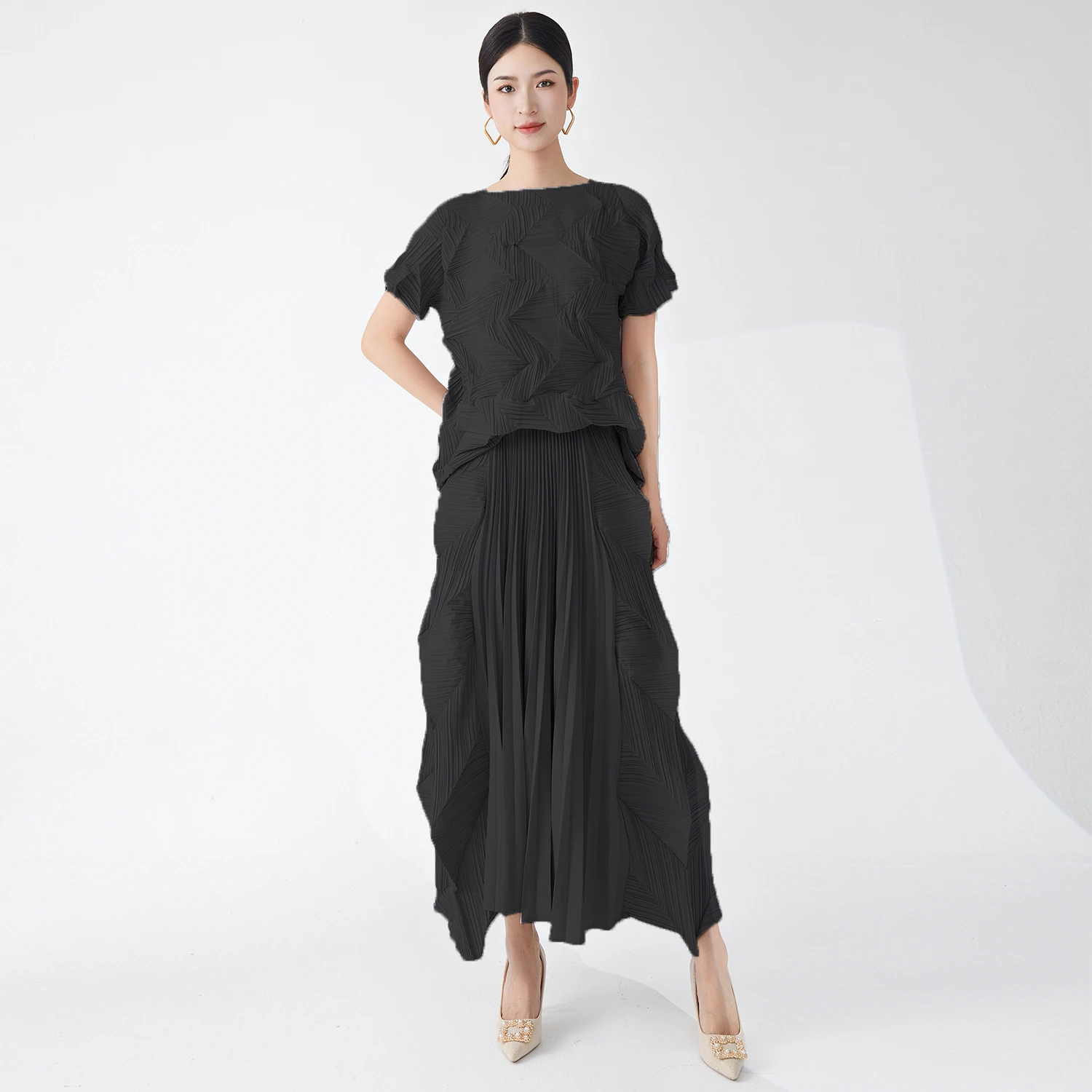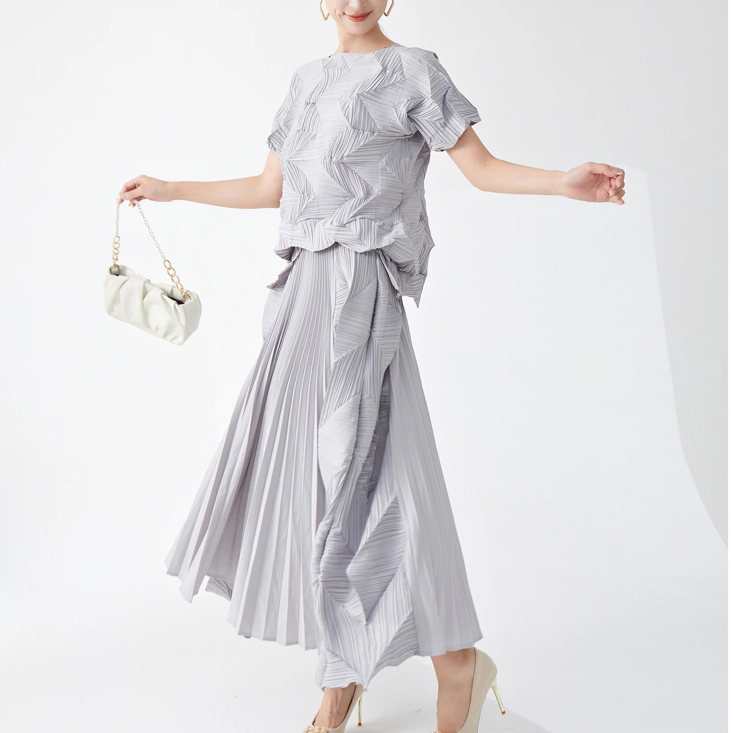 2025 Latest Miyake Pleated Design Casual Two-Piece Set Vintage Floral Polyester Shirt Ankle-Length Pleated Skirt Summer Clothing