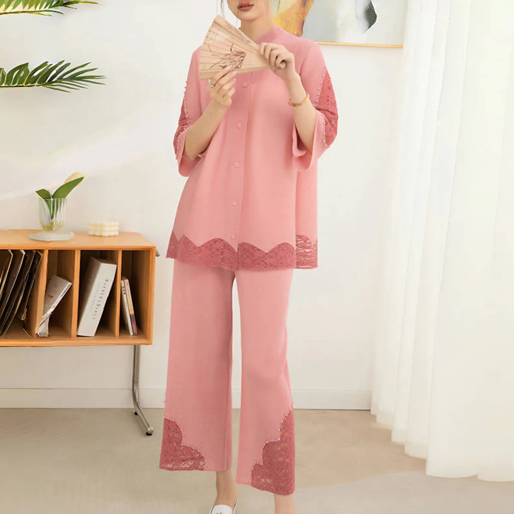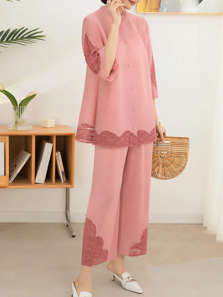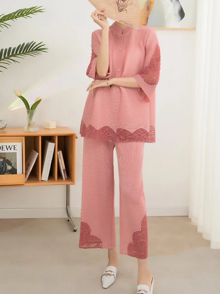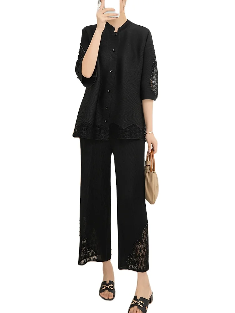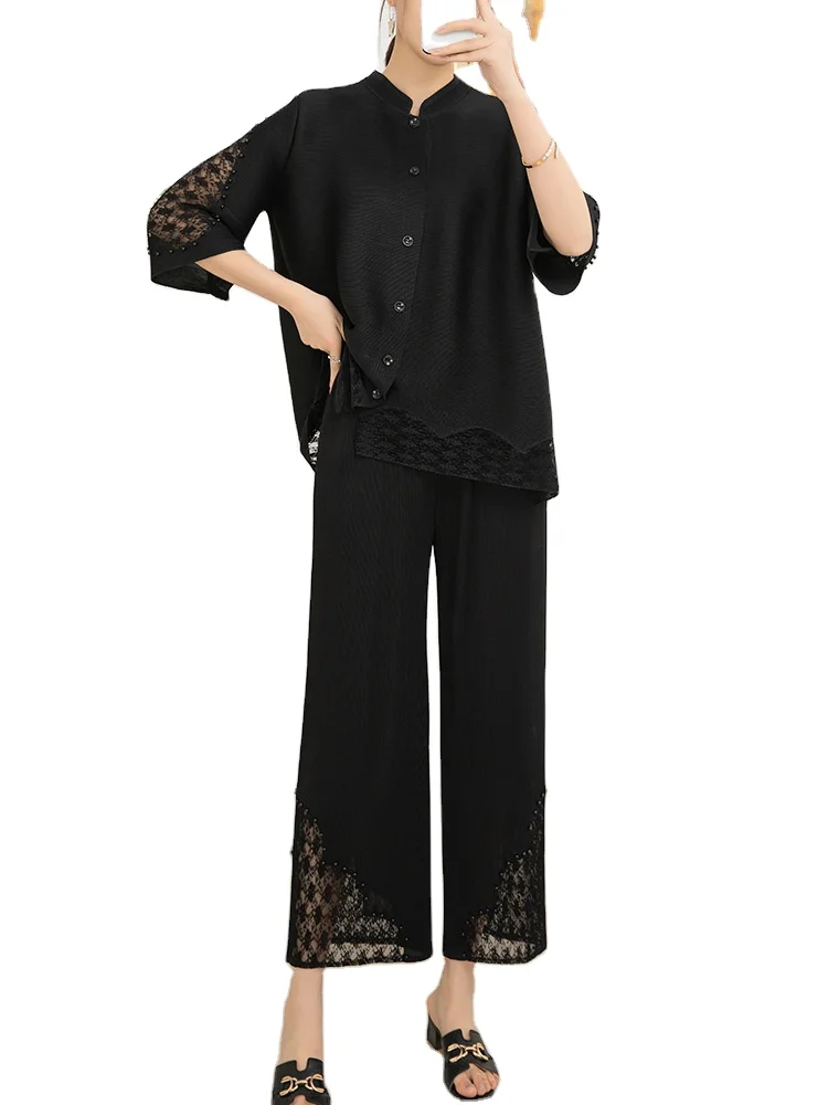 Women's Pleated Sets Spring New Style Casual Style Solid Two-Piece Set Loose Top Ankle-Length Wide-Leg Pants Made Polyester