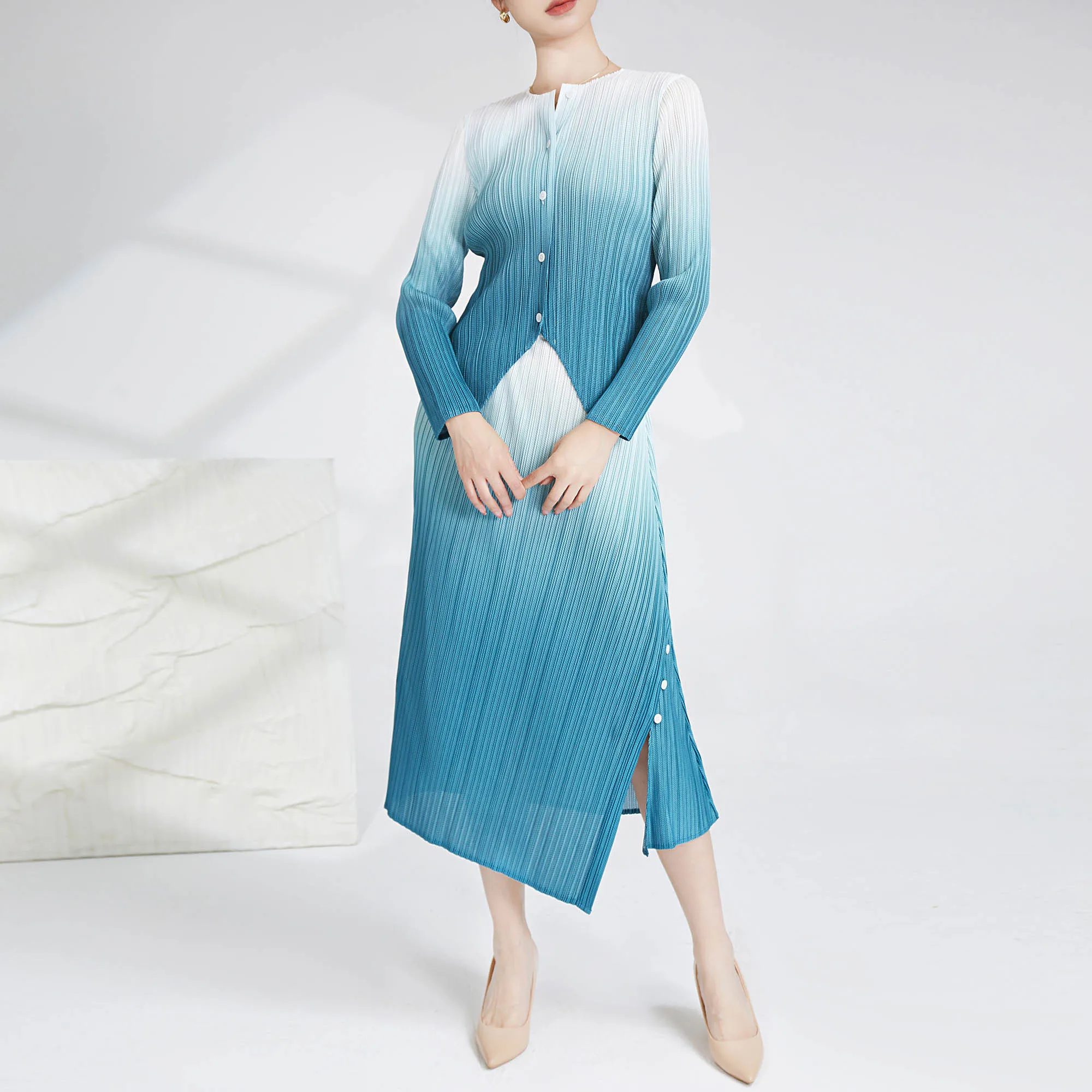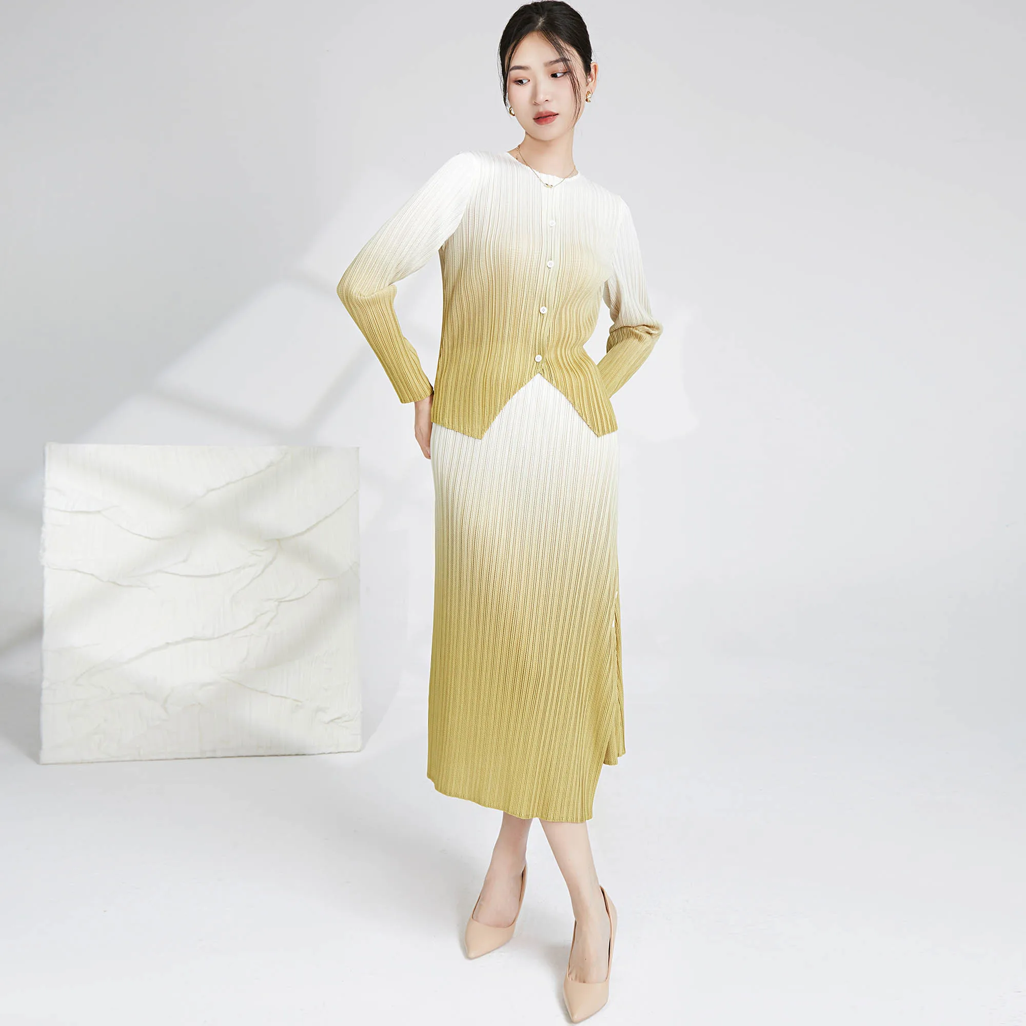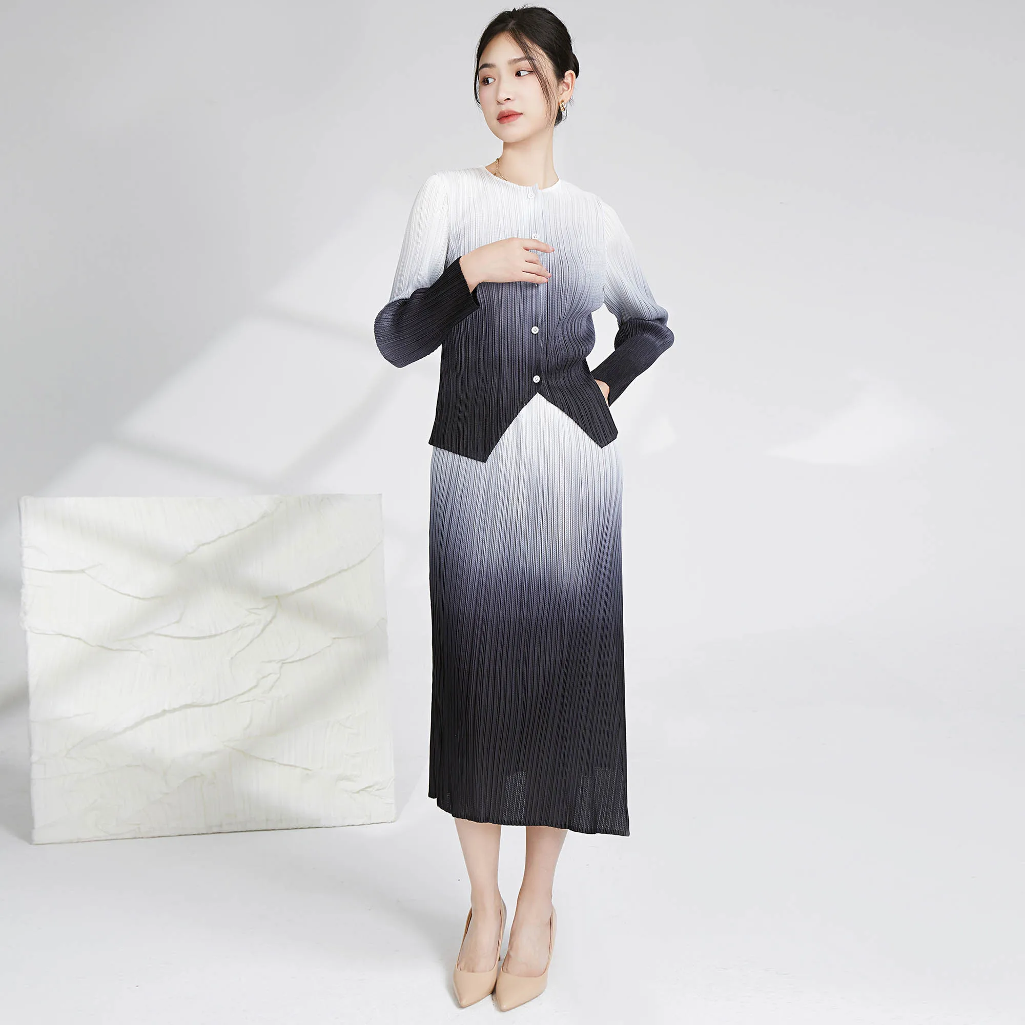 2025 Summer Miyake Latest Fashion Design Print Gradient Color 2-piece Set Women's Casual Long-sleeved Shirt and Pleated Skirt Se
