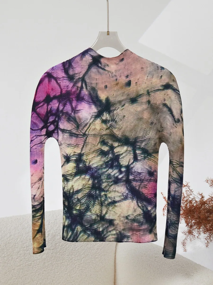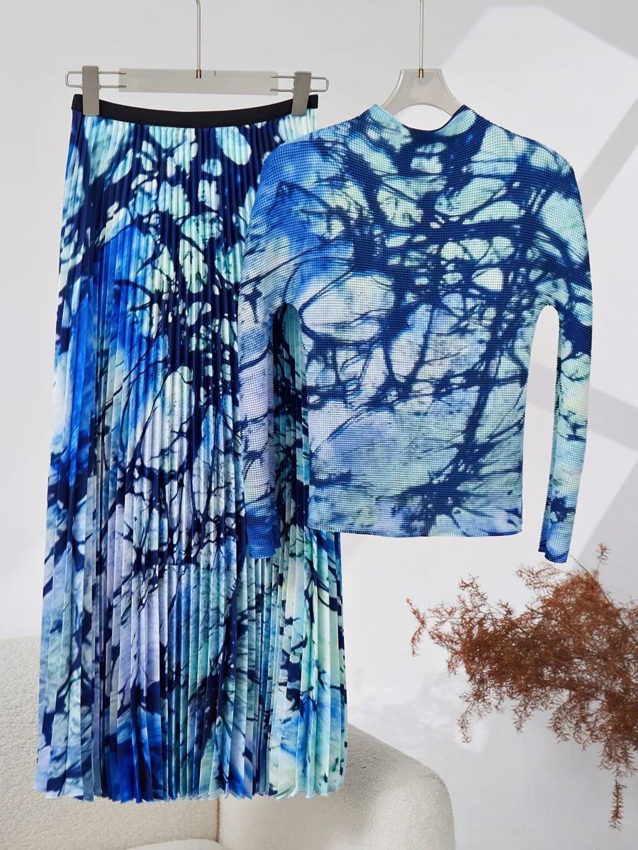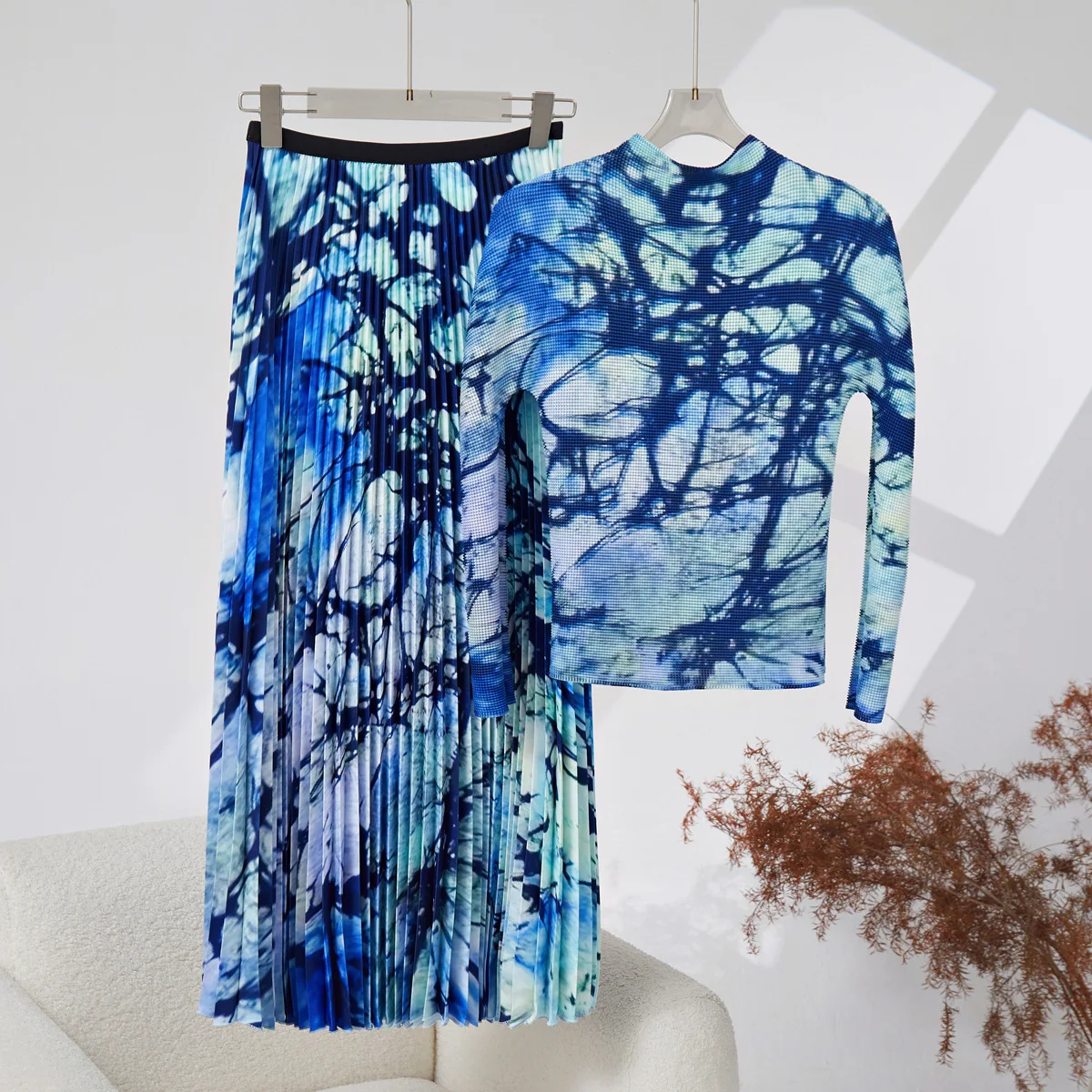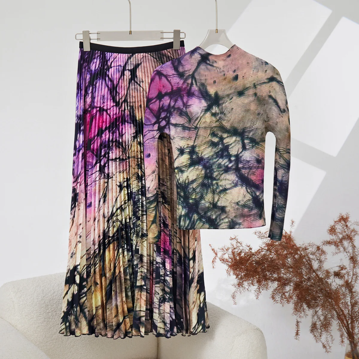Miyake Women's Casual Style Two-Piece Set Fashionable Stretch Printed Top and Pleated Skirt Made of Polyester Fabric