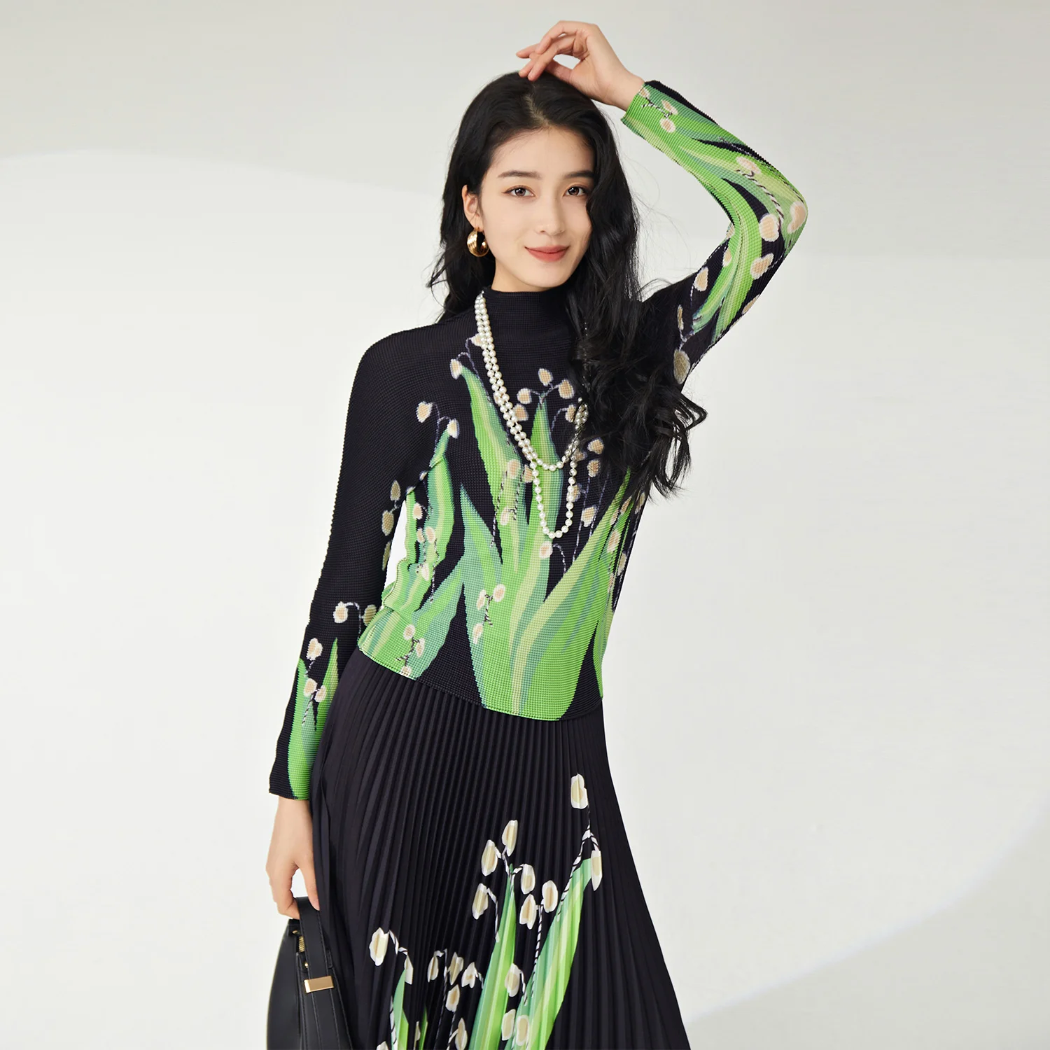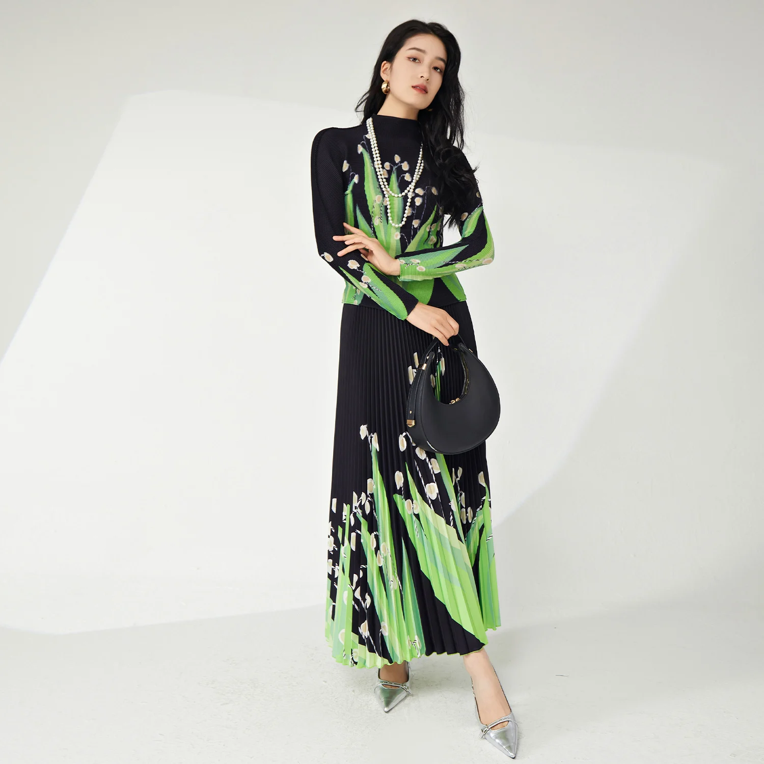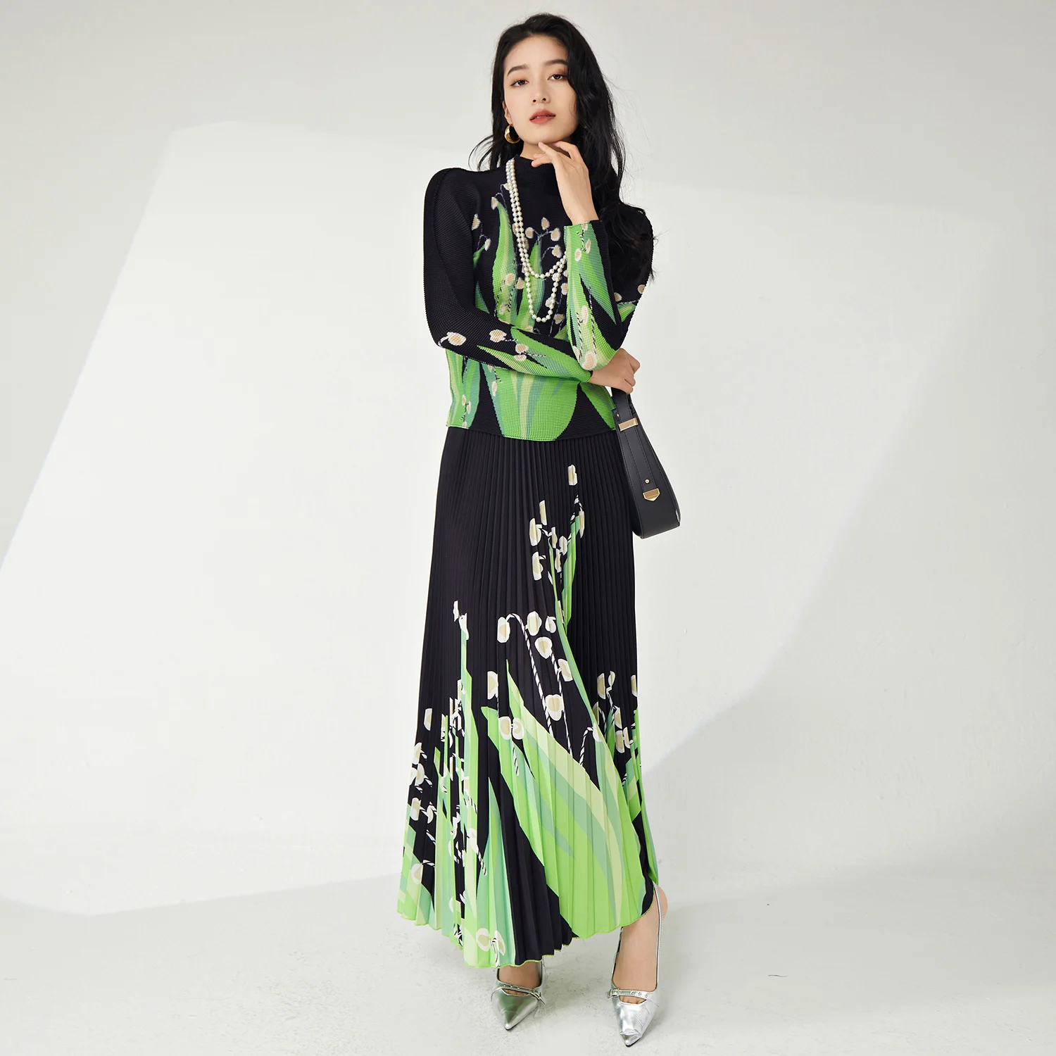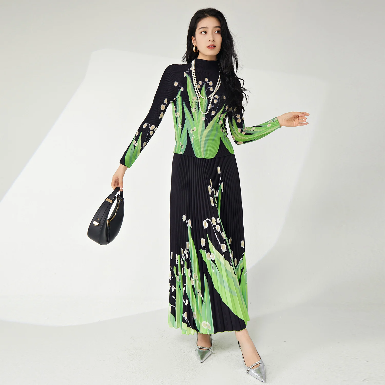 Miyake Women's Casual Stretch Polyester Set Fashionable Floral Printed Top and Maxi Skirt Ankle Length for Spring