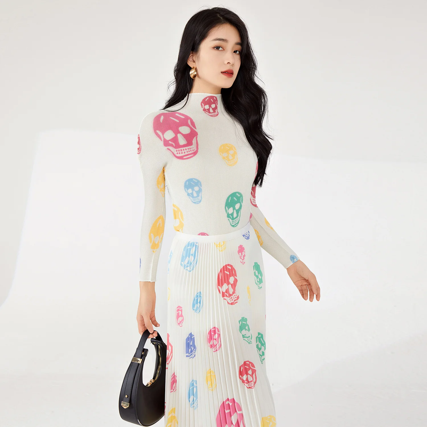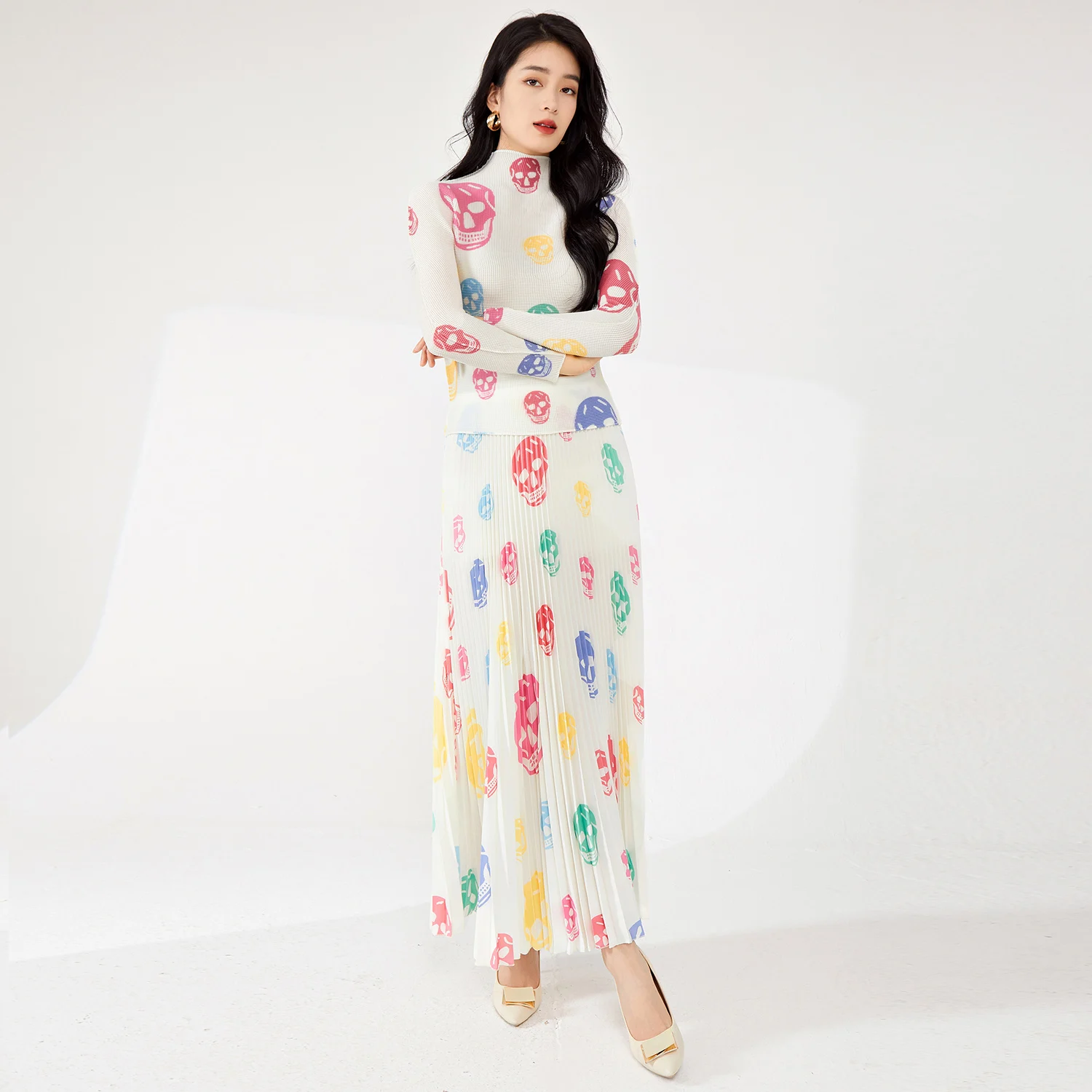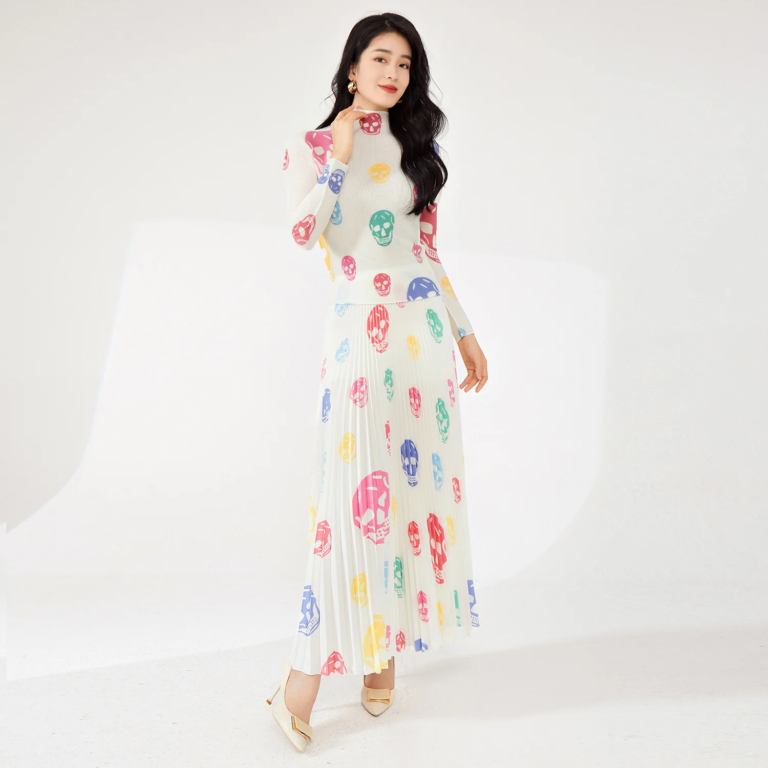 Miyake Women's Casual Summer Dress Elegant A-Line Skirt and Stretch Printed Long-Sleeved Top Two-Piece Set Made of Polyester