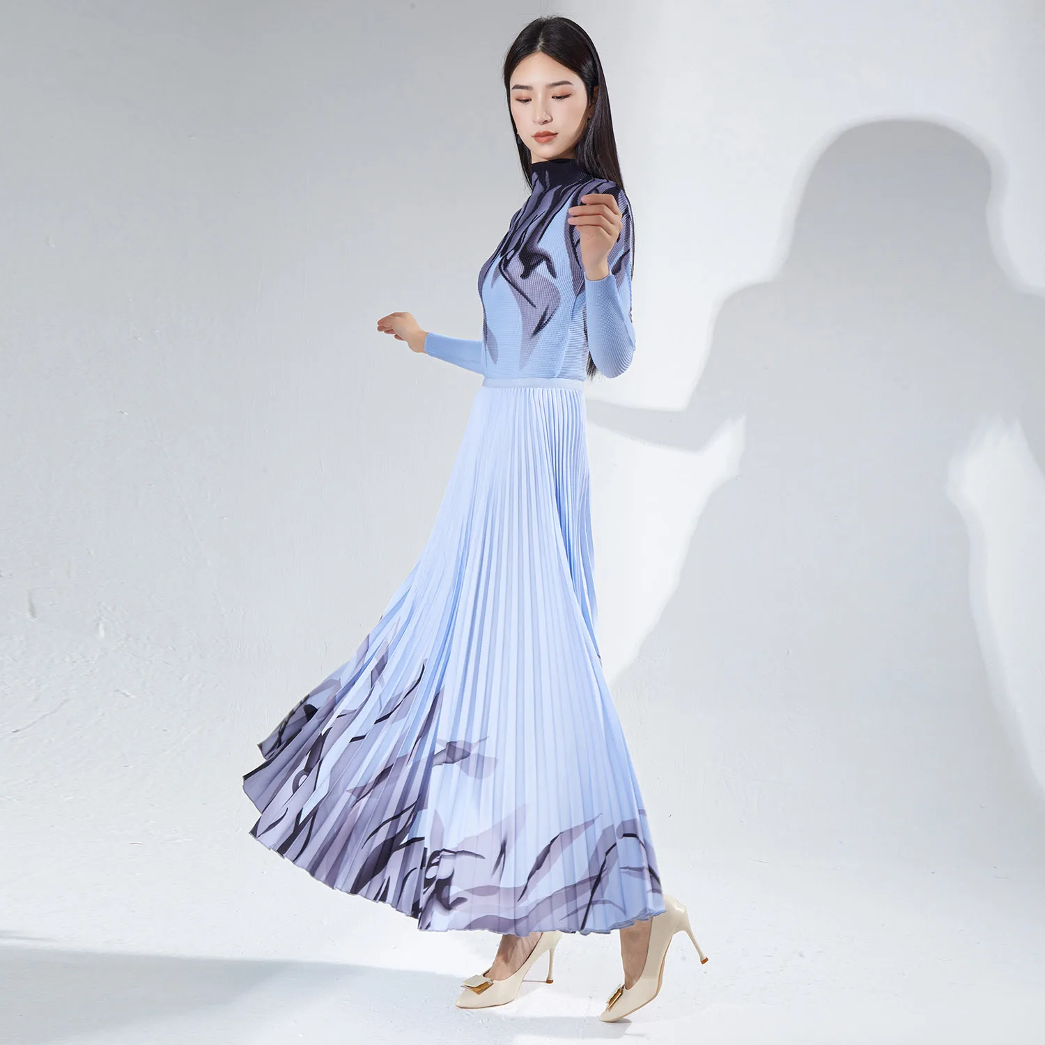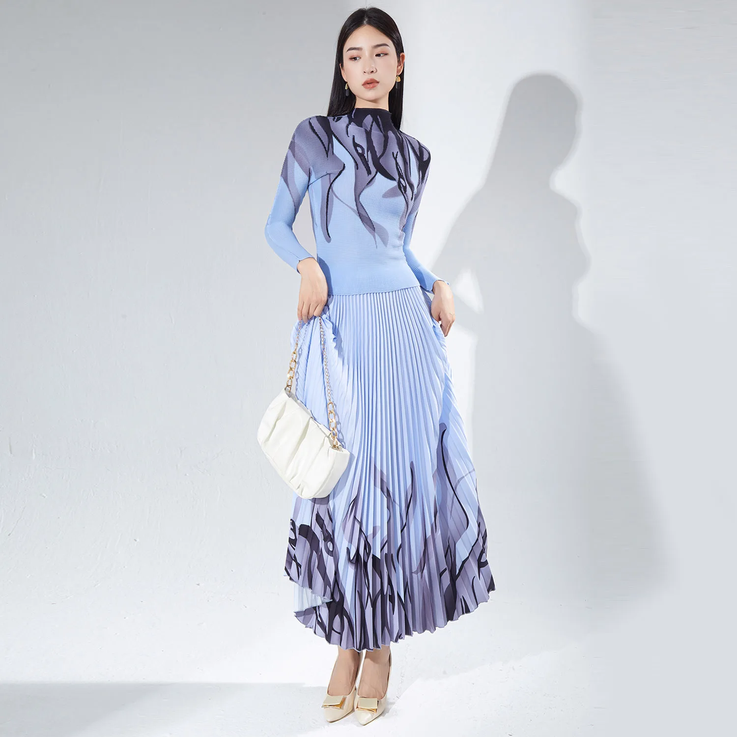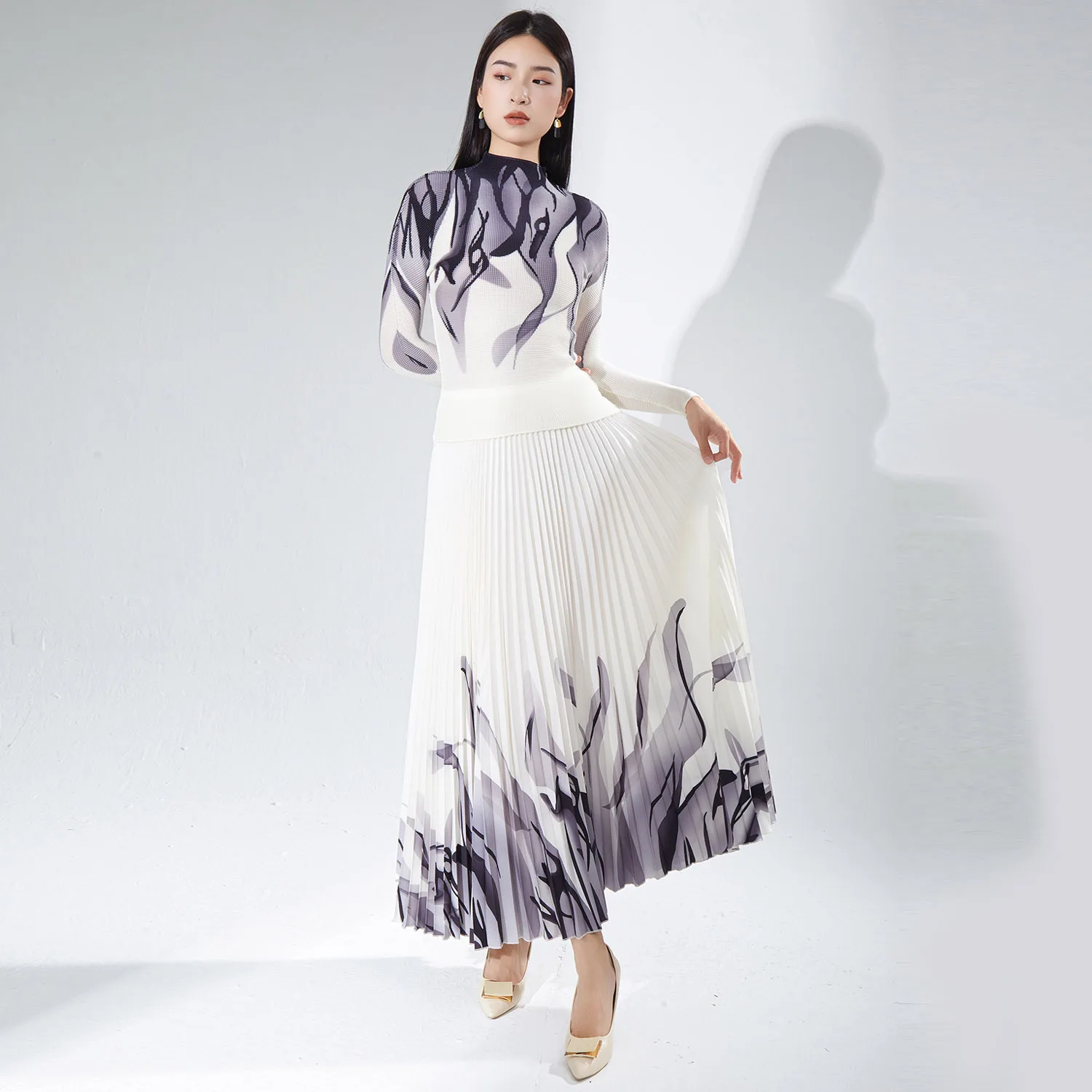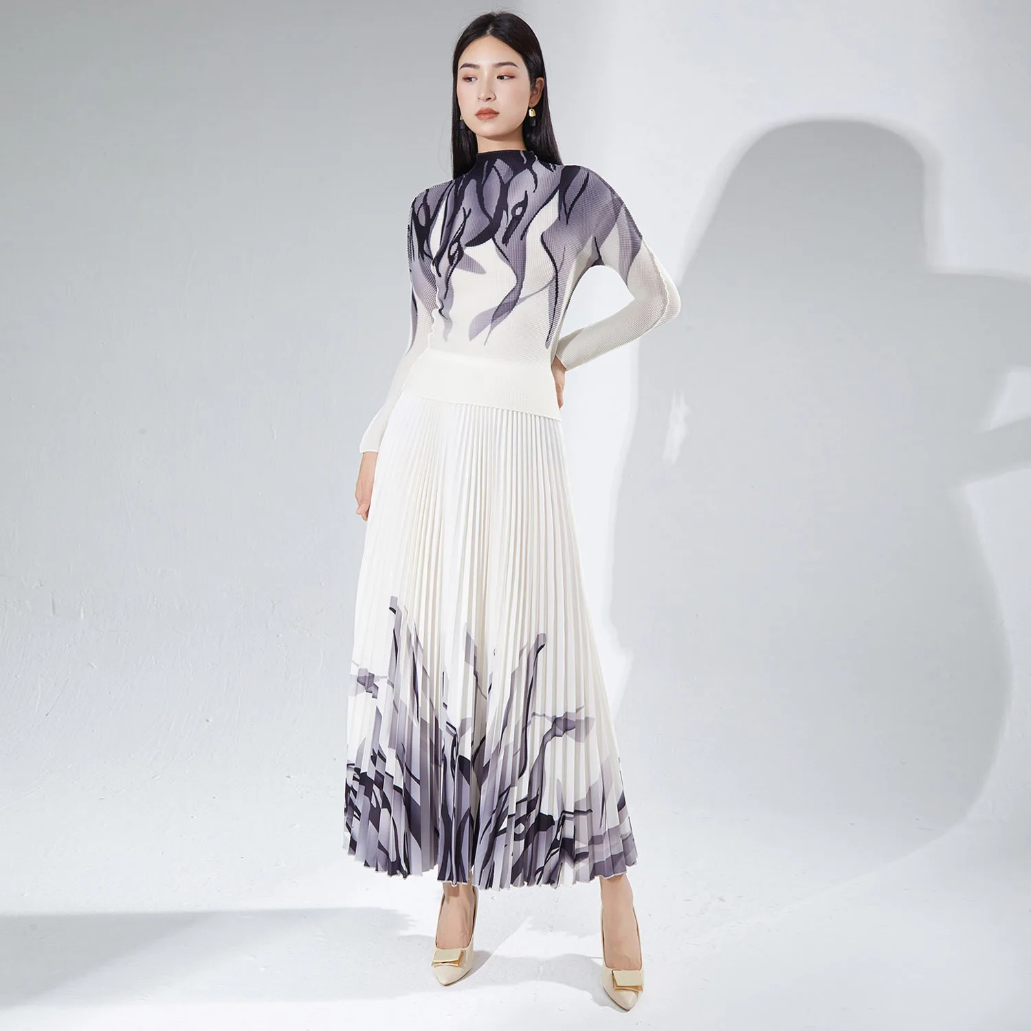 2025 New Arrival Miyake Pleated Women's Fashion Set Stretch Top & Long Pleated Skirt 2-Piece