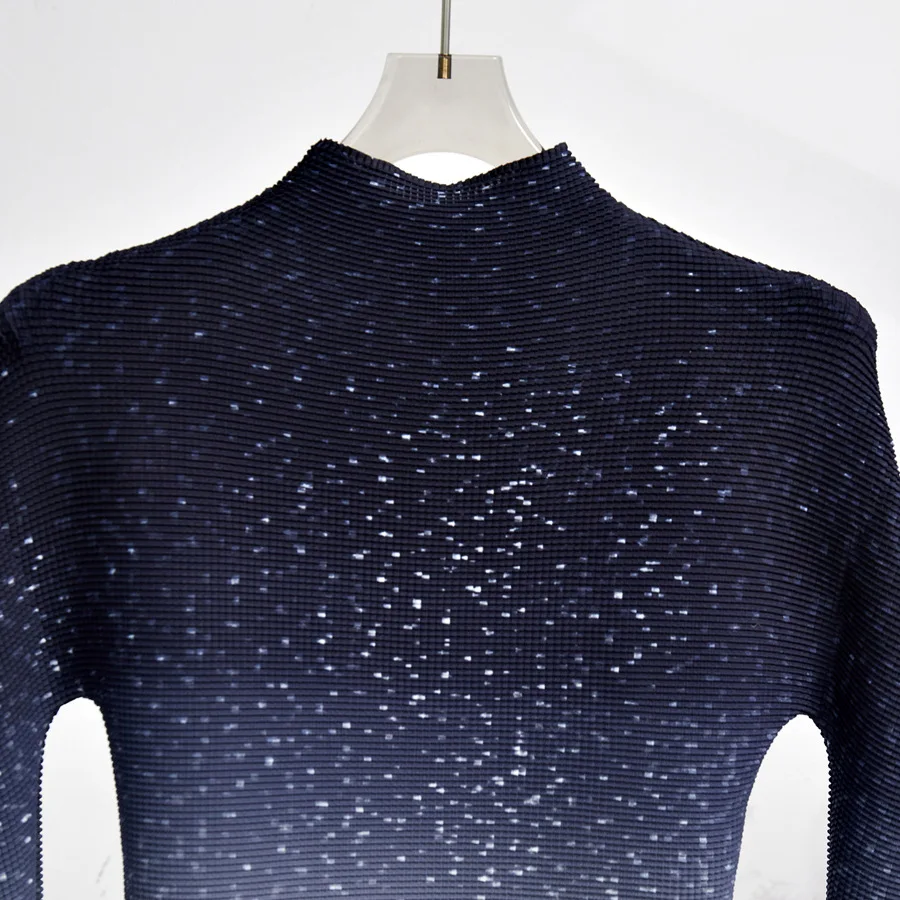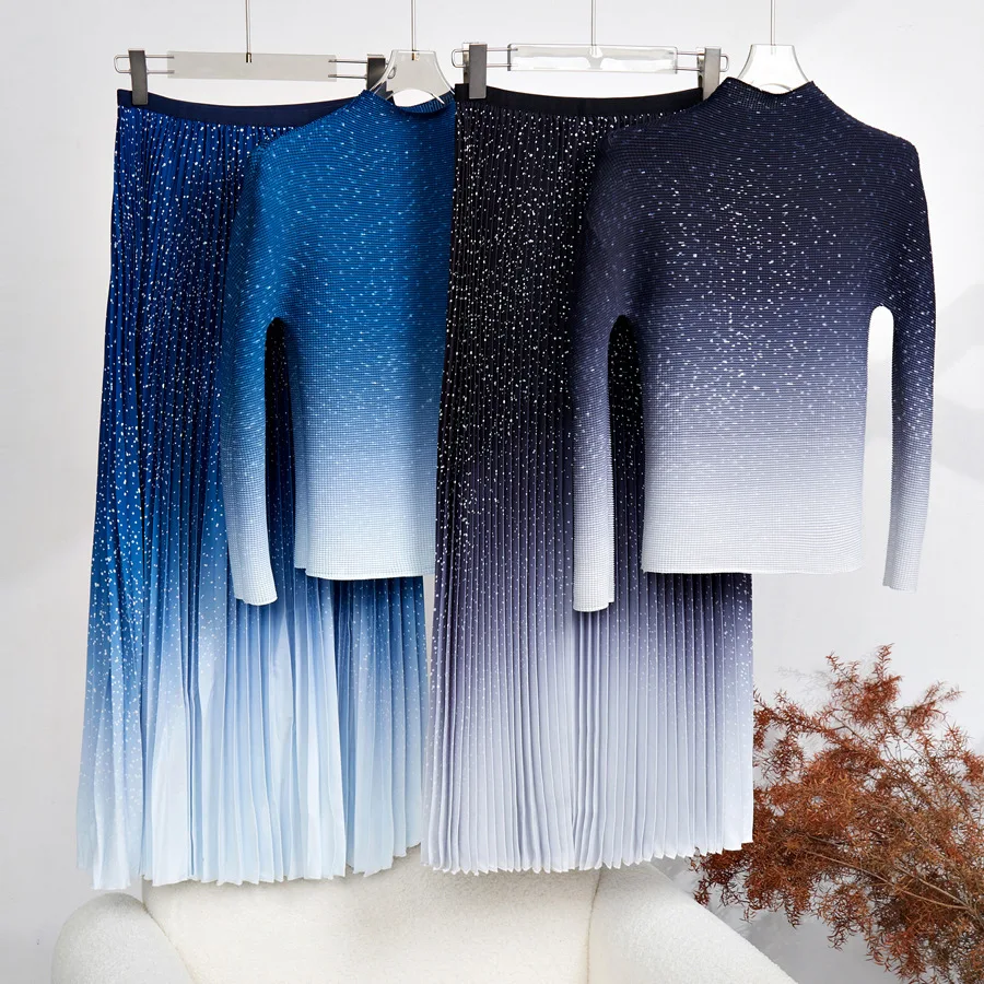 Woman Fashion Two Piece Sets Long Sleeve Pleated Stretch Elastic Top and Printed Pleated Skirt 2 Piece Set