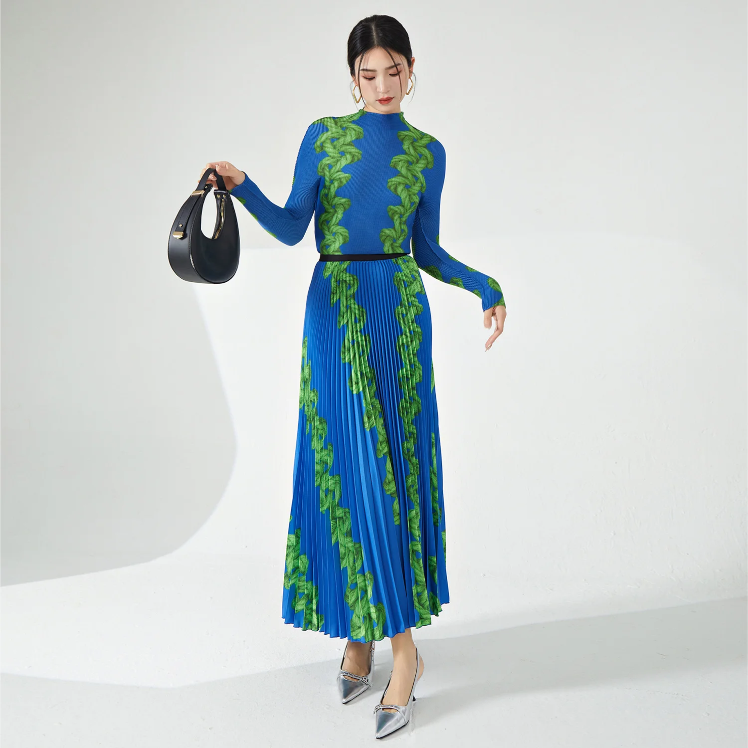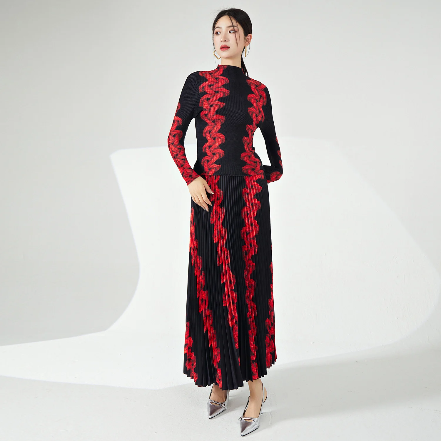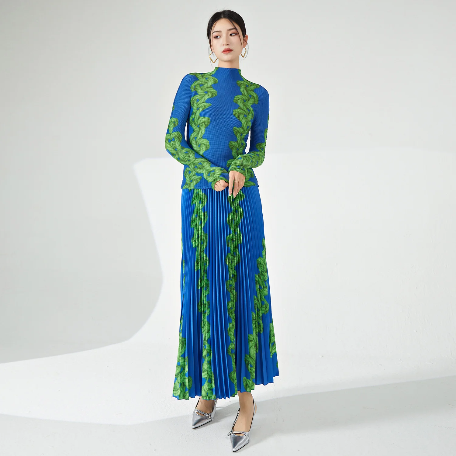 2025 Latest Summer Fashion Miyake Pleated Women's Two-Piece Set Stretch Printed Top and Ankle Length Skirt