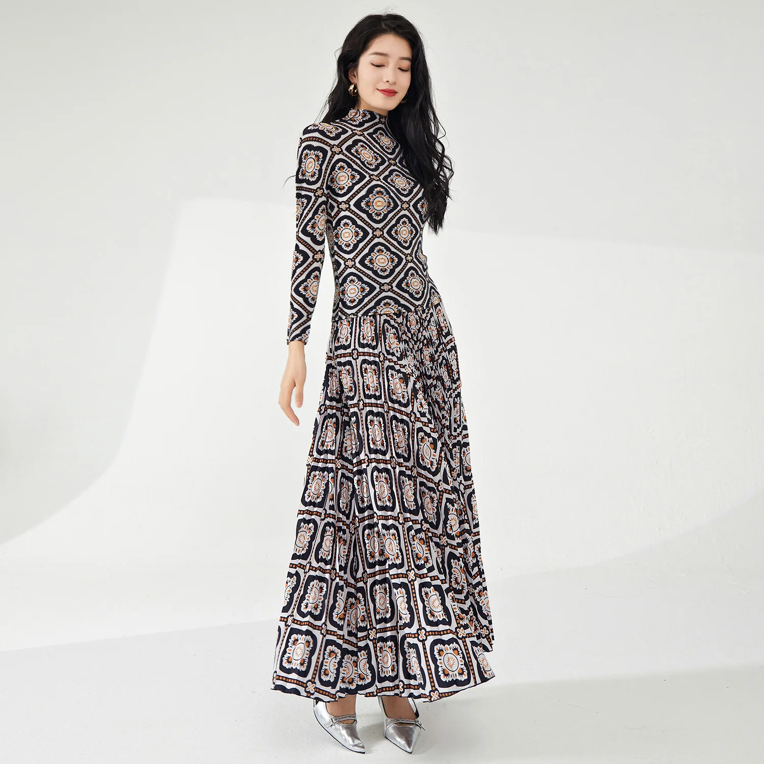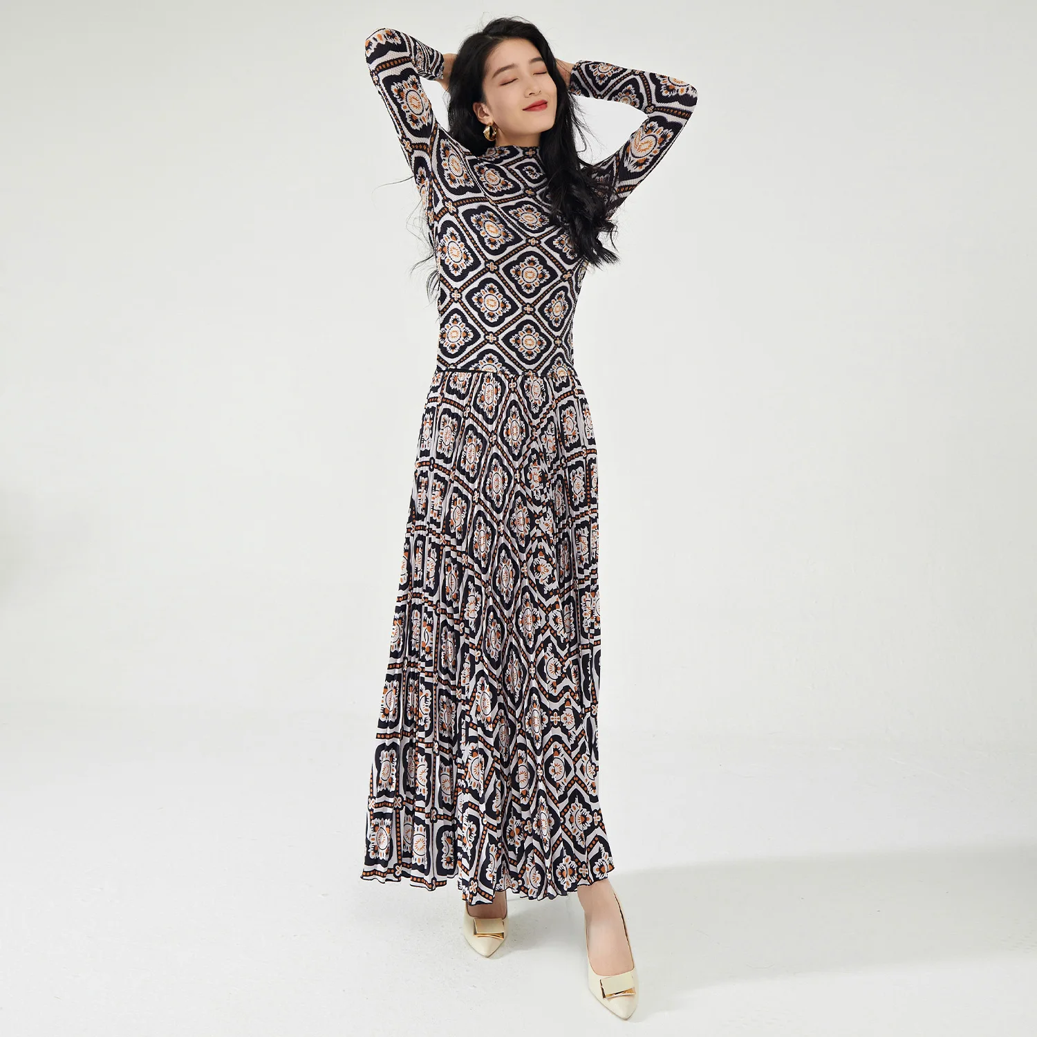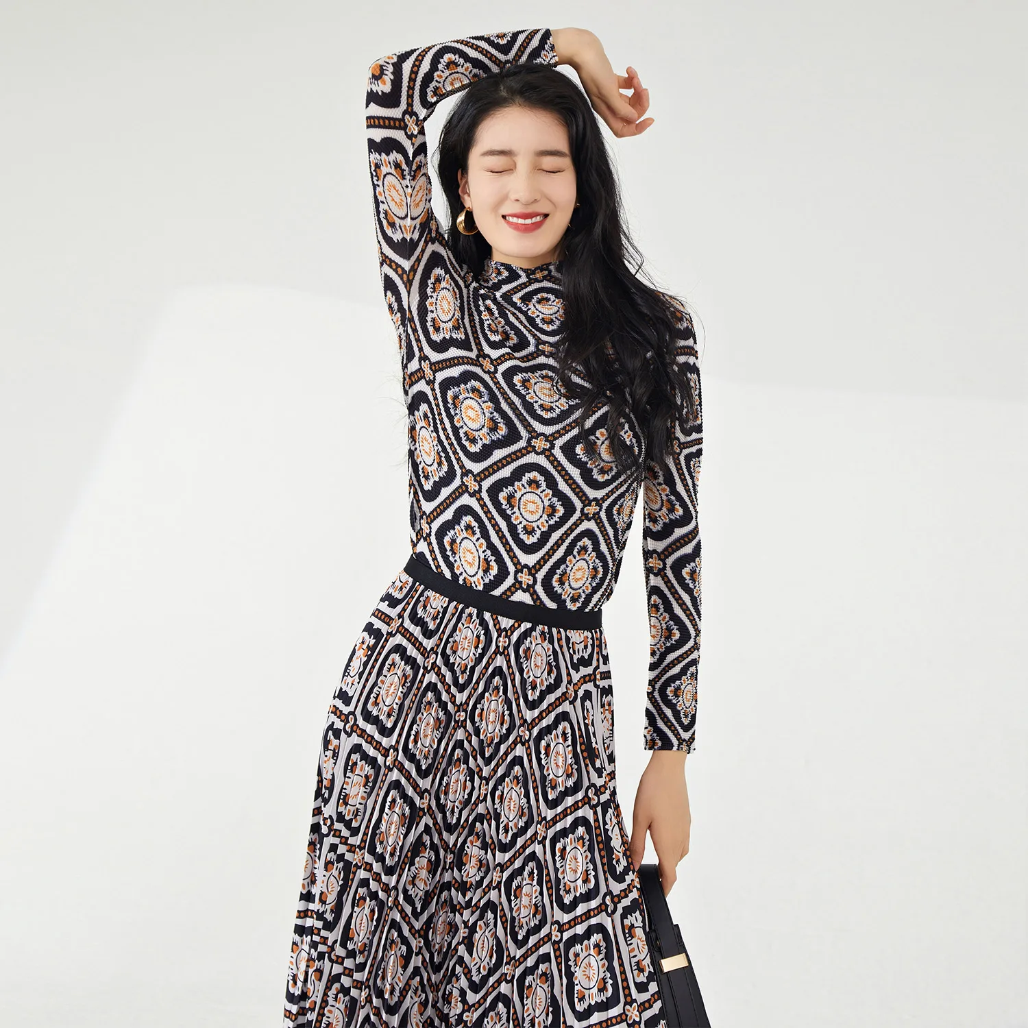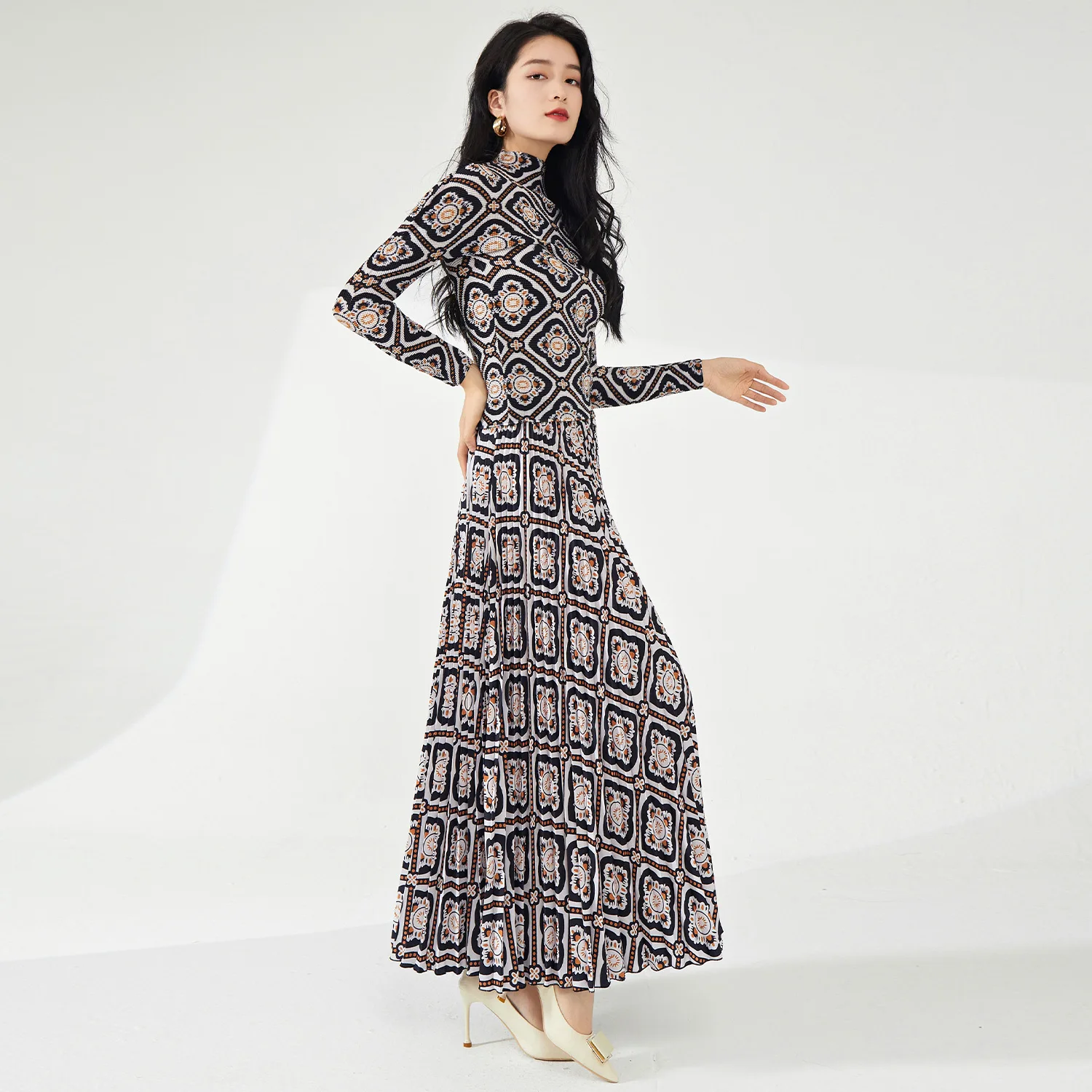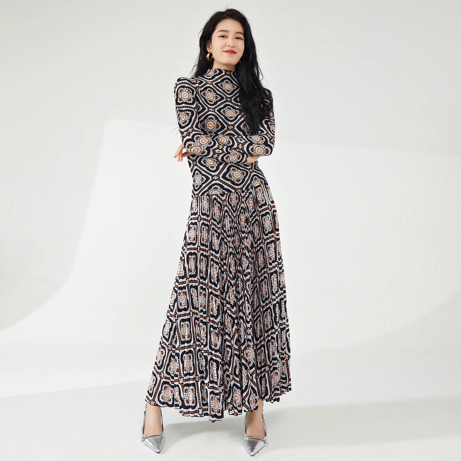 Miyake Women's Summer Casual Two-Piece Set Fashionable Elastic Printed Top A-Line Skirt Turtleneck Polyester Floral Pattern