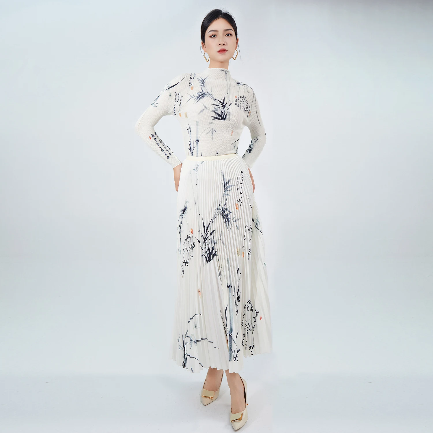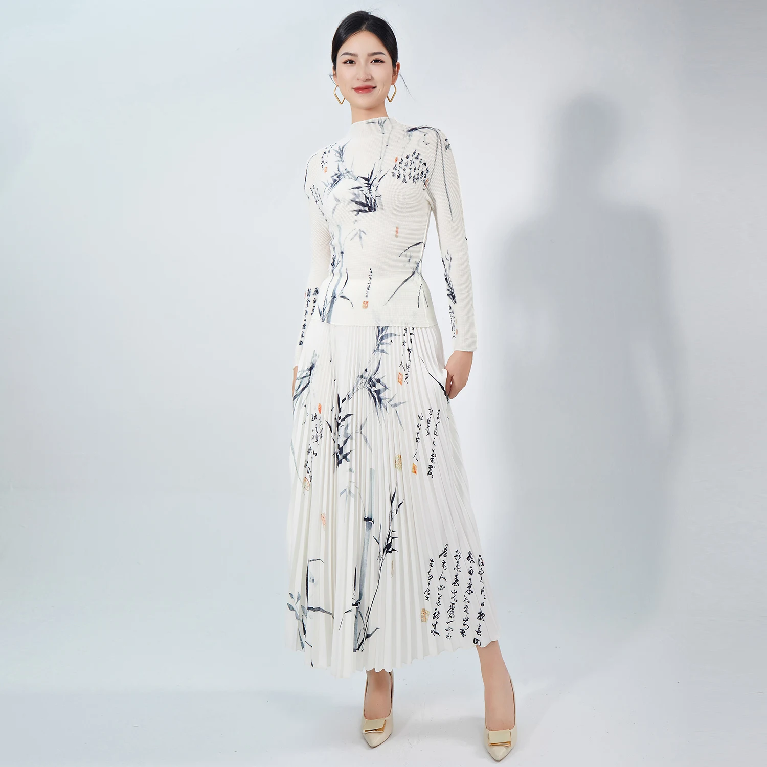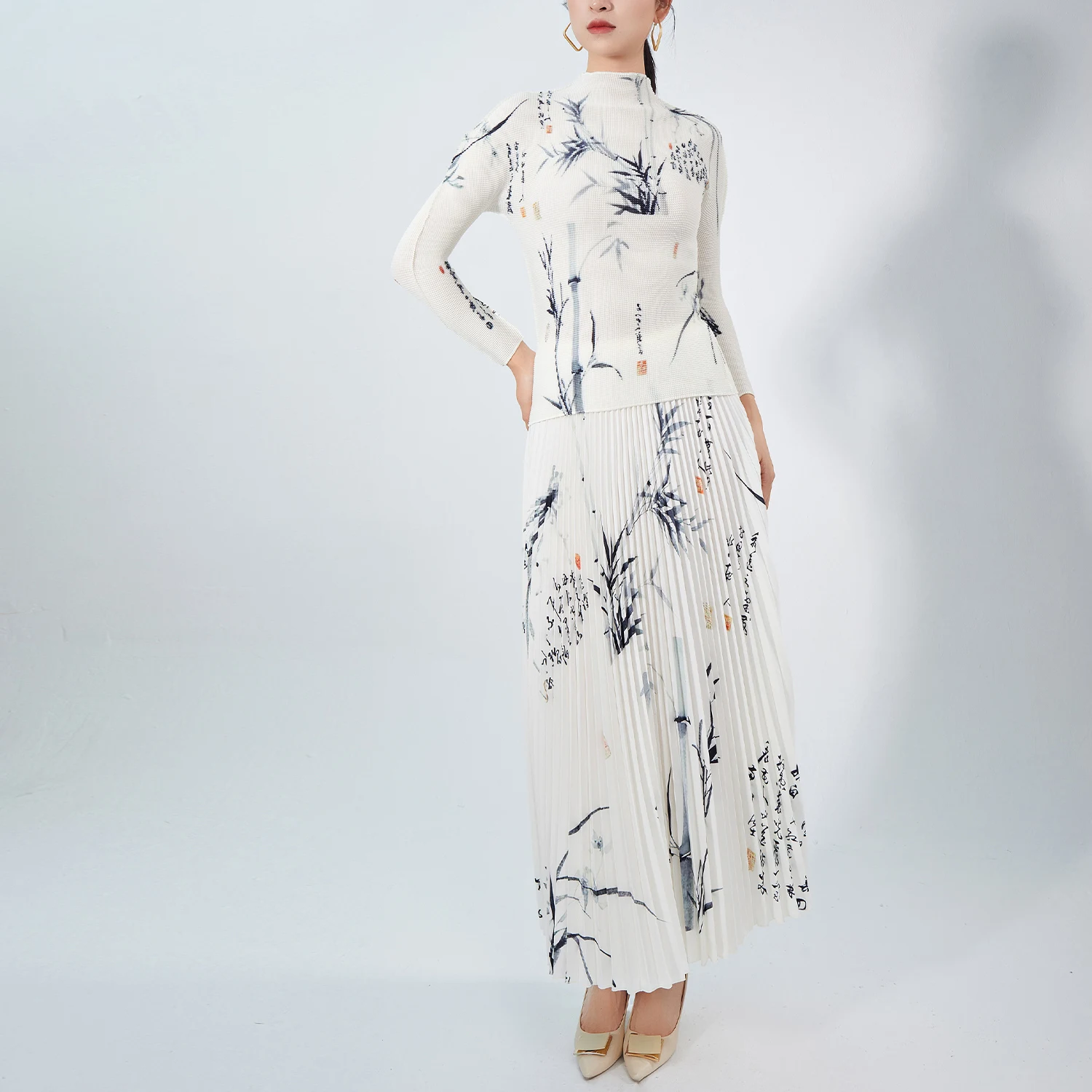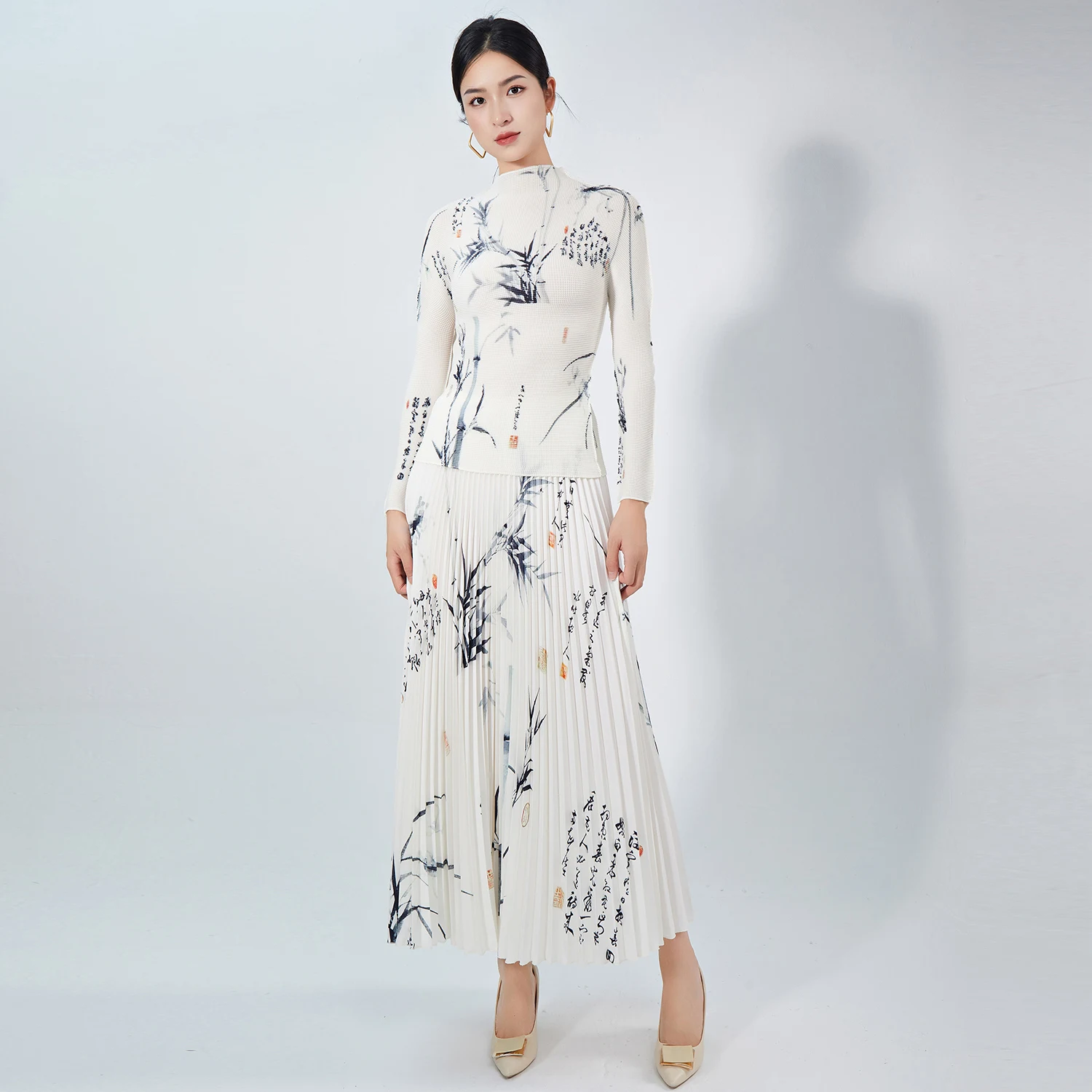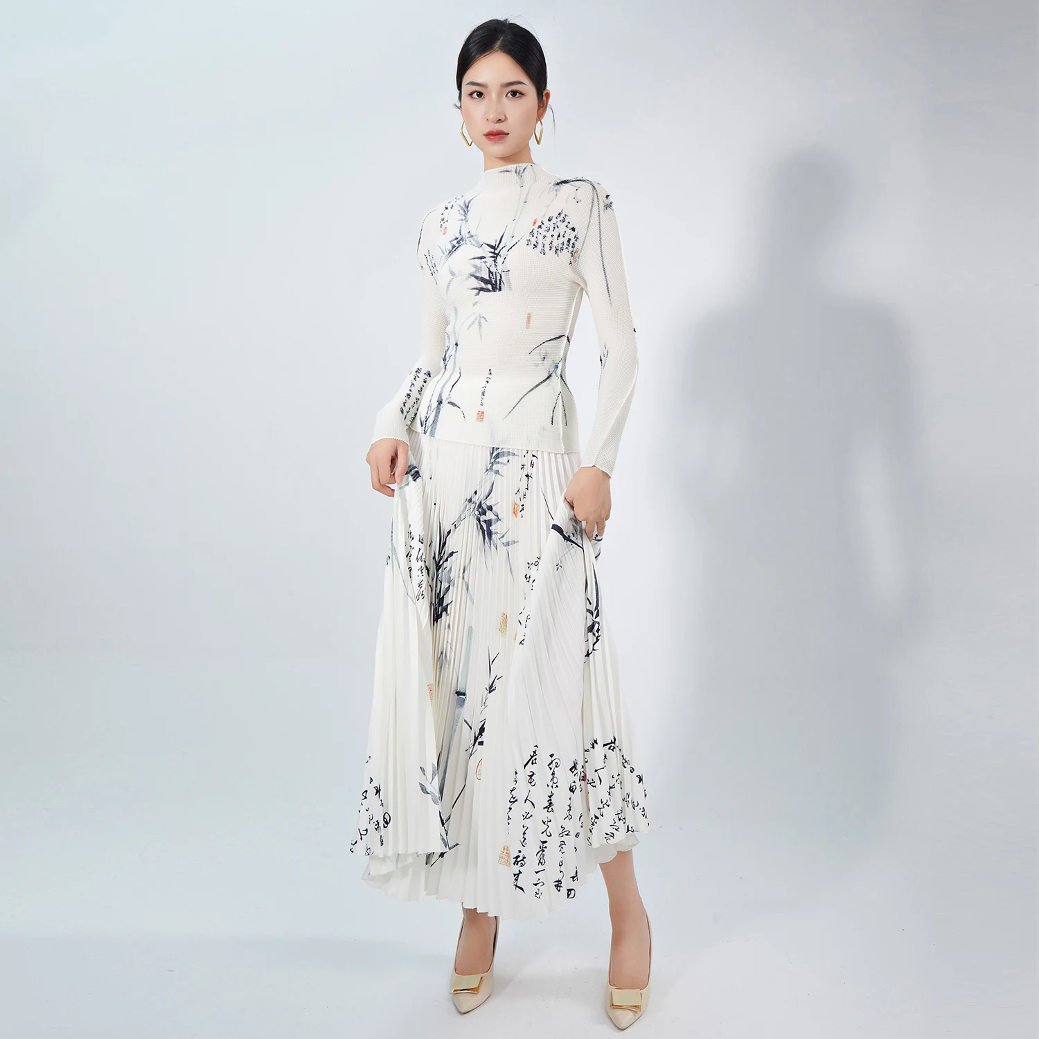 High Quality Women's Casual Two-Piece Set Unique Floral Printed Stretch Top and A-Line Skirt Pleated Fashion Set