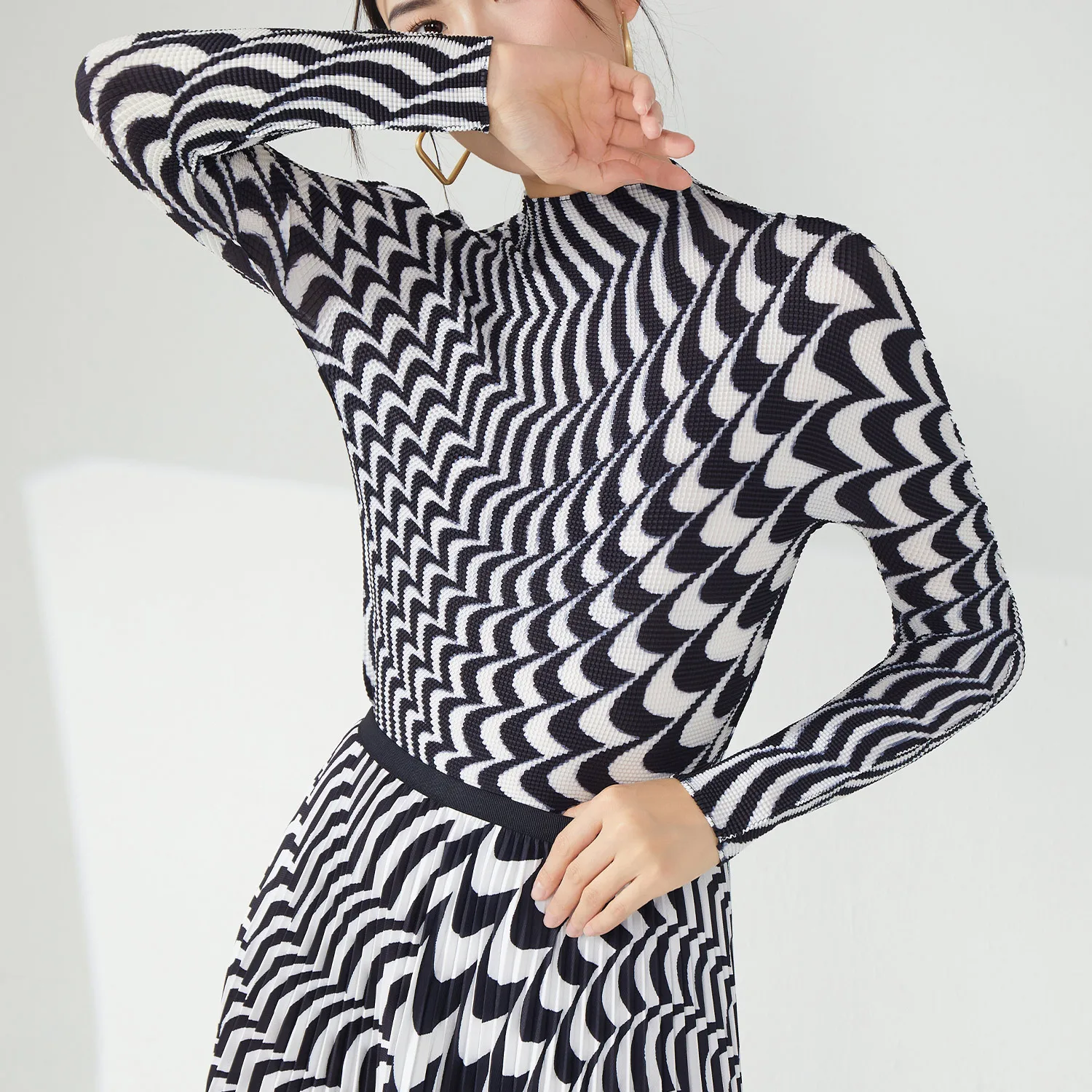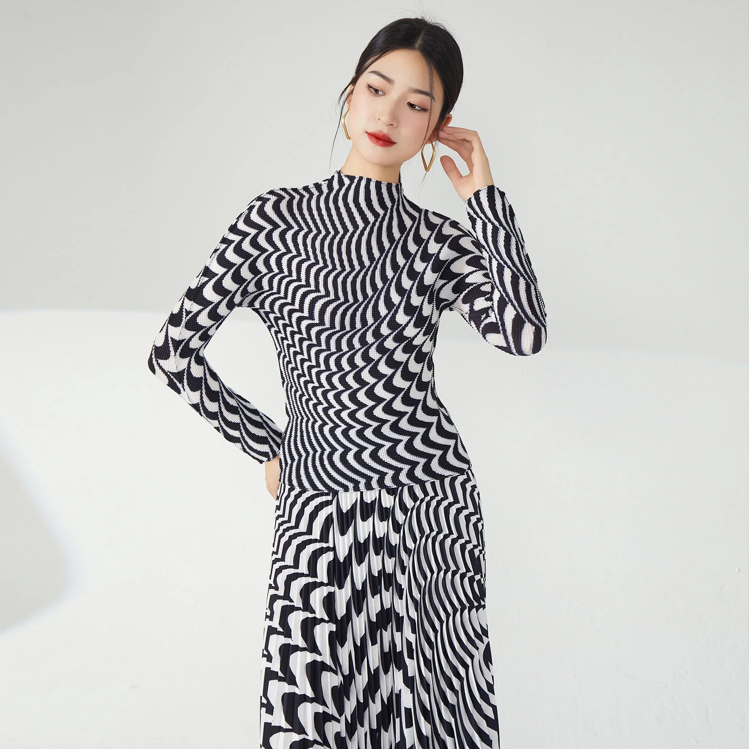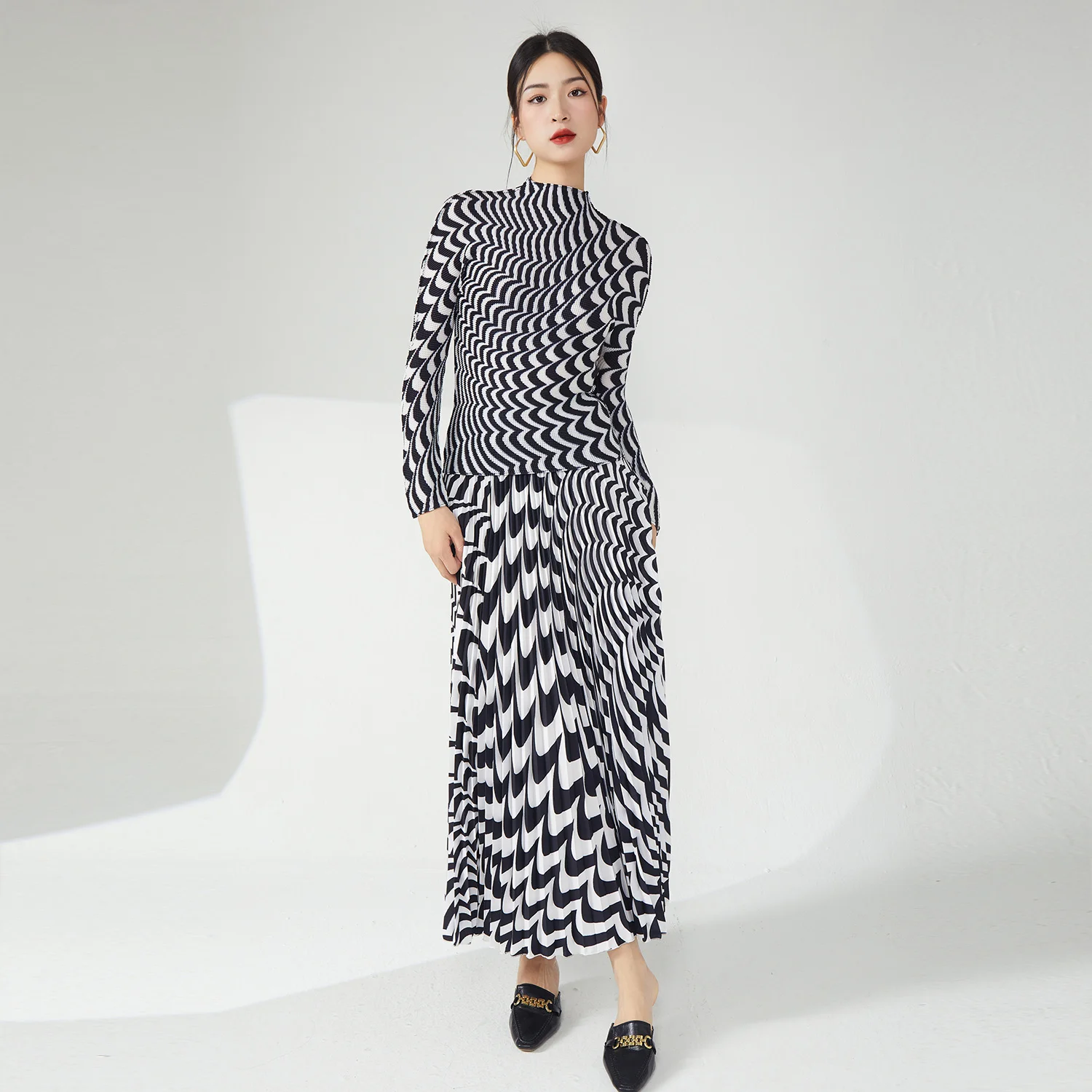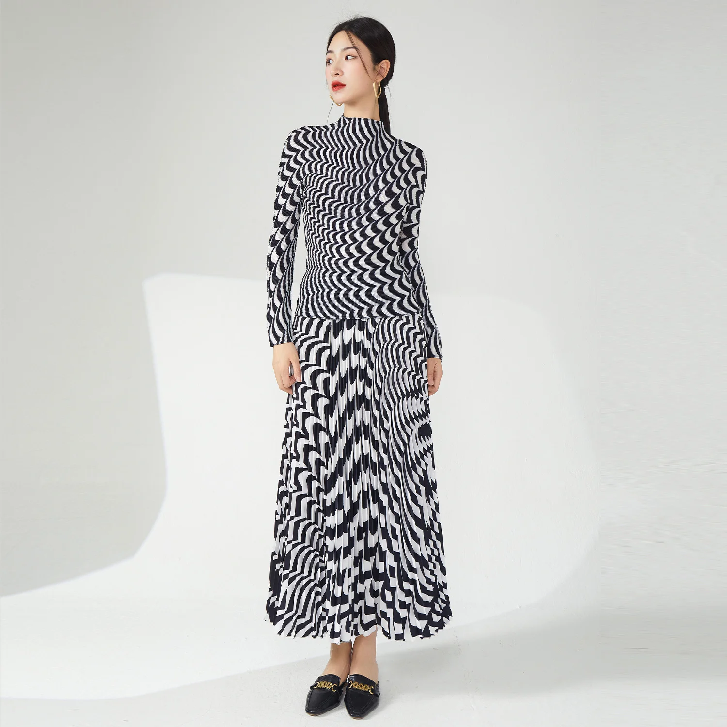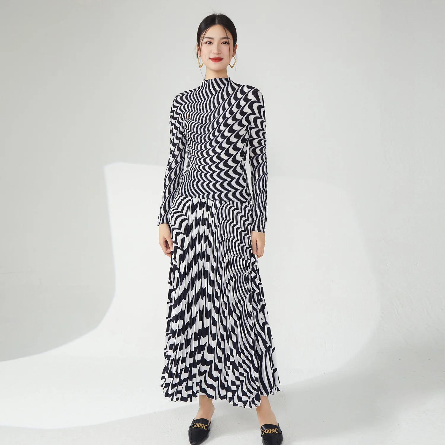 Miyake Women's Pleated Casual Style Two Piece Set Skirt and Stretch Top Made of Polyester Fabric Special Printed Skirt
