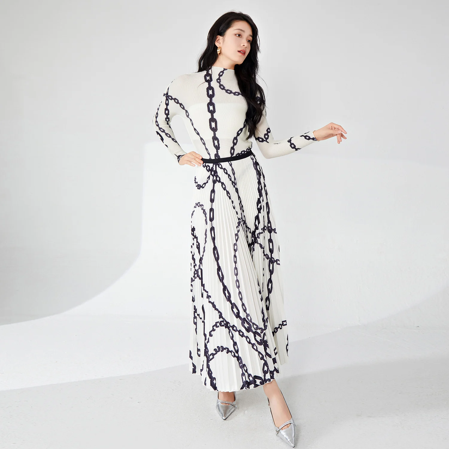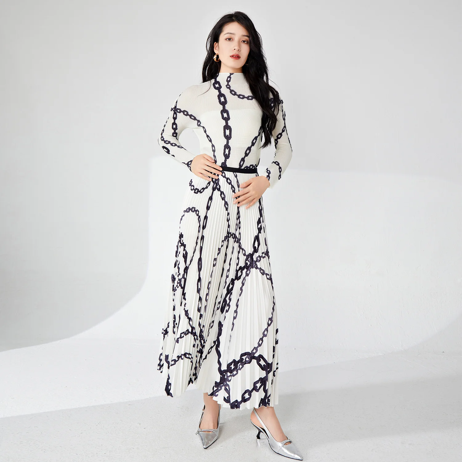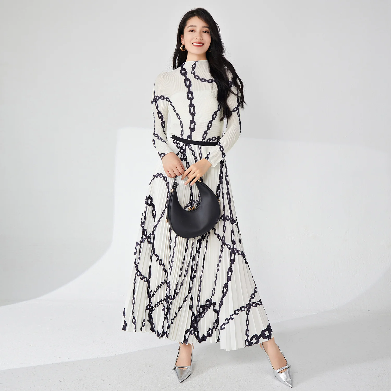 Women's Pleated Fashion Set Loose and Casual Style Stretch Printed Long-Sleeved Top and A-Line Skirt Two-Piece Set