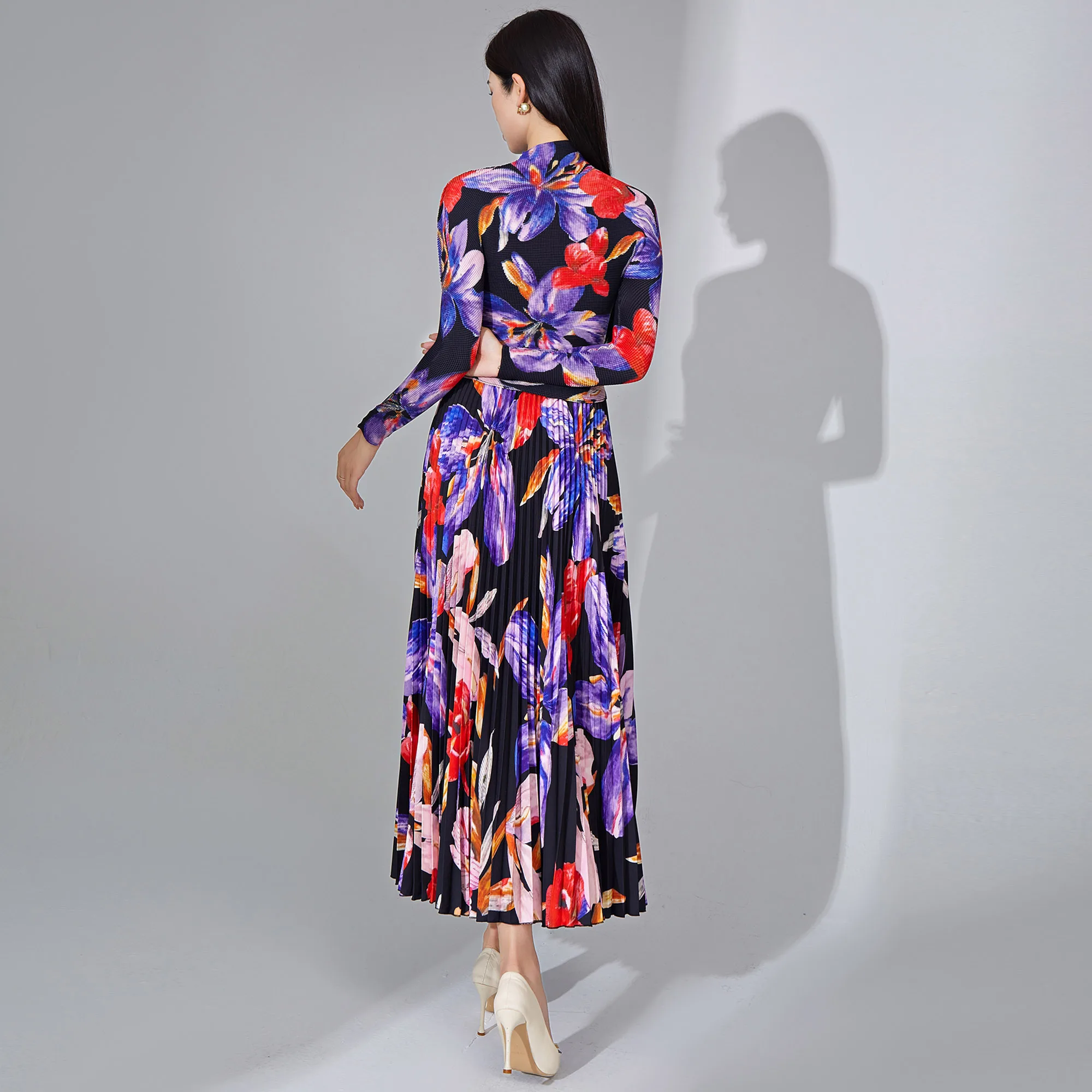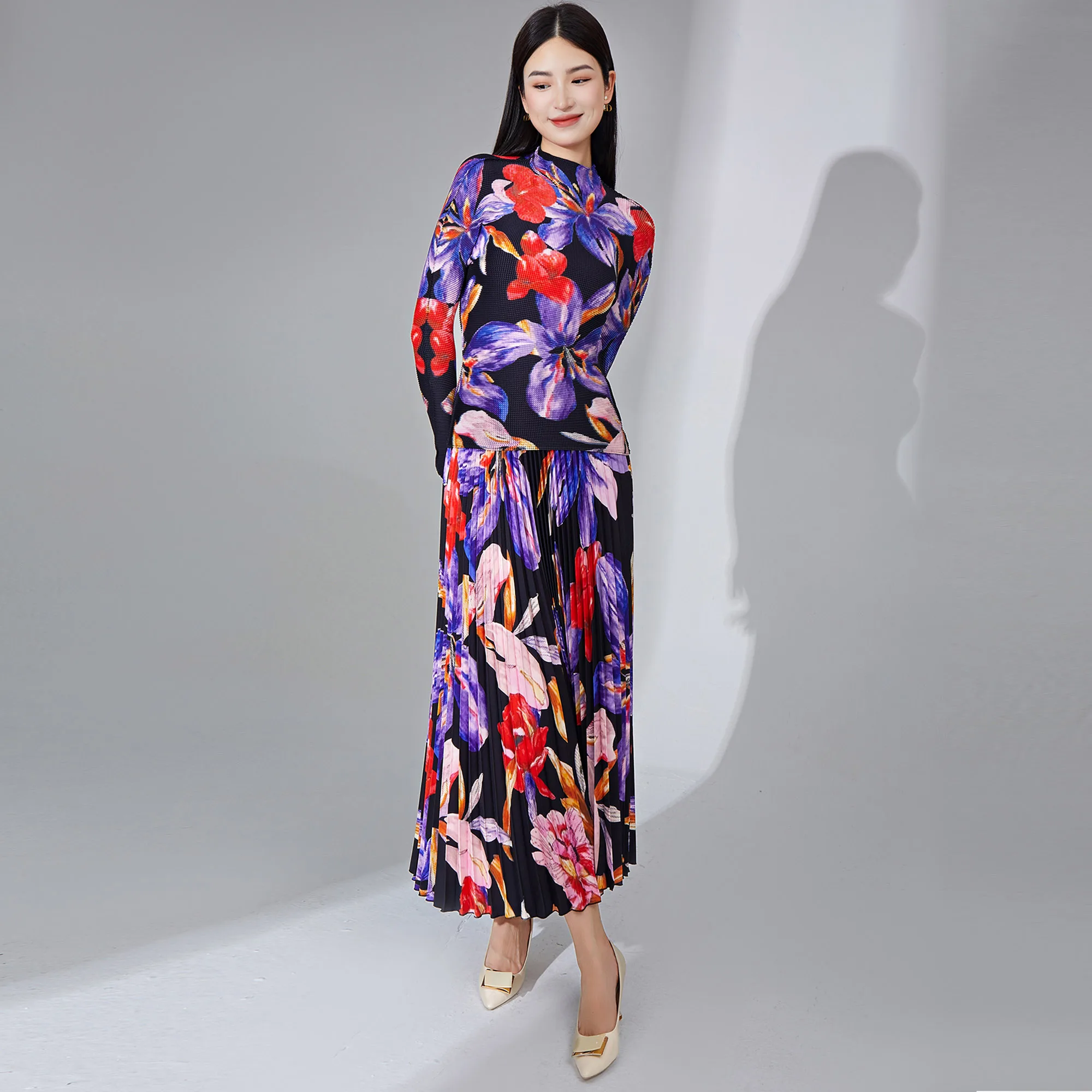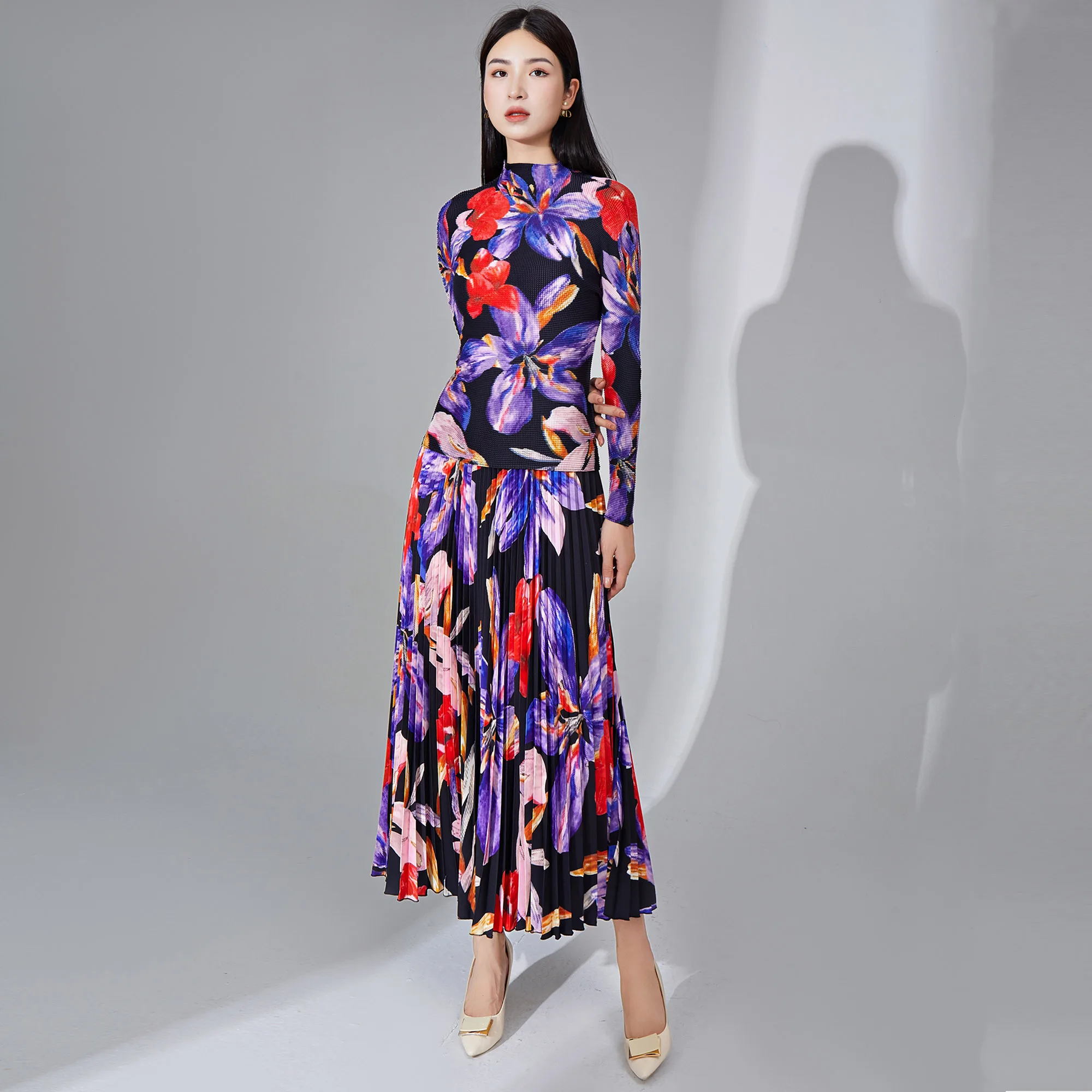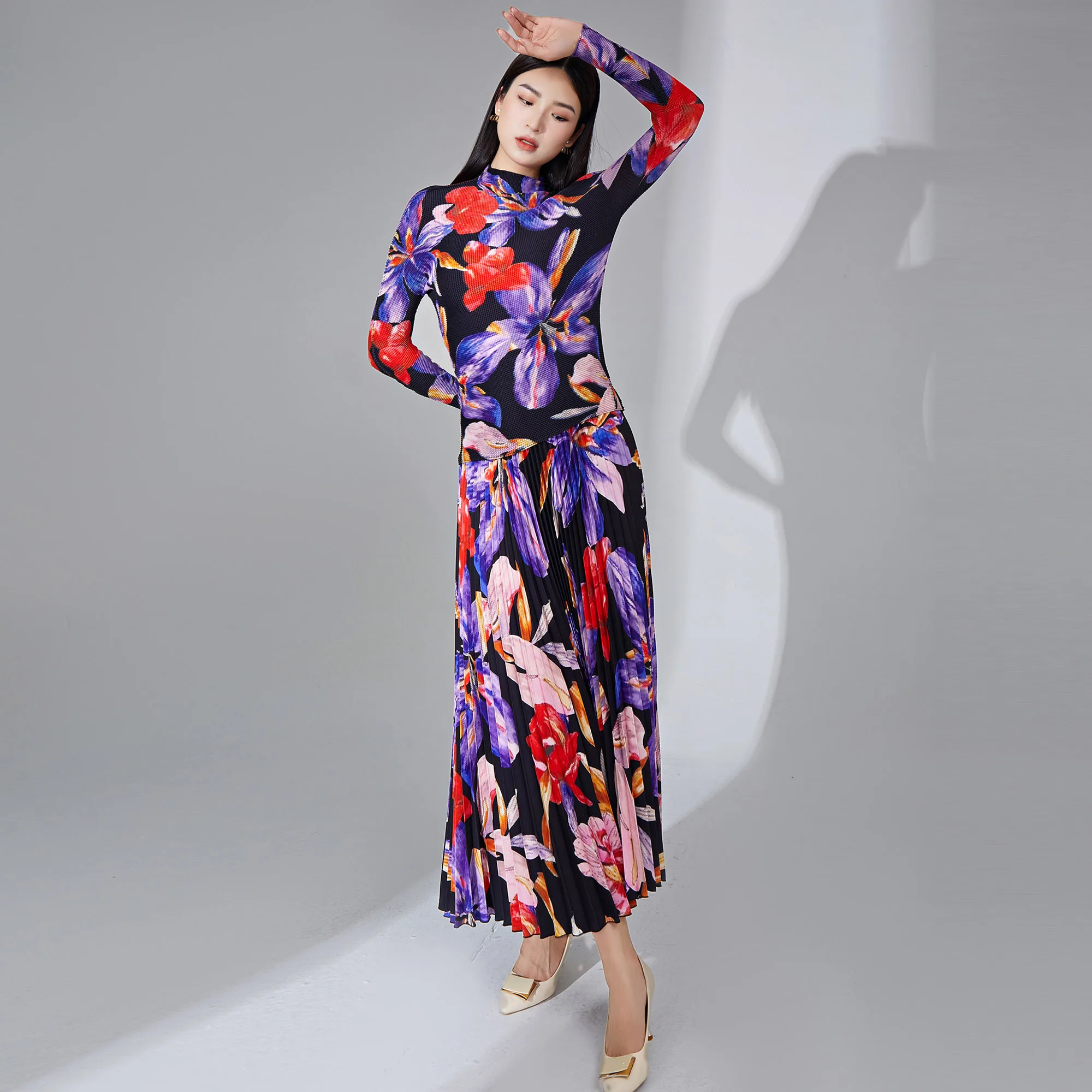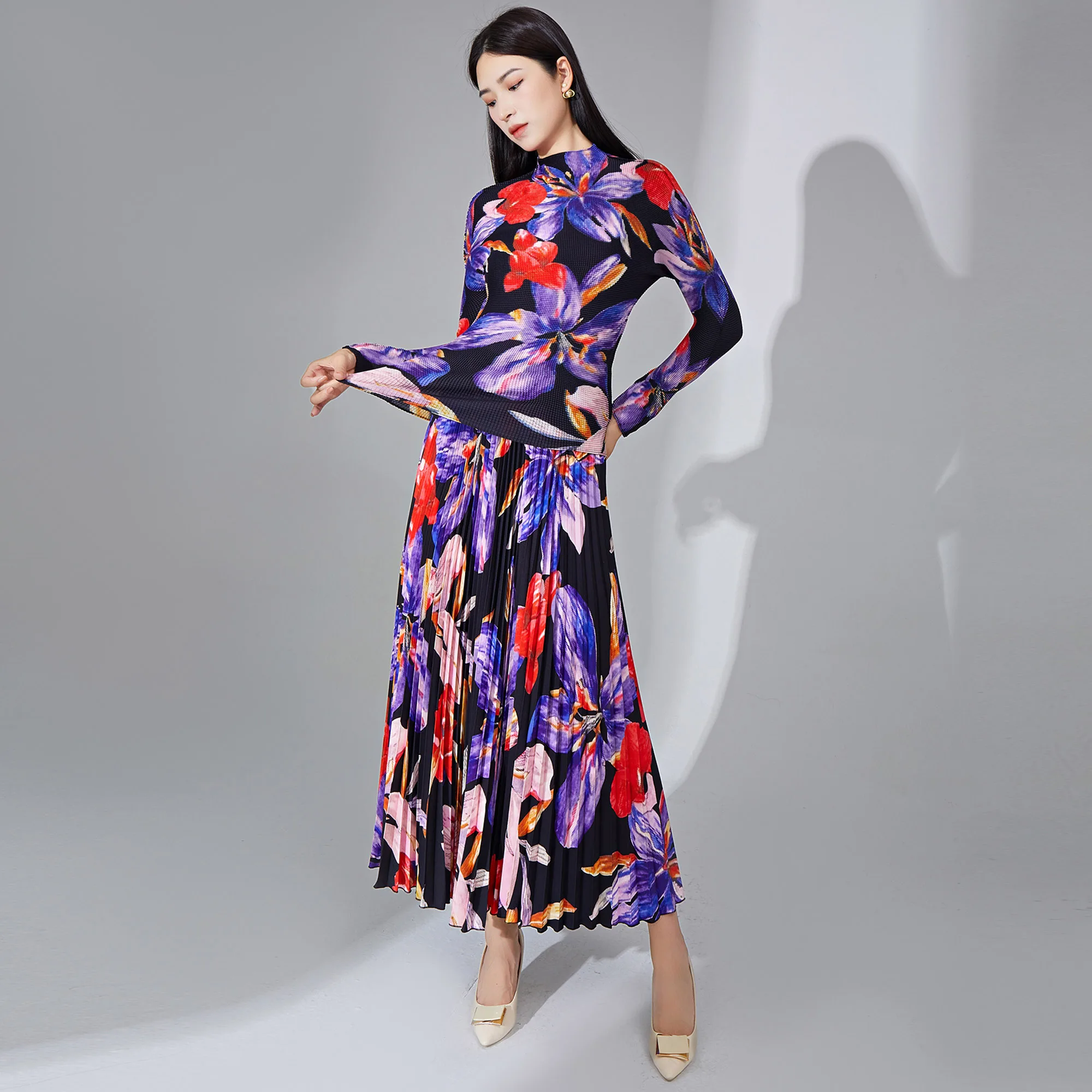 2025 Miyake Pleated Two Piece Set Women Clothing Print Elastic Stretch Long Sleeve Top and Pleated Long Skirt Set